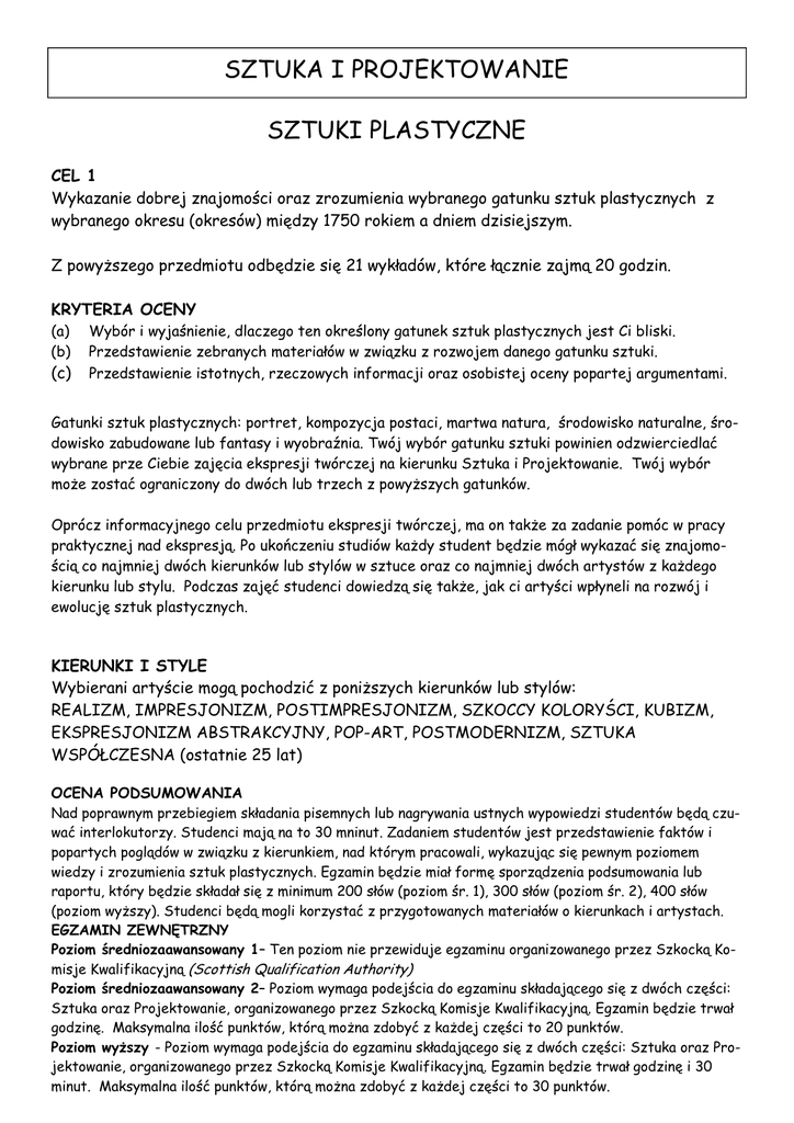 SZTUKA I PROJEKTOWANIE SZTUKI PLASTYCZNE CEL 1 Wykazanie dobrej znajomości oraz zrozumienia wybranego gatunku sztuk plastycznych z wybranego okresu (okresów) między 1750 rokiem a dniem dzisiejszym. Z powyższego przedmiotu odbędzie się 21 wykładów, które łącznie zajmą 20 godzin. KRYTERIA OCENY (a) (b) Wybór i wyjaśnienie, dlaczego ten określony gatunek sztuk plastycznych jest Ci bliski. Przedstawienie zebranych materiałów w związku z rozwojem danego gatunku sztuki. (c) Przedstawienie istotnych, rzeczowych informacji oraz osobistej oceny popartej argumentami. Gatunki sztuk plastycznych: portret, kompozycja postaci, martwa natura, środowisko naturalne, środowisko zabudowane lub fantasy i wyobraźnia. Twój wybór gatunku sztuki powinien odzwierciedlać wybrane prze Ciebie zajęcia ekspresji twórczej na kierunku Sztuka i Projektowanie. Twój wybór może zostać ograniczony do dwóch lub trzech z powyższych gatunków. Oprócz informacyjnego celu przedmiotu ekspresji twórczej, ma on także za zadanie pomóc w pracy praktycznej nad ekspresją. Po ukończeniu studiów każdy student będzie mógł wykazać się znajomością co najmniej dwóch kierunków lub stylów w sztuce oraz co najmniej dwóch artystów z każdego kierunku lub stylu. Podczas zajęć studenci dowiedzą się także, jak ci artyści wpłyneli na rozwój i ewolucję sztuk plastycznych. KIERUNKI I STYLE Wybierani artyście mogą pochodzić z poniższych kierunków lub stylów: REALIZM, IMPRESJONIZM, POSTIMPRESJONIZM, SZKOCCY KOLORYŚCI, KUBIZM, EKSPRESJONIZM ABSTRAKCYJNY, POP-ART, POSTMODERNIZM, SZTUKA WSPÓŁCZESNA (ostatnie 25 lat) OCENA PODSUMOWANIA Nad poprawnym przebiegiem składania pisemnych lub nagrywania ustnych wypowiedzi studentów będą czuwać interlokutorzy. Studenci mają na to 30 mninut. Zadaniem studentów jest przedstawienie faktów i popartych poglądów w związku z kierunkiem, nad którym pracowali, wykazując się pewnym poziomem wiedzy i zrozumienia sztuk plastycznych. Egzamin będzie miał formę sporządzenia podsumowania lub raportu, który będzie składał się z minimum 200 słów (poziom śr. 1), 300 słów (poziom śr. 2), 400 słów (poziom wyższy). Studenci będą mogli korzystać z przygotowanych materiałów o kierunkach i artystach. EGZAMIN ZEWNĘTRZNY Poziom średniozaawansowany 1– Ten poziom nie przewiduje egzaminu organizowanego przez Szkocką Komisje Kwalifikacyjną (Scottish Qualification Authority) Poziom średniozaawansowany 2– Poziom wymaga podejścia do egzaminu składającego się z dwóch części: Sztuka oraz Projektowanie, organizowanego przez Szkocką Komisje Kwalifikacyjną. Egzamin będzie trwał godzinę. Maksymalna ilość punktów, którą można zdobyć z każdej części to 20 punktów. Poziom wyższy - Poziom wymaga podejścia do egzaminu składającego się z dwóch części: Sztuka oraz Projektowanie, organizowanego przez Szkocką Komisje Kwalifikacyjną. Egzamin będzie trwał godzinę i 30 minut. Maksymalna ilość punktów, którą można zdobyć z każdej części to 30 punktów. JAK WYGLĄDAJĄ ZAJĘCIA ZE SZTUKI? Poniżej znajduje się przykład, jak mogą wyglądać zajęcia ze sztuki. W poniższym przykładzie student wybrał przygotowanie materiału o szkockich artystach malujących martwą przyrodę. Student badał dzieła S.J. Peploe, szkockiego kolorysty, rozszerzając swoje badania do szkockich artystów reprezentujących sztukę współczesną. Ten sam student mógł przygotować materiał z poniższych kierunków lub stylów w sztuce: 1. Szkoccy koloryści (S.J. Peploe, G.L. Hunter, F.C.B. Cadell, J.D. Ferguson) 2. Cezanne, który wpłynał na Peploe. 3. Kubizm i Fowizm. Peploe był świadomy o istnieniu tych kierunków. Miały one także wpływ na jego malarstwo. 4. Współczesne malarstwo szkockie. PISANIE PODSUMOWAŃ Poniższy schemat kontrukcji wypowiedzi może pomóc Ci w pisaniu podsumowania. • Przedstawienie gatunku artystycznego, którym się zajmujesz (np. portret, martwa • • • • • • • • • natura) oraz artystów lub kierunku, na którym Twoja uwaga będzie poświęcona. Podanie powodów Twego wyboru. Podanie podstawowych informacji o wybranych artystach lub kierunkach. Podanie dzieł sztuki, którymi się zajmowałeś. Podanie powódów Twego wyboru. Przedstawienie elementów wizualnych użytych w np. obrazach, rzeźbach, które postanowiłeś zbadać. Przedstawienie powodów, które myślisz spowodowały, że artyści wykorzystali te elementy wizualne w tworzeniu ich dzieł. Przedstawienie nastrojów lub uczuć wywołanych użyciem tych elemtów w dziele. Opisanie, w jaki sposób zostało to osiągnięte. Przedstawienie osobistych poglądów o dziele sztuki. Podając osobiste opinie możesz wyrazić,: • czy podoba Ci się te dzieło lub nie. • jakie uczucia wywowuje w Tobie dzieło. • czy artysta użył elementów wizualnych z dobrym skutkiem. • jak wybrany przez Ciebie artysta lub kierunek mógł wpłynąć na artystów lub kierunki, które pojawiły się po nich oraz co do nich wniósł. • w przypadku artystów reprezentujących sztukę współczesną, co mogło na nich mieć wpływ. PAMIĘTAJ O PODANIU POWODÓW, POPIERAJĄCYCH OSOBISTE MYŚLI I OPINIE SZTUKA I PROJEKTOWANIE PROJEKTOWANIE CEL 1 Wykazanie dobrej znajomości oraz zrozumienia wybranej dziedziny projektowania z wybranego okresu (okresów) między 1750 rokiem a dniem dzisiejszym. Z powyższego przedmiotu odbędzie się 21 wykładów, które łącznie zajmą 20 godzin. KRYTERIA OCENY (a) (b) (c) Wybór i wyjaśnienie dlaczego ta określona dziedzina projektowania jest Ci bliska. Przedstawienie zebranych materiałów w związku z rozwojem danej dziedziny projektowania. Przedstawienie istotnych, rzeczowych informacji oraz osobistej oceny popartej argumentami. Wybór dziedzin projektowania: projektowanie graficzne, projektowanie produktów, projektowanie wnętrz, aspekty środowiskowe w projektowaniu / architektura, projektowa