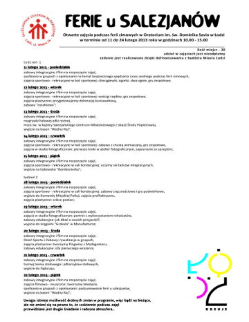 FERIE u SALEZJANÓW Otwarte zajęcia podczas ferii zimowych w Oratorium im. św. Dominika Savio w Łodzi w terminie od 11 do 24 lutego 2013 roku w godzinach 10.00 - 15.00 ________________________________________________________________________ ilość miejsc - 30 udział w zajęciach jest nieodpłatny zadanie jest realizowane dzięki dofinansowaniu z budżetu Miasta Łodzi t yd z i e ń 1 11 lutego 2013 - poniedziałek zabawy integracyjne i film na rozpoczęcie zajęć, spotkania w grupach z opiekunami na temat bezpiecznego spędzania czasu wolnego podczas ferii zimowych, zajęcia sportowo - rekreacyjne w hali sportowej: chorągiewki, ogonki, dwa ognie, gry zespołowe; 12 lutego 2013 - wtorek zabawy integracyjne i film na rozpoczęcie zajęć, zajęcia sportowo - rekreacyjne w hali sportowej: wyścigi rzędów, gry zespołowe, zajęcia plastyczne: przygotowujemy dekorację karnawałową, zabawa "ostatkowa"; 13 lutego 2013 - środa zabawy integracyjne i film na rozpoczęcie zajęć, rozgrywki halowej piłki nożnej, msza św. w kaplicy Salezjańskiego Centrum Młodzieżowego z okazji Środy Popielcowej, wyjście na basen "Wodny Raj"; 14 lutego 2013 - czwartek zabawy integracyjne i film na rozpoczęcie zajęć, zajęcia sportowo - rekreacyjne w hali sportowej: zabawy z chustą animacyjną, gry zespołowe, zajęcia w studio fotograficznym: pierwsze kroki w atelier fotograficznym, zapoznanie ze sprzętem; 15 lutego 2013 - piątek zabawy integracyjne i film na rozpoczęcie zajęć, zajęcia sportowo - rekreacyjne w sali kondycyjnej: uczymy sie tańców integracyjnych, wyjście na lodowisko "Bombonierka"; tydzień 2 18 lutego 2013 - poniedziałek zabawy integracyjne i film na rozpoczęcie zajęć, zajęcia sportowo - rekreacyjne w sali kondycyjnej: zabawy zręcznościowe i gry podwórkowe, wyjście do Komendy Miejskiej Policji, zajęcia profilaktyczne, zajęcia plastyczne: szkice postaci; 19 lutego 2013 - wtorek zabawy integracyjne i film na rozpoczęcie zajęć, zajęcia w studio fotograficznym: portret z wykorzystaniem rekwizytów, zabawy edukacyjne: jak dbać o swoich przyjaciół?, wyjście do kręgielni "Grakula" w Manufakturze; 20 lutego 2013 - środa zabawy integracyjne i film na rozpoczęcie zajęć, Dzień Sportu i Zabawy: rywalizacja w grupach, zajęcia plastyczne: tworzymy Pingwiny z Madagaskaru; zabawy edukacyjne: siła pierwszego wrażenia; 21 lutego 2013 - czwartek zabawy integracyjne i film na rozpoczęcie zajęć, turniej tenisa stołowego i piłkarzyków stołowych, wyjście do Figloraju; 22 lutego 2013 - piątek zabawy integracyjne i film na rozpoczęcie zajęć, zajęcia filmowo - muzyczne: tworzymy teledyski, spotkania w grupach z opiekunami: podsumowanie ferii u salezjanów, wyjście na basen "Wodny Raj"; Uwaga: istnieje możliwość drobnych zmian w programie, więc bądź na bieżąco, ale nie zmieni się na pewno to, że codziennie podczas zajęć przewidziane jest drugie śniadanie i radosna atmosfera...