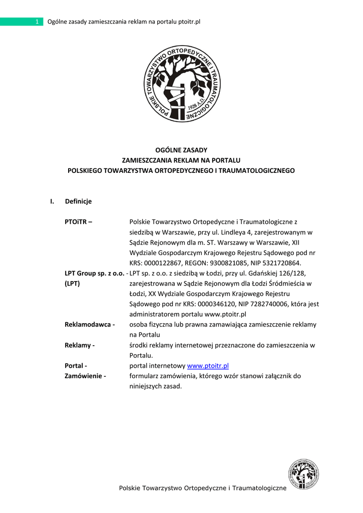 1 Ogólne zasady zamieszczania reklam na portalu ptoitr.pl OGÓLNE ZASADY ZAMIESZCZANIA REKLAM NA PORTALU POLSKIEGO TOWARZYSTWA ORTOPEDYCZNEGO I TRAUMATOLOGICZNEGO I. Definicje PTOiTR – Polskie Towarzystwo Ortopedyczne i Traumatologiczne z siedzibą w Warszawie, przy ul. Lindleya 4, zarejestrowanym w Sądzie Rejonowym dla m. ST. Warszawy w Warszawie, XII Wydziale Gospodarczym Krajowego Rejestru Sądowego pod nr KRS: 0000122867, REGON: 9300821085, NIP 5321720864. LPT Group sp. z o.o. - LPT sp. z o.o. z siedzibą w Łodzi, przy ul. Gdańskiej 126/128, (LPT) zarejestrowana w Sądzie Rejonowym dla Łodzi Śródmieścia w Łodzi, XX Wydziale Gospodarczym Krajowego Rejestru Sądowego pod nr KRS: 0000346120, NIP 7282740006, która jest administratorem portalu www.ptoitr.pl Reklamodawca osoba fizyczna lub prawna zamawiająca zamieszczenie reklamy na Portalu Reklamy środki reklamy internetowej przeznaczone do zamieszczenia w Portalu. Portal portal internetowy www.ptoitr.pl Zamówienie formularz zamówienia, którego wzór stanowi załącznik do niniejszych zasad. Polskie Towarzystwo Ortopedyczne i Traumatologiczne 2 Ogólne zasady zamieszczania reklam na portalu ptoitr.pl II. Warunki Realizacji 1. 2. 3. 4. 5. 6. 7. 8. Reklamy zamieszczane zostają na podstawie złożonego Zamówienia, które określa szczegółowe warunki jego realizacji. Realizacja usług odbywa się w oparciu o niniejsze zasady oraz obowiązujące przepisy prawa. Zamówienie musi być dostarczone do LPT nie później niż na 7 dni roboczych przed planowanym zamieszczeniem Reklamy na Portalu. Podpisane Zamówienie można przesłać w formie elektronicznej na adres [email protected] Przyjęcie Zamówienia musi zostać zwrotnie potwierdzone przez LPT. Złożenie Zamówienia jest równoznaczne z zawarciem umowy o zamieszczenie Reklamy na Portalu, z tym że Zamówienie może zostać przez reklamodawcę wycofane na następujących warunkach: a. Wycofanie Zamówienia nie powoduje konsekwencji finansowych dla Reklamodawcy, jeżeli nastąpi nie później niż w terminie 7 dni roboczych przed planowaną datą jego realizacji. b. W przypadku gdy wycofanie ma miejsce po terminie, o którym mowa jest w pkt. 5a powyżej LPT jest uprawnione do obciążenia Reklamodawcy kwotą w wysokości 50 % wartości Zamówienia. c. Rezygnacja z Zamówienia musi być dokonana na piśmie (mailem) w terminach podanych powyżej, pod rygorem nieważności. Reklama w formie gotowej do zamieszczenia powinna zostać dostarczona LPT najpóźniej na 3 dni robocze przed planowanym zamieszczeniem Reklamy na Portalu. Reklama powinna spełniać następujące parametry techniczne: - Banner do wydarzenia Format: 600x400 px i 300x335 px Rodzaj pliku: .jpg, .png - Banner statyczny na stronie głównej Format: 940x392 Rodzaj pliku: .jpg, .png - Banner do artykułu sponsorowanego Format: 600x400 px i 300x335 px Rodzaj pliku: .jpg, .png Niedotrzymanie w/w terminów dostarczenia Zamówienia bądź Reklamy oraz wszelkie inne uchybienia formalne Zamówienia zwalniają LPT z obowiązku jego realizacji oraz ewentualnej odpowiedzialności, jaka mogłaby powstać z tego tytułu. Polskie Towarzystwo Ortopedyczne i Traumatologiczne 3 Ogólne zasady zamieszczania reklam na portalu ptoitr.pl 9. III. Niedostarczenie gotowej Reklamy w terminie wskazanym w pkt. 6 powyżej traktowane będzie jako rezygnacja z Zamówienia z konsekwencjami określonymi w pkt. 8 powyżej. Płatności 1. Koszt zamieszczenia Reklamy na Portalu jest zależny od wybranej formy Reklamy i okresu publikacji: I. Pakiet Full – zamieszczenie pełnej informacji o wydarzeniu (grafika, nazwa wydarzenia, miejsce, data, opis wydarzenia, organizatorzy, link do rejestracji) a. 1 miesiąc emisji - 499 zł zł netto plus podatek VAT b. 3 miesiące emisji - 799 zł netto plus podatek VAT c. 6 miesięcy emisji i więcej - 999 zł netto plus podatek VAT W cenie promocja wydarzenia w newsletterze*, możliwość opublikowania notatki prasowej z wydarzenia i galerii zdjęć. Zamawiający dostarcza treść do artykułu. * Mailing graficzny rozsyłany do zarejestrowanych użytkowników, dociera bezpośrednio do skrzynek prenumeratorów serwisu. II. Przygotowanie dedykowanej grafiki do wydarzenia – 199 zł netto plus podatek VAT. Zamawiający dostarcza treści. Redakcja serwisu zastrzega sobie prawo do autoryzacji grafiki. III. Pakiet Basic – zamieszczenie podstawowej informacji o wydarzeniu (grafika, nazwa wydarzenia, miejsce i data) a. 1 miesiąc emisji – 99 zł netto plus podatek VAT Istnieje możliwość przedłużania emisji co 30 dni. W cenie możliwość opublikowania notatki prasowej z wydarzenia i galerii zdjęć. Zamawiający dostarcza treść do artykułu. IV. Banner wyświetlany przez jeden tydzień w systemie rotacyjnym na stronie głównej serwisu z odnośnikiem do strony www zamawiającego. 1 tydzień emisji - 399 zł netto plus podatek VAT Istnieje możliwość przedłużania emisji co 7 dni. V. Przygotowanie dedykowanego banneru na stronie głównej – 199 zł netto plus podatek VAT. Zamawiający dostarcza treści. Zastrzegamy sobie prawo do autoryzacji grafiki. VI. Artykuł sponsorowany a. opłata jednorazowa 499 zł netto plus podatek VAT Forma informacji wyświetlana w aktualnościach – w zakładce „Home”. Specyfikacja: Tekst napisany w całości przez zamawiającego. Tekst jest autoryzowany przez zamawiającego (PTOiTr nie ponosi odpowiedzialności Polskie Towarzystwo Ortopedyczne i Traumatologiczne 4 Ogólne zasady zamieszczania reklam na portalu ptoitr.pl 2. 3. IV. Postanowienia ogólne 1. 2. 3. 4. 5. 6. V. za treść artykułu). Uwaga! Redakcja Portalu zastrzega sobie prawo do zredagowania tekstu. b. link do strony zamawiającego pod artykułem sponsorowanym płatny dodatkowo 99 zł netto plus podatek VAT Reklamodawca tytułem wynagrodzenia zobowiązany jest do zapłaty odpowiedniej kwoty wskazanej w Zamówieniu, w terminie 7 dni od dnia jego złożenia, na rachunek bankowy wskazany na otrzymanej