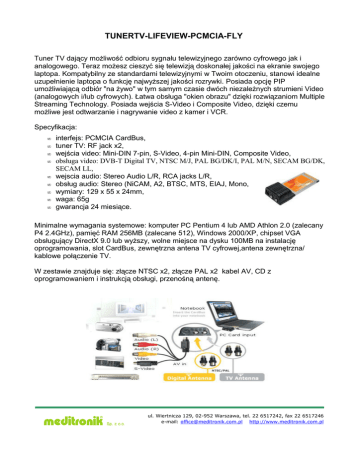 TUNERTV-LIFEVIEW-PCMCIA-FLY Tuner TV dający możliwość odbioru sygnału telewizyjnego zarówno cyfrowego jak i analogowego. Teraz możesz cieszyć się telewizją doskonałej jakości na ekranie swojego laptopa. Kompatybilny ze standardami telewizyjnymi w Twoim otoczeniu, stanowi idealne uzupełnienie laptopa o funkcję najwyższej jakości rozrywki. Posiada opcję PIP umożliwiającą odbiór "na żywo" w tym samym czasie dwóch niezależnych strumieni Video (analogowych i/lub cyfrowych). Łatwa obsługa "okien obrazu" dzięki rozwiązaniom Multiple Streaming Technology. Posiada wejścia S-Video i Composite Video, dzięki czemu możliwe jest odtwarzanie i nagrywanie video z kamer i VCR. Specyfikacja: • • • • • • • • • interfejs: PCMCIA CardBus, tuner TV: RF jack x2, wejścia video: Mini-DIN 7-pin, S-Video, 4-pin Mini-DIN, Composite Video, obsługa video: DVB-T Digital TV, NTSC M/J, PAL BG/DK/I, PAL M/N, SECAM BG/DK, SECAM LL, wejscia audio: Stereo Audio L/R, RCA jacks L/R, obsług audio: Stereo (NiCAM, A2, BTSC, MTS, EIAJ, Mono, wymiary: 129 x 55 x 24mm, waga: 65g gwarancja 24 miesiące. Minimalne wymagania systemowe: komputer PC Pentium 4 lub AMD Athlon 2.0 (zalecany P4 2.4GHz), pamięć RAM 256MB (zalecane 512), Windows 2000/XP, chipset VGA obsługujący DirectX 9.0 lub wyższy, wolne miejsce na dysku 100MB na instalację oprogramowania, slot CardBus, zewnętrzna antena TV cyfrowej,antena zewnętrzna/ kablowe połączenie TV. W zestawie znajduje się: złącze NTSC x2, złącze PAL x2 kabel AV, CD z oprogramowaniem i instrukcją obsługi, przenośną antenę. ul. Wiertnicza 129, 02-952 Warszawa, tel. 22 6517242, fax 22 6517246 e-mail: [email protected] http://www.meditronik.com.pl