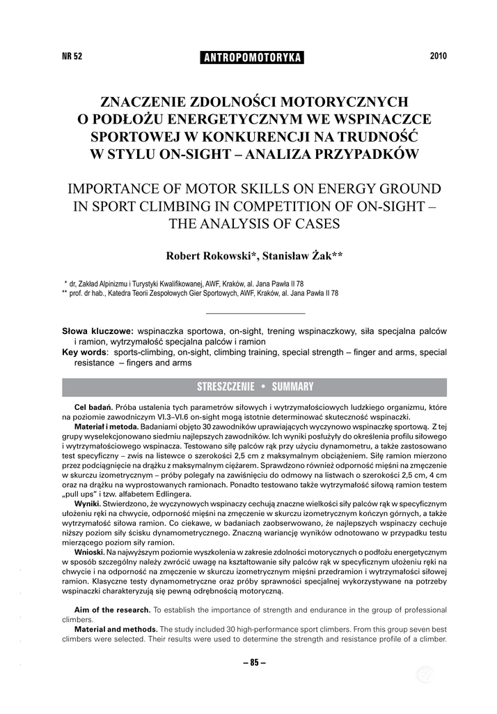 NR 52 AN TRO PO MO TO RY KA 2010 ZNACZENIE ZDOLNOŚCI MOTORYCZNYCH O PODŁOŻU ENERGETYCZNYM WE WSPINACZCE SPORTOWEJ W KONKURENCJI NA TRUDNOŚĆ W STYLU ON-SIGHT – ANALIZA PRZYPADKÓW IMPORTANCE OF MOTOR SKILLS ON ENERGY GROUND IN SPORT CLIMBING IN COMPETITION OF ON-SIGHT – THE ANALYSIS OF CASES Robert Rokowski*, Stanisław Żak** ***dr, Zakład Alpinizmu i Turystyki Kwalifikowanej, AWF, Kraków, al. Jana Pawła II 78 ***prof. dr hab., Katedra Teorii Zespołowych Gier Sportowych, AWF, Kraków, al. Jana Pawła II 78 Słowa kluczowe: wspinaczka sportowa, on-sight, trening wspinaczkowy, siła specjalna palców i ramion, wytrzymałość specjalna palców i ramion Key words: sports-climbing, on-sight, climbing training, special strength – finger and arms, special resistance – fingers and arms Aim of the research. To establish the importance of strength and endurance in the group of professional climbers. Material and methods. The study included 30 high-performance sport climbers. From this group seven best climbers were selected. Their results were used to determine the strength and resistance profile of a climber. – 85 – - Cel badań. Próba ustalenia tych parametrów siłowych i wytrzymałościowych ludzkiego organizmu, które na poziomie zawodniczym VI.3–VI.6 on-sight mogą istotnie determinować skuteczność wspinaczki. Materiał i metoda. Badaniami objęto 30 zawodników uprawiających wyczynowo wspinaczkę sportową. Z tej grupy wyselekcjonowano siedmiu najlepszych zawodników. Ich wyniki posłużyły do określenia profilu siłowego i wytrzymałościowego wspinacza. Testowano siłę palców rąk przy użyciu dynamometru, a także zastosowano test specyficzny – zwis na listewce o szerokości 2,5 cm z maksymalnym obciążeniem. Siłę ramion mierzono przez podciągnięcie na drążku z maksymalnym ciężarem. Sprawdzono również odporność mięśni na zmęczenie w skurczu izometrycznym – próby polegały na zawiśnięciu do odmowy na listwach o szerokości 2,5 cm, 4 cm oraz na drążku na wyprostowanych ramionach. Ponadto testowano także wytrzymałość siłową ramion testem „pull ups” i tzw. alfabetem Edlingera. Wyniki. Stwierdzono, że wyczynowych wspinaczy cechują znaczne wielkości siły palców rąk w specyficznym ułożeniu ręki na chwycie, odporność mięśni na zmęczenie w skurczu izometrycznym kończyn górnych, a także wytrzymałość siłowa ramion. Co ciekawe, w badaniach zaobserwowano, że najlepszych wspinaczy cechuje niższy poziom siły ścisku dynamometrycznego. Znaczną wariancję wyników odnotowano w przypadku testu mierzącego poziom siły ramion. Wnioski. Na najwyższym poziomie wyszkolenia w zakresie zdolności motorycznych o podłożu energetycznym w sposób szczególny należy zwrócić uwagę na kształtowanie siły palców rąk w specyficznym ułożeniu ręki na chwycie i na odporność na zmęczenie w skurczu izometrycznym mięśni przedramion i wytrzymałości siłowej ramion. Klasyczne testy dynamometryczne oraz próby sprawności specjalnej wykorzystywane na potrzeby wspinaczki charakteryzują się pewną odrębnością motoryczną. - - - STRESZCZENIE • SUMMARY Robert Rokowski, Stanisław Żak The strength of the fingers was tested with a dynamometer and a specific test was used – the overhang on 2,5 cm strip with the maximum load. Arm strength was measured by the elevating on bar with the maximum weight. Muscle resistance to fatigue in the isometric contraction was also examined – the sample consisted of overhanging as long as it was possible on the 2.5 cm and 4 cm strips and on the bar with the upright arms. In addition, the resistance of arm was tested with “pull ups” test and so-called Edlinger’s alphabet. Results. As it was found out, distinctive features of high-performance climbers were: the size of special force of fingers, muscle resistance to fatigue in the isometric contraction of upper limbs as well as the resistance of arms. The interesting thing observed in the study was that the model climbers were characterized by a lower level of force of dynamometric squeeze. Considerable variation of results was observed within motor effect measuring the force of arms. Conclusions. On the highest level of training within special efficiency the attention should be paid on the shaping of special force of the fingers and the special endurance of fingers and arm strength endurance. Proportional development of these factors should be considered as reasonable and necessary. Classical dynamometric tests and tests for the special climbing purposes are characterized by certain motor separateness. - - - - - Wstęp W fachowej literaturze liczni autorzy wykazują dużą zgodność opinii na temat roli zdolności motorycznych o podłożu energetycznym we wspinaczce sportowej. Do znamiennych elementów wyznaczających efektywność działań na sztucznej ścianie zaliczają – obok techniki, specyficznej budowy ciała, gibkości – siłę oraz wytrzymałość, w której istotne znaczenie odgrywają przemiany o charakterze tlenowym i beztlenowym [1–4]. Autorzy tych publikacji [1–4] zajmują się jednak wyłącznie charakterystyką głównych morfofunkcjonalnych determinantów skuteczności wspinania się oraz prezentacją metod ich rozwoju. Wspomniane opracowania stanowią tylko uproszczony opis analizowanego zjawiska, który sprowadza się do identyfikacji, strukturalizacji i hierarchizacji czynników wpływających na wynik w omawianej dyscyplinie sportowej. Interesujących uwag z zakresu znaczenia zdolności motorycznych o podłożu energetycznym we wspinaczce sportowej dostarcza również literatura badawcza. Grant i wsp. [5], Guidi [6], Sheel [7], Watts i wsp. [8] oraz Rokowski [9, 10] jednoznacznie wskazują na znaczenie zdolności siłowych i wytrzymałościowych w omawianej dyscyplinie sportowej. Watts [8] i Sheel [7] w swoich przeglądowych opracowaniach poświęconych czynnikom morfofunkcjonalnym, które warunk