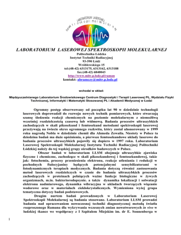 LABORATORIUM LASEROWEJ SPEKTROSKOPII MOLEKULARNEJ Politechnika Łódzka Instytut Techniki Radiacyjnej 93-590 Łódź Wróblewskiego 15 tel:(48-42) 6313175, 6313162, 6313188 fax:(48-42) 6840043 http://www.mitr.p.lodz.pl/raman kontakt: [email protected] wchodzi w skład: Międzyuczelnianego Laboratorium Środowiskowego Centrum Diagnostyki i Terapii Laserowej PŁ, Wydziału Fizyki Technicznej, Informatyki i Matematyki Stosowanej PŁ i Akademii Medycznej w Łodzi Ogromny postęp obserwowany od początku lat 90 w dziedzinie technologii laserowych doprowadził do rozwoju nowych technik pomiarowych, które stwarzają szansę śledzenia reakcji chemicznych na poziomie molekularnym z niemożliwą wcześniej rozdzielczością czasową lub widmową. Badania procesów ultraszybkich zachodzących w skali pikosekund i femtosekund metodami spektroskopii laserowej przeżywają na świecie okres ogromnego rozkwitu, który został uhonorowany w 1999 roku nagrodą Nobla w dziedzinie chemii dla Ahmeda Zewaila. Niestety w Polsce ta dziedzina badań ma duże opóźnienia, a pierwsze femtosekundowe układy laserowe do badania procesów ultraszybkich pojawiły się dopiero w 1997 roku. Laboratorium Laserowej Spektroskopii Molekularnej Instytutu Techniki Radiacyjnej Politechniki Łódzkiej należy do tej wąskiej grupy ośrodków badawczych w Polsce. Obszar badań w laboratorium LLSM obejmuje ultraszybkie zjawiska fizyczne i chemiczne, zachodzące w skali pikosekundowej i femtosekundowej, takie jak: fotochemia, procesy przeniesienia elektronu, reakcje utleniania i redukcji w pochodnych ftalocyjaniny będących potencjalnymi sensybilizatorami w fotodynamicznych terapiach medycznych. Badania dotyczą również zastosowania metod laserowych rozdzielczych w czasie do badania ultraszybkich procesów zachodzących w proteinach pełniących ważne funkcje biologiczne w żywych organizmach, m.in. bakteriorodopsynie. a także dynamika lokalizacji i solwatacji elektronu nadmiarowego, dynamika wibracyjna w układach tworzących wiązanie wodorowe oraz w materiałach ciekłokrystalicznych. Wymieniona wyżej grupa tematyczna dotyczy badań podstawowych. Drugim nurtem badań prowadzonych w Laboratorium Laserowej Spektroskopii Molekularnej są badania stosowane. Laboratorium LLSM prowadzi badania nad opracowaniem nowoczesnej techniki diagnostycznej metodą światła rozproszonego Ramana dla wykrywania wczesnych zmian nowotworowych in vivo w ludzkiej tkance we współpracy z I Szpitalem Miejskim im. dr E. Sonnenberga w 1 Łodzi oraz Publicznym Ośrodkiem Zdrowia w Andrespolu. Badania dotyczą ustalenia empirycznych korelacji między widmem wibracyjnym i emisyjnym a zmianami wywołanymi chorobami takimi jak: rak pęcherza, rak sutka, rak żołądka, nowotwór płuc, białaczka, rak jelita, wodobrzusze, czerniak złośliwy. Dotychczasowe badania obejmują około 100 pacjentów chorych i 100 pacjentów zdrowych. Dotychczas uzyskane wyniki zachęcają do rozszerzenia współpracy na Oddział Chirurgii Onkologicznej Wojewódzkiego Szpitala Specjalistycznego im. M. Kopernika w Łodzi w celu podjęcia badań widm tkanki piersi ludzkiej pobranej do analizy histopatologicznej w biopsji igłowej metodami spektroskopii Ramana. W Laboratorium Laserowej Spektroskopii Molekularnej zgromadzono aparaturę unikalną w skali kraju, odpowiadającą najwyższym standardom światowym. Laboratorium Laserowej Spektroskopii Molekularnej dysponuje unikatowymi w skali kraju układami laserowymi, w szczególności femtosekundowym układem laserowym i układem laserowym do pomiarów światła rozproszonego metodą rozpraszania Ramana i należy do bardzo wąskiej grupy najnowocześniejszych laboratoriów laserowych w Polsce. Laboratorium Laserowej Spektroskopii Molekularnej Instytutu Techniki Radiacyjnej Politechniki Łódzkiej dysponując sprzętem badawczym o regionalnym i ogólnokrajowym znaczeniu współpracuje z laboratoriami zagranicznymi z USA, Francji, Niemiec oraz w ramach Międzyuczelnianego Laboratorium Środowiskowego przyczynia się do dostarczenia środowisku łódzkich chemików nowoczesnej i unikatowej aparatury badawczej. 2