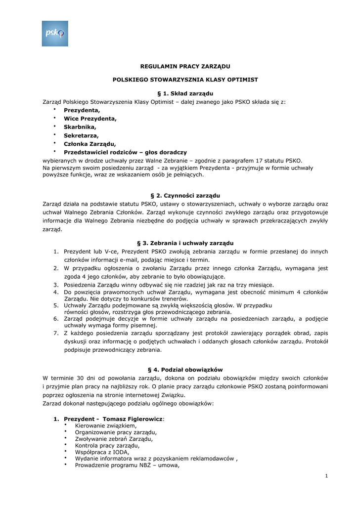 REGULAMIN PRACY ZARZĄDU POLSKIEGO STOWARZYSZNIA KLASY OPTIMIST § 1. Skład zarządu Zarząd Polskiego Stowarzyszenia Klasy Optimist – dalej zwanego jako PSKO składa się z: • Prezydenta, • Wice Prezydenta, • Skarbnika, • Sekretarza, • Członka Zarządu, • Przedstawiciel rodziców – głos doradczy wybieranych w drodze uchwały przez Walne Zebranie – zgodnie z paragrafem 17 statutu PSKO. Na pierwszym swoim posiedzeniu zarząd - za wyjątkiem Prezydenta - przyjmuje w formie uchwały powyższe funkcje, wraz ze wskazaniem osób je pełniących. § 2. Czynności zarządu Zarząd działa na podstawie statutu PSKO, ustawy o stowarzyszeniach, uchwały o wyborze zarządu oraz uchwał Walnego Zebrania Członków. Zarząd wykonuje czynności zwykłego zarządu oraz przygotowuje informacje dla Walnego Zebrania niezbędne do podjęcia uchwały w sprawach przekraczających zwykły zarząd. § 3. Zebrania i uchwały zarządu 1. Prezydent lub V-ce, Prezydent PSKO zwołują zebrania zarządu w formie przesłanej do innych członków informacji e-mail, podając miejsce i termin. 2. W przypadku ogłoszenia o zwołaniu Zarządu przez innego członka Zarządu, wymagana jest zgoda 4 jego członków, aby zebranie to było obowiązujące. 3. Posiedzenia Zarządu winny odbywać się nie rzadziej jak raz na trzy miesiące. 4. Do powzięcia prawomocnych uchwał Zarządu, wymagana jest obecność minimum 4 członków Zarządu. Nie dotyczy to konkursów trenerów. 5. Uchwały Zarządu podejmowane są zwykłą większością głosów. W przypadku równości głosów, rozstrzyga głos przewodniczącego zebrania. 6. Zarząd podejmuje decyzje w formie uchwały zarządu na posiedzeniach zarządu, a podjęcie uchwały wymaga formy pisemnej. 7. Z każdego posiedzenia zarządu sporządzany jest protokół zawierający porządek obrad, zapis dyskusji oraz informację o podjętych uchwałach i oddanych głosach członków zarządu. Protokół podpisuje przewodniczący zebrania. § 4. Podział obowiązków W terminie 30 dni od powołania zarządu, dokona on podziału obowiązków między swoich członków i przyjmie plan pracy na najbliższy rok. O planie pracy zarządu członkowie PSKO zostaną poinformowani poprzez ogłoszenia na stronie internetowej Związku. Zarzad dokonał następującego podziału ogólnego obowiązków: 1. Prezydent - Tomasz Figlerowicz: • Kierowanie związkiem, • Organizowanie pracy zarządu, • Zwoływanie zebrań Zarządu, • Kontrola pracy zarządu, • Współpraca z IODA, • Wydanie informatora wraz z pozyskaniem reklamodawców , • Prowadzenie programu NBŻ – umowa, 1 2. Wice Prezydent – Przemysław Struś: • • • • • Nadzoruje sprawy sportowe związku, Organizuje pracę Reprezentacji PSKO, Organizuje szkolenie dla trenerów i instruktorów na rzecz PSKO, Organizacja i nadzór nad ME i MŚ, DME. Organizuje i przygotowuje zasady i terminy powoływania trenerów na MŚ, ME, DME. 3. Skarbnik – Arkadiusz Lenkowski: zarządzanie majątkiem związku, gospodarowania finansami, gospodarowanie majątkiem ruchomym Związku, wykonywanie wszystkich obowiązujących czynności finansowych i sprawozdawczych związku. Ponad to: Zarząd ustalił, że do podpisywanie przelewów PSKO jest zawsze wymagana zgoda dwóch członków Zarządu - obowiązkowo Skarbnik wraz z Prezydentem lub Wice Prezydentem, Zarząd ustalił, że Skarbnik może zlecić prowadzenie księgowości „ na zewnątrz” związku po zaakceptowaniu w formie Uchwały zarządu umowy z podmiotem mającym wykonywać takie usługi. Wszelka sprzedaż lub nabywanie majątku PSKO jak i podpisywanie umów wymaga zgody Zarządu w formie uchwały. • • • • 4. Sekretarza - Arka Komorowskiego: • • • • • Prowadzenie wszelkiej korespondencji związku, Dokonywanie zmian w KRS, Prowadzenie programu NBŻ 2012 – umowa, Prowadzenie strony PSKO i forum PSKO, Prowadzenie kalendarza PSKO. 5. Członek Zarządu – Barbara Dziekańska, • • • • • Pełnienie funkcji obserwatora regat z ramienia PSKO, Prowadzenie rankingu PSKO, wraz z weryfikacją składek, Stworzenie i prowadzenia arkuszu oceny regat, Prowadzenie kalendarza PSKO, Prowadzenie strony PSKO i forum PSKO. 6. Przedstawiciel rodziców – Paweł Placzke – głos doradczy. § 6. Dostęp do dokumentacji, informacja Zarząd udostępnienia wszystkie dokumenty Związku jego członkom na jego wniosek złożony ustnie lub pisemnie. Każdy z członków zarządu przyjmuje do wiadomości, że złamanie i niewypełnianie zapisów niniejszego regulaminu jest podstawą do jego odwołania z pełnionej funkcji w Zarządzie, i rozpoczęcie procedury odwoławczej zgodnie ze Statutem PSKO. 2