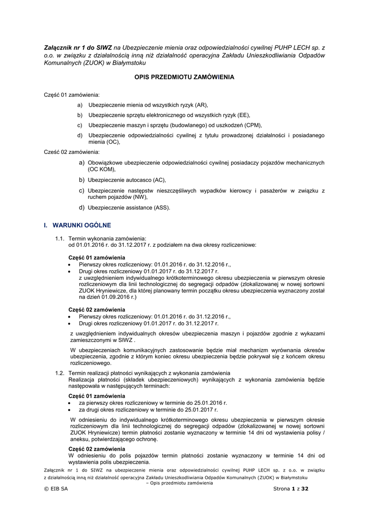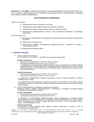 Załącznik nr 1 do SIWZ na Ubezpieczenie mienia oraz odpowiedzialności cywilnej PUHP LECH sp. z o.o. w związku z działalnością inną niż działalność operacyjna Zakładu Unieszkodliwiania Odpadów Komunalnych (ZUOK) w Białymstoku OPIS PRZEDMIOTU ZAMÓWIENIA Część 01 zamówienia: a) Ubezpieczenie mienia od wszystkich ryzyk (AR), b) Ubezpieczenie sprzętu elektronicznego od wszystkich ryzyk (EE), c) Ubezpieczenie maszyn i sprzętu (budowlanego) od uszkodzeń (CPM), d) Ubezpieczenie odpowiedzialności cywilnej z tytułu prowadzonej działalności i posiadanego mienia (OC), Cześć 02 zamówienia: a) Obowiązkowe ubezpieczenie odpowiedzialności cywilnej posiadaczy pojazdów mechanicznych (OC KOM), b) Ubezpieczenie autocasco (AC), c) Ubezpieczenie następstw nieszczęśliwych wypadków kierowcy i pasażerów w związku z ruchem pojazdów (NW), d) Ubezpieczenie assistance (ASS). I. WARUNKI OGÓLNE 1.1. Termin wykonania zamówienia: od 01.01.2016 r. do 31.12.2017 r. z podziałem na dwa okresy rozliczeniowe: Część 01 zamówienia Pierwszy okres rozliczeniowy: 01.01.2016 r. do 31.12.2016 r., Drugi okres rozliczeniowy 01.01.2017 r. do 31.12.2017 r. z uwzględnieniem indywidualnego krótkoterminowego okresu ubezpieczenia w pierwszym okresie rozliczeniowym dla linii technologicznej do segregacji odpadów (zlokalizowanej w nowej sortowni ZUOK Hryniewicze, dla której planowany termin początku okresu ubezpieczenia wyznaczony został na dzień 01.09.2016 r.) Część 02 zamówienia Pierwszy okres rozliczeniowy: 01.01.2016 r. do 31.12.2016 r., Drugi okres rozliczeniowy 01.01.2017 r. do 31.12.2017 r. z uwzględnieniem indywidualnych okresów ubezpieczenia maszyn i pojazdów zgodnie z wykazami zamieszczonymi w SIWZ . W ubezpieczeniach komunikacyjnych zastosowanie będzie miał mechanizm wyrównania okresów ubezpieczenia, zgodnie z którym koniec okresu ubezpieczenia będzie pokrywał się z końcem okresu rozliczeniowego. 1.2. Termin realizacji płatności wynikających z wykonania zamówienia Realizacja płatności (składek ubezpieczeniowych) wynikających z wykonania zamówienia będzie następowała w następujących terminach: Część 01 zamówienia za pierwszy okres rozliczeniowy w terminie do 25.01.2016 r. za drugi okres rozliczeniowy w terminie do 25.01.2017 r. W odniesieniu do indywidualnego krótkoterminowego okresu ubezpieczenia w pierwszym okresie rozliczeniowym dla linii technologicznej do segregacji odpadów (zlokalizowanej w nowej sortowni ZUOK Hryniewicze) termin płatności zostanie wyznaczony w terminie 14 dni od wystawienia polisy / aneksu, potwierdzającego ochronę. Część 02 zamówienia W odniesieniu do polis pojazdów termin płatności zostanie wyznaczony w terminie 14 dni od wystawienia polis ubezpieczenia. Załącznik nr 1 do SIWZ na ubezpieczenie mienia oraz odpowiedzialności cywilnej PUHP LECH sp. z o.o. w związku z działalnością inną niż działalność operacyjna Zakładu Unieszkodliwiania Odpadów Komunalnych (ZUOK) w Białymstoku – Opis przedmiotu zamówienia © EIB SA Strona 1 z 32 1.3. Ubezpieczenia zawarte zostaną w formie umowy generalnej. 1.4. W przypadku wykonawcy działającego w formie towarzystwa ubezpieczeń wzajemnych zawarcie umów ubezpieczenia nie będzie wiązało się z uzyskaniem przez zamawiającego członkostwa w TUW, a w szczególności – ze zobowiązaniem Zamawiającego do udziału w pokrywaniu straty towarzystwa na rzecz Zamawiającego z tytułu ubezpieczeń. 1.5. Wypłata odszkodowań następuje z podatkiem VAT, chyba że Zamawiający jest uprawniony do jego odliczenia. 1.6. Określone w umowie limity odpowiedzialności Ubezpieczyciela (np.: przewidziane w poszczególnych klauzulach lub dla poszczególnych ryzyk) stosuje się w pełnej wysokości w każdym 12 miesięcznym okresie ubezpieczenia. 1.7. W umowie ubezpieczenia nie mają zastosowania limity odpowiedzialności ograniczające ochronę, jeśli nie zostały przewidziane w niniejszej SIWZ. 1.8. Wszelkie postanowienia umowy ubezpieczenia będą obowiązywały z uwzględnieniem specyfiki działalności Ubezpieczającego jako podmiotu zajmującego się zbieraniem, obróbką i gospodarowaniem odpadami. W szczególności gdziekolwiek w warunkach ubezpieczenia znajdują się postanowienia wyłączające odpowiedzialność Ubezpieczyciela za szkody związane ze specyfiką działalności Ubezpieczającego, to nie będą one miały zastosowania. 1.9. Gdziekolwiek w warunkach ubezpieczenia Wykonawcy wyłączona jest odpowiedzialność Ubezpieczyciela za określone zdarzenia, postanowienia te będą miały zastosowanie wyłącznie wtedy, gdy wystąpienie szkody jest bezpośrednim następstwem wystąpienia takiego zdarzenia. 1.10. Ubezpieczający zastrzega sobie prawo do zmiany przyjętych wartości sum ubezpieczenia przed wystawieniem polis ubezpieczeniowych. 1.11. W celu realizacji zamówienia Wykonawca powinien zapewnić bieżącą obsługę, szybką reakcję w przypadku zaistnienia szkody i sprawną jej likwidację zgodnie z postanowieniami SIWZ. 1.12. Jeżeli Zamawiający na skutek błędu lub przeoczenia nie przekaże Ubezpieczycielowi istotnych informacji mających związek z umową ubezpieczenia, a działanie takie nie będzie skutkiem winy umyślnej, to fakt nieprzekazania nie może być powodem odmowy wypłaty odszkodowania lub jego redukcji, pod warunkiem niezwłocznego uzupełnienia tych danych. 1.13. Seria zdarzeń szkodowych powstałych na skutek jednego zdarzenia, traktowana jest jako jedno zdarzenie; odnosi się to również do zdarzeń objętych ochroną w ramach rozszerzeń ubezpieczenia przewidzianych w klauzulach dodatkowych i jakiekolwiek przewidziane w nich franszyzy lub udziały własne będą w takim przypadku potrącane wyłącznie jednokrotnie. Powyższe nie dotyczy ryzyk kradzieży. 1.14. Postanowienia dotyczące Wykonawców, którym wspólnie udzielono zamówienia publicznego (np. konsorcjum/pool koasekuracyjny): Wykonawcy, którym wspólnie udziel