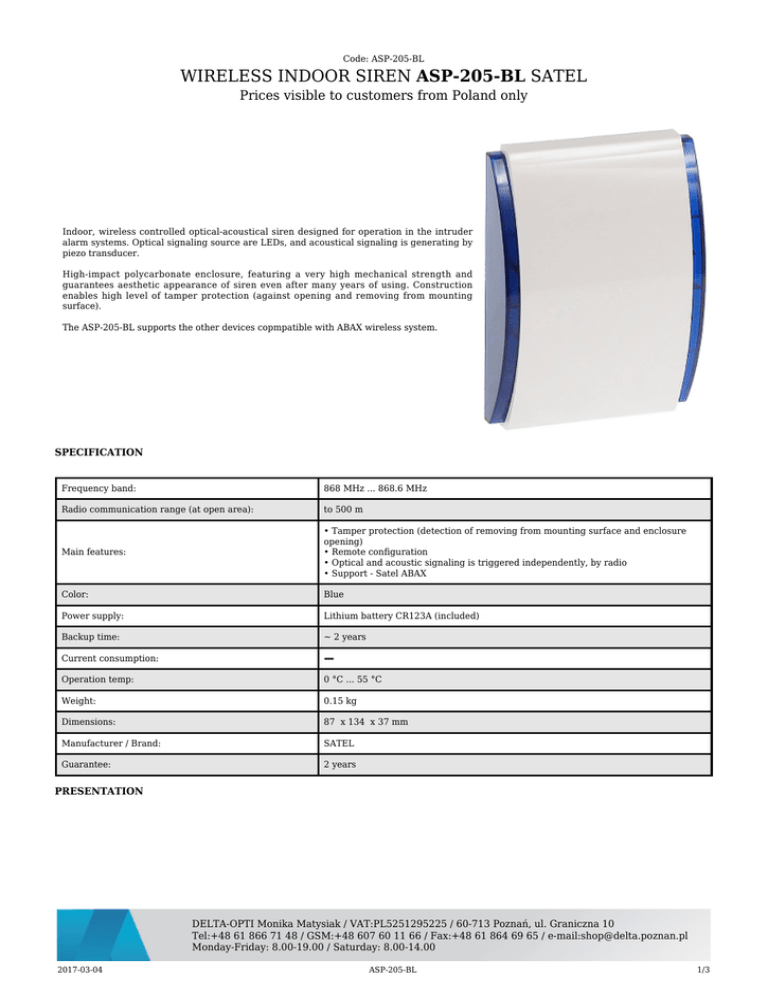 Code: ASP-205-BL WIRELESS INDOOR SIREN ASP-205-BL SATEL Prices visible to customers from Poland only Indoor, wireless controlled optical-acoustical siren designed for operation in the intruder alarm systems. Optical signaling source are LEDs, and acoustical signaling is generating by piezo transducer. High-impact polycarbonate enclosure, featuring a very high mechanical strength and guarantees aesthetic appearance of siren even after many years of using. Construction enables high level of tamper protection (against opening and removing from mounting surface). The ASP-205-BL supports the other devices copmpatible with ABAX wireless system. SPECIFICATION Frequency band: 868 MHz ... 868.6 MHz Radio communication range (at open area): to 500 m Main features: • Tamper protection (detection of removing from mounting surface and enclosure opening) • Remote configuration • Optical and acoustic signaling is triggered independently, by radio • Support - Satel ABAX Color: Blue Power supply: Lithium battery CR123A (included) Backup time: ~ 2 years Current consumption: Operation temp: 0 °C ... 55 °C Weight: 0.15 kg Dimensions: 87 x 134 x 37 mm Manufacturer / Brand: SATEL Guarantee: 2 years PRESENTATION DELTA-OPTI Monika Matysiak / VAT:PL5251295225 / 60-713 Poznań, ul. Graniczna 10 Tel:+48 61 866 71 48 / GSM:+48 607 60 11 66 / Fax:+48 61 864 69 65 / e-mail:[email protected] Monday-Friday: 8.00-19.00 / Saturday: 8.00-14.00 2017-03-04 ASP-205-BL 1/3 Internal view: Mounting side view: In the kit: DELTA-OPTI Monika Matysiak / VAT:PL5251295225 / 60-713 Poznań, ul. Graniczna 10 Tel:+48 61 866 71 48 / GSM:+48 607 60 11 66 / Fax:+48 61 864 69 65 / e-mail:[email protected] Monday-Friday: 8.00-19.00 / Saturday: 8.00-14.00 2017-03-04 ASP-205-BL 2/3 PACKAGE PARAMETERS Dimensions (L x W x H): 150x100x50 mm Package: Karton Gross Weight: 0.23 kg DELTA-OPTI Monika Matysiak / VAT:PL5251295225 / 60-713 Poznań, ul. Graniczna 10 Tel:+48 61 866 71 48 / GSM:+48 607 60 11 66 / Fax:+48 61 864 69 65 / e-mail:[email protected] Monday-Friday: 8.00-19.00 / Saturday: 8.00-14.00 2017-03-04 ASP-205-BL 3/3