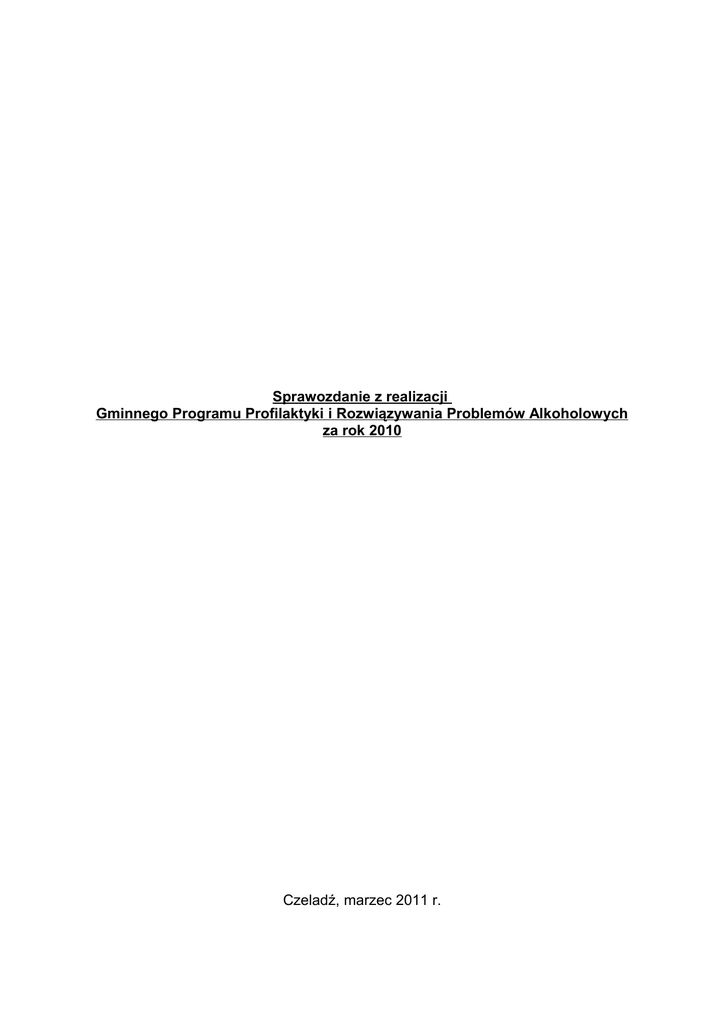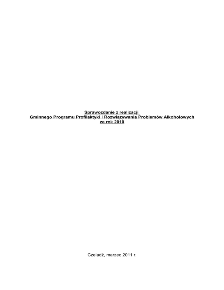Sprawozdanie z realizacji Gminnego Programu Profilaktyki i Rozwiązywania Problemów Alkoholowych za rok 2010 Czeladź, marzec 2011 r. I. Zwiększenie dostępności pomocy terapeutycznej i rehabilitacyjnej dla osób uzależnionych od alkoholu Zespół Konsultacyjny prowadził bezpłatne poradnictwo i konsultacje dla mieszkańców Czeladzi (w poniedziałek od 1600-2000 – porady prawne, wtorek 1530-1830 – terapia grupowa dla osób uzależnionych od alkoholu, czwartek 12001300 – grupa terapeutyczna dla osób dotkniętych problemem alkoholowym, czwartek 1300-1400 – konsultacje dla rodzin z problemem uzależnienia oraz w sprawach przemocy w rodzinie, czwartek 1400-2000 – dla osób uzależnionych od narkotyków, osób z problemem HIV/AIDS, piątek 1200-1400 - konsultacje dla rodzin z problemem uzależnienia oraz w sprawach przemocy w rodzinie, piątek 1700-2100 zajęcia edukacyjno-korekcyjne ze sprawcami przemocy domowej). W 2010 r. w Zespole Konsultacyjnym udzielono ogółem 945 porad, w tym: 307 porad prawnych, 172 porad dla osób uzależnionych od środków psychoaktywnych, 336 porad dla osób uzależnionych, współuzależnionych oraz osób doznających przemocy domowej, ponadto przeprowadzono 130 rozmów edukacyjno – korekcyjnych ze sprawcami przemocy domowej. 2. Telefon Zaufania udzielił ogółem 220 porad osobom potrzebującym pomocy. Telefon Zaufania funkcjonował 15 godzin/tygodniowo. w 2010 r. udzielał porad w poniedziałek od 1400 do 1900, wtorek od 1600 do 1800, środa od 1500 do 1800, czwartek od 1500 do 1800, piątek od 1600 do 1800. 3. Klub Abstynenta „Metamorfoza”: • prowadzono terapię dla osób uzależnionych (72 godziny rocznie), • raz w tygodniu odbywały się spotkania społeczności klubowej wraz z rodzinami, • zapewniono bazę lokalową i opłacono media dla Klubu, • zapewniono zakup medali, artykułów spożywczych na imprezy sportowe propagujące idee trzeźwości. W Klubie Abstynenta organizowano również inne formy rehabilitacyjne dla osób uzależnionych oraz ich rodzin, do których zaliczyć można np.: • zorganizowanie obozu terapeutycznego dla 24 członków Klubu w miejscowości Ponikwa w terminie od 28.06. do 08.07.2010 r., • zapewnienie udziału członków Klubu Abstynenta w Jubileuszowym XX Ogólnopolskim Przeglądzie Twórczości Abstynenckiej – Zamczysko 2010 (zakupiono nagrody) • zapewnienie możliwości zorganizowania I Turniej Tenisa Stołowego 06.06.2010 r. na hali MOSiR. 4. Poradnia Przeciwalkoholowa przy PZZOZ – Szpital w Czeladzi prowadziła zajęcia terapii grupowej dla osób uzależnionych (trzy godziny tygodniowo). 5. Stowarzyszenie Trzeźwościowe „NOWE”: • dwa razy w tygodniu odbywały się spotkania z osobami potrzebującymi pomocy w związku z problemem alkoholowym, • zapewniono bazę lokalową Stowarzyszeniu, • Stowarzyszenie prowadzi sekcję sportowo – rekreacyjną, w ramach, której organizowano cykliczne spotkania rekreacyjne pn. „Niedzielny Poranek Sportowy” na boisku Szkoły Podstawowej nr 3 oraz hali MOSiR. W zajęciach uczestniczyło ok. 25 osób tygodniowo, • „NOWE” zorganizowało w 2010 r. turnieje piłki nożnej pn. „Długie weekendy”, w których łącznie wzięło udział ok. 300 osób, • zapewnienie możliwości zorganizowania Halowego Turnieju Piłki Nożnej Klubów Abstynenckich pod hasłem „Nie piję, bo gram!” 28.03.2010 r. (zabezpieczono 1. 2 obsługę turnieju: opiekę medyczną, sędziowanie, konferansjera, zakupiono nagrody, zapewniono posiłek regeneracyjny dla uczestników), • zorganizowanie weekendu terapeutycznego dla 12 osób w miejscowości Żabnica w terminie od 08.10. do 10.10.2010 r. 6. Zapewniono prenumeratę miesięcznika „Remedium” dla Poradni PsychologicznoPedagogicznej, Klubu Abstynenta „Metamorfoza”, Poradni Przeciwalkoholowej, Miejskiego Ośrodka Pomocy Społecznej, Wydziału Polityki Społecznej i Edukacji. II. 1. 2. 3. 4. a) b) 5. − − Udzielanie rodzinom, w których występują problemy alkoholowe, pomocy psychospołecznej i prawnej, a w szczególności ochrony przed przemocą w rodzinie Zespół Konsultacyjny udzielił w 2010 r. ogółem 945 porad. Z pomocy prawnej skorzystało 307 osobom, pomocy terapeutycznej związanej z problemem uzależnienia od alkoholu i przemocy w rodzinie udzielono 336 osobom. Telefon Zaufania w 2010 r. udzielił 220 porad. Tematyka rozmów dotyczyła głównie problemów związanych z: nadużywaniem alkoholu, konfliktami i nieporozumieniami rodzinnymi oraz związanymi z pracą zawodową, problemami związanych ze złym stanem zdrowia, a także przemocą w rodzinie. Z lokalu interwencyjnego skorzystała 1 rodzina (3 osoby). Wsparto działalności placówek zajmujących się pomocą osobom uzależnionym i ich rodzinom. Dofinansowano Powiatowy Zespół Zakładów Opieki Zdrowotnej w Będzinie dotacja na prowadzenie Zespołu Konsultacyjnego w Poradni Przeciwalkoholowej w Czeladzi: - zapewniono konsultację prawnika (4 godz./tyg.), terapeuty ds. uzależnień od środków psychoaktywnych (6 godz./tyg.), specjalisty ds. przemocy w rodzinie (4 godz./tyg.), psychologa (4 godz./dziennie); - pokryto koszty 0,5 etatu pracownika pierwszego kontaktu (pielęgniarki) dla osób uzależnionych od alkoholu; - pokryto koszty 0,5 etatu instruktora terapii uzależnień – członka Zespołu Konsultacyjnego; - sfinansowano ryczałt przeznaczony na pokrycie kosztów prowadzenia Zespołu Konsultacyjnego do wysokości 10 % wynagrodzenia pracowników w/w zespołu. Dofinansowano Starostwo Powiatowe w Będzinie – dotacja na prowadzenie Ośrodka Wspierania Dziecka i Rodziny - filii w Czeladzi: - pokryto koszty związane z bieżącym utrzymaniem obiektu: zakup mediów, zakup usług (opłata za telefon, drobne naprawy, remonty bieżące), zakup materiałów (środków czystości) oraz innych artykułów niezbędnych do funkcjonowania placówki, - pokryto koszty związane z wynagrodzeniem pracownika obsługi, - sfinansowano zak