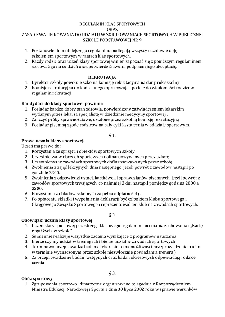 REGULAMIN KLAS SPORTOWYCH ORAZ ZASAD KWALIFIKOWANIA DO UDZIAŁU W ZGRUPOWANIACH SPORTOWYCH W PUBLICZNEJ SZKOLE PODSTAWOWEJ NR 9 1. Postanowieniom niniejszego regulaminu podlegają wszyscy uczniowie objęci szkoleniem sportowym w ramach klas sportowych. 2. Każdy rodzic oraz uczeń klasy sportowej winien zapoznać się z poniższym regulaminem, stosować go na co dzień oraz potwierdzić swoim podpisem jego akceptację. REKRUTACJA 1. Dyrektor szkoły powołuje szkolną komisję rekrutacyjna na dany rok szkolny 2. Komisja rekrutacyjna do końca lutego opracowuje i podaje do wiadomości rodziców regulamin rekrutacji. Kandydaci do klasy sportowej powinni: 1. Posiadać bardzo dobry stan zdrowia, potwierdzony zaświadczeniem lekarskim wydanym przez lekarza specjalistę w dziedzinie medycyny sportowej . 2. Zaliczyć próby sprawnościowe, ustalone przez szkolną komisję rekrutacyjną 3. Posiadać pisemną zgodę rodziców na cały cykl kształcenia w oddziale sportowym. § 1. Prawa ucznia klasy sportowej. Uczeń ma prawo do: 1. Korzystania ze sprzętu i obiektów sportowych szkoły 2. Uczestnictwa w obozach sportowych dofinansowywanych przez szkołę 3. Uczestnictwa w zawodach sportowych dofinansowywanych przez szkołę 4. Zwolnienia z zajęć lekcyjnych dnia następnego, jeżeli powrót z zawodów nastąpił po godzinie 2200. 5. Zwolnienia z odpowiedzi ustnej, kartkówek i sprawdzianów pisemnych, jeżeli powrót z zawodów sportowych trwających, co najmniej 3 dni nastąpił pomiędzy godzina 2000 a 2200. 6. Korzystania z obiadów szkolnych za pełna odpłatnością . 7. Po opłaceniu składki i wypełnieniu deklaracji być członkiem klubu sportowego i Okręgowego Związku Sportowego i reprezentować ten klub na zawodach sportowych. § 2. Obowiązki ucznia klasy sportowej 1. Uczeń klasy sportowej przestrzega klasowego regulaminu oceniania zachowania i „Kartę reguł życia w szkole”. 2. Sumiennie realizuje wszystkie zadania wynikające z programów nauczania 3. Bierze czynny udział w treningach i bierze udział w zawodach sportowych 4. Terminowo przeprowadza badania lekarskie( o niemożliwości przeprowadzenia badań w terminie wyznaczonym przez szkolę niezwłocznie powiadamia trenera ) 5. Za przeprowadzenie badań wstępnych oraz badan okresowych odpowiadają rodzice ucznia § 3. Obóz sportowy 1. Zgrupowania sportowo-klimatyczne organizowane są zgodnie z Rozporządzeniem Ministra Edukacji Narodowej i Sportu z dnia 30 lipca 2002 roku w sprawie warunków 2. 3. 4. 5. 6. 7. 8. 9. tworzenia, organizacji oraz działania klas i szkół sportowych oraz szkół mistrzostwa sportowego a także z wewnątrz szkolnym rozporządzeniem dyrektora szkoły w sprawie zasad organizacji i bezpieczeństwa na wycieczkach, zielonych szkołach i obozach sportowych. Zgrupowania odbywają się w miarę możliwości finansowych szkoły. Szkoła sportowa ze środków przyznawanych przez organ prowadzący szkołę, pokrywa część kosztów wyżywienia i noclegów dla uczestników oraz kadry trenerskopedagogicznej. Rodzice pokrywają koszty dopłaty do wyżywienia i noclegów oraz przejazdu tam i z powrotem za swoje dziecko. W szczególnych przypadkach, koszty ponoszone przez rodziców, mogą być rozłożone na raty po wcześniejszym uzgodnieniu z wicedyrektorem szkoły. O zakwalifikowaniu dziecka na zgrupowanie decyduje Komisja Sportu pod przewodnictwem wicedyrektora szkoły z udziałem wychowawców klas i trenerów grup. Uczeń klasy sportowej powinien osiągać dobre wyniki w nauce. Uczeń, który w I semestrze lub na koniec roku szkolnego otrzyma ocenę niedostateczną, z co najmniej jednego przedmiotu, nie będzie zakwalifikowany na zgrupowanie. Uczeń klasy sportowej musi wykazać się wysoką frekwencją na treningach, co najmniej 85% obecności oraz udziałem w zawodach sportowych na szczeblu szkolnym, miejskim, wojewódzkim lub ogólnopolskim. W szczególnych sytuacjach, kiedy uczeń ma dłuższe, lekarskie zwolnienie od zajęć, może być zakwalifikowany po uprzednim pozytywnym orzeczeniu jego stanu zdrowia przez lekarza. Na co najmniej 30 dni przed rozpoczęciem zgrupowania, rodzice zobowiązani są do zgłoszenia w sekretariacie szkoły rezygnacji z udziału w nim dziecka. W przypadku rezygnacji, dziecko zobowiązane jest do realizacji obowiązku szkolnego w innej, równoległej klasie wyznaczonej przez wicedyrektora szkoły § 4. Uczeń może być odsunięty od treningu: 1. Na wniosek rodzica wychowawcy lub trenera w przypadku słabych wyników w nauce Uczeń może zostać przeniesiony do klasy ogólnej w przypadku: 1. Nie przestrzegania obowiązków ucznia zawartych w statucie szkoły i Karcie reguł życia w szkole 2. Negatywnej opinii wychowawcy klasy lub trenera 3. Negatywnej opinii o stanie zdrowia wystawionej przez lekarza 4. Wniosku rodziców, którzy nie wyrażają zgody na jego uczestnictwo w klasie sportowej 5. Częstego opuszczania zajęć treningowych bez usprawiedliwienia 6. Stwierdzenia braku postępów w rozwoju sportowym oraz biernego uczestnictwa w zajęciach sportowych. § 5. Postanowienia końcowe 1. Wszelkie decyzje dotyczące ucznia podejmuje Wicedyrektor szkoły na wniosek trenera, wychowawcy po konsultacji z pedagogiem i po zaopiniowaniu przez Komisje Sportu i zespół wychowawczy 2. Uczeń przeniesiony do klasy ogólnej traci prawa ucznia klasy sportowej.