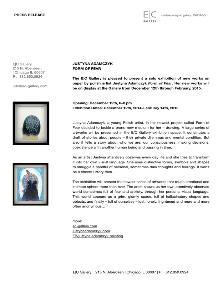 PRESS RELEASE ! ! ! ! E|C Gallery 215 N. Aberdeen | Chicago IL 60607 P . 312.850.0924 [email protected] JUSTYNA ADAMCZYK FORM OF FEAR The E|C Gallery is pleased to present a solo exhibition of new works on paper by polish artist Justyna Adamczyk Form of Fear. Her new works will be on display at the Gallery from December 12th through February, 2015. Opening: December 12th, 6–8 pm Exhibition Dates: December 12th, 2014–February 14th, 2015 ! ! Justyna Adamczyk, a young Polish artist, in her newest project called Form of Fear decided to tackle a brand new medium for her – drawing. A large series of artworks wil be presented in the E/C Gallery exhibition space. It constitutes a draft of stories about people – their private dilemmas and mental condition. But also it tells a story about who we are, our consciousness, making decisions, coexistence with another human being and passing in time. As an artist Justyna attentively observes every day life and she tries to transform it into her own visual language. She uses distinctive forms, symbols and shapes to smuggle a handful of personal, sometimes dark thoughts and feelings. It won’t be a cheerful story then… ! The exhibition will present the newest series of artworks that touch emotional and intimate sphere more than ever. The artist shows us her own attentively observed world sometimes full of fear and anxiety, through her personal visual language. This world appears as a grim, glumly space, full of hallucinatory shapes and objects, and finally – full of ourselves – lost, lonely, frightened and more and more often anonymous… ! ! more: ec-gallery.com justynaadamczyk.com FB/justyna.adamczyk.painting ! ! ! ! ! E|C Gallery | 215 N. Aberdeen | Chicago IL 60607 | P . 312.850.0924 JUSTYNA ADAMCZYK FORM OF FEAR ! ! ! ! ! Justyna Adamczyk (b. 1981 Opoczno) received MFA from the E. Gepperd’s Academy of Fine Arts in Poland, Wroclaw, painting specialization (under supervision of prof. P. Błażejewski and lect. P. Pintala), in 2007. In 2006-2007 she was a board member of ArtTransparent Foundation organizing „Survival” Young Art Review. She received an award of Ministry of Culture and Heritage (twice, in 2005 and 2006). In 2007 she was given a distinction from the Public Art Gallery in Łódź as part of The 17th Young Artists Contest "Promocje" in Legnica. Since 2005 she participates in many exhibitions and contests in Poland and abroad. Her works were exhibited on Vienna Art Fair (2011 Vienna) or on contemporary auctions sales „Najlepsze kasztany są na Placu Pigalle” (2010, Heppen, Transfer Gallery, Warsaw) as well as in such galleries like: Bestregards Galery (Frankfurt), EC Gallery (Chicago), Galeria Miejska (Łódź), ON Galery (Poznań), BWA (Bielsko Biała and Wroclaw) or Wozownia Gallery (Toruń). Her works were distinguished as part of contests such as: Biennale, Bielska Jesień (2013, Public Galery, Bielsko Biała), 9th Geppert’s Contest (2009, BWA Awangarda Wrocław), Biennale „Bielska Jesień” (2009, Public Gallery, Bielsko Biała), „Promocje” 17th Young Artists Contest (2007 Legnica). ! She lives and works in Warsaw, Poland. www.justynaadamczyk.com ! ! E|C Gallery | 215 N. Aberdeen | Chicago IL 60607 | P . 312.850.0924