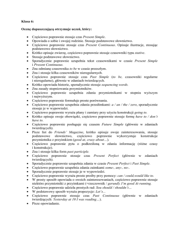Klasa 6: Ocenę dopuszczającą otrzymuje uczeń, który: Częściowo poprawnie stosuje czas Present Simple. Opowiada o sobie i swojej rodzinie. Stosuje podstawowe słownictwo. Częściowo poprawnie stosuje czas Present Continuous. Opisuje ilustracje, stosując podstawowe słownictwo. Krótko opisuje zwierzę, częściowo poprawnie stosuje czasowniki typu stative. Stosuje podstawowe słownictwo. Sporadycznie poprawnie uzupełnia tekst czasownikami w czasie Present Simple i Prezent Continuous. Zna odmianę czasownika to be w czasie przeszłym. Zna i stosuje kilka czasowników nieregularnych. Częściowo poprawnie stosuje czas Past Simple (to be, czasowniki regularne i nieregularne), głównie w zdaniach twierdzących. Krótko opowiada historie, sporadycznie stosuje sequencing words. Zna zasady stopniowania przymiotników. Częściowo poprawnie uzupełnia zdania przymiotnikami w stopniu wyższym i najwyższym. Częściowo poprawnie formułuje proste porównania. Częściowo poprawnie uzupełnia zdania przedimkami: a / an / the / zero, sporadycznie stosuje je w wypowiedzi. Częściowo poprawnie wyraża plany i zamiary przy użyciu konstrukcji going to. Krótko opisuje swoje obowiązki, częściowo poprawnie stosuje formę have to / don’t have to. Częściowo poprawnie posługuje się czasem Future Simple (głównie w zdaniach twierdzących). Pisze list do Friends’ Magazine, krótko opisuje swoje zainteresowania, stosuje podstawowe słownictwo, częściowo poprawnie wykorzystuje konstrukcje przymiotnika z przyimkiem (good at, crazy about…). Częściowo poprawnie pyta o podkreśloną w zdaniu informację (różne czasy i konstrukcje). Zna i stosuje kilka form past participle. Częściowo poprawnie stosuje czas Present Perfect (głównie w zdaniach twierdzących). Sporadycznie poprawnie uzupełnia zdania w czasie Present Perfect i Past Simple. Częściowo poprawnie uzupełnia zdania zaimkami some-, any-, no-. Sporadycznie poprawnie stosuje je w wypowiedzi. Częściowo poprawnie wyraża proste prośby przy pomocy: can / could,would like to. W prosty sposób opowiada o swoich zainteresowaniach, częściowo poprawnie stosuje niektóre przymiotniki z przyimkami (+rzeczownik / gerund): I’m good At running. Częściowo poprawnie udziela prostych rad: Sou should / shouldn’t… W podstawowy sposób wyraża propozycje: Let’s... Częściowo poprawnie stosuje czas Past Continuous (głównie w zdaniach twierdzących: Yesterday at 10 I was reading…). Pisze opowiadanie. Formułuje proste zdania, sporadycznie poprawnie wykorzystuje czas Past Simple i Past Continuous. Częściowo poprawnie uzupełnia tekst odpowiednimi formami czasowników: can / could / be able to. Częściowo poprawnie stosuje je w prostych zdaniach. Częściowo poprawnie wybiera odpowiednią formę question tag. Częściowo poprawnie uzupełnia zdania słowami: too / enough. Częściowo poprawnie przekształca zdania porównujące w zdania z konstrukcją (not) as… as. Pisze krótki list do Friends’ Magazine o swoim mieście lub kraju. Sporadycznie poprawnie stosuje wyrażenia: too much, too many, not enough przed rzeczownikami policzalnymi i niepoliczalnymi. Częściowo poprawnie tworzy przysłówki od podanych przymiotników. Ocenę dostateczną otrzymuje uczeń, który: Częściowo poprawnie stosuje czas Present Simple. Opowiada o sobie i swojej rodzinie. Stosuje bardziej rozbudowane słownictwo. Częściowo poprawnie stosuje czas Prezent Continuous. Opisuje ilustracje, stosując bardziej rozbudowane słownictwo. Krótko opisuje zwierzę, częściowo poprawnie stosuje czasowniki typu stative. Stosuje bardziej rozbudowane słownictwo. Częściowo poprawnie uzupełnia tekst czasownikami w czasie Present Simple i Present Continuous. Zna i stosuje połowę czasowników nieregularnych. Częściowo poprawnie stosuje czas Past Simple (to be, czasowniki regularne i nieregularne) we wszystkich rodzajach zdań. Krótko opowiada historie, od czasu do czasu stosuje sequencing words. W większości poprawnie uzupełnia zdania przymiotnikami w stopniu wyższym i najwyższym. Częściowo poprawnie stosuje przymiotniki w stopniu wyższym i najwyższym. W większości poprawnie uzupełnia zdania przedimkami: a / an / the / zero, częściowo poprawnie stosuje je w wypowiedzi. W większości poprawnie wyraża plany i zamiary przy użyciu konstrukcji going to. Krótko opisuje obowiązki swoje oraz innych osób, częściowo poprawnie stosuje formę have to / don’t hale to, has to / doesn’t have to. Częściowo poprawnie posługuje się czasem Future Simple (we wszystkich rodzajach zdań). Pisze list do Friends’ Magazine, krótko opisujeswoje zainteresowania, stosuje bardziej rozbudowane słownictwo, częściowo poprawnie wykorzystuje konstrukcje przymiotnika z przyimkiem (good at, crazy about…). W większości poprawnie pyta o podkreśloną w zdaniu informację (różne czasy i konstrukcje). Zna i stosuje połowę form past participle. Częściowo poprawnie stosuje czas Present Perfect we wszystkich rodzajach zdań (ever / never, already / just / yet). Częściowo poprawnie uzupełnia zdania w czasie Present Perfect i Past Simple. W większości poprawnie uzupełnia zdania zaimkami: some-, any-, no-. Częściowo poprawnie stosuje je w wypowiedzi. W większości poprawnie wyraża proste prośby przy pomocy: can / could,would like to. W prosty sposób opowiada o swoich zainteresowaniach, w większości poprawnie stosuje niektóre przymiotniki z przyimkami (+rzeczownik / gerund). W większości poprawnie udziela prostych rad. W prosty sposób wyraża propozycje: Let’s…, Let’snot… Częściowo poprawnie stosuje czas Past Continuous we wszystkich rodzajach zdań). Pisze opowiadanie. Formułuje proste zdania, częściowo poprawnie wykorzystuje czas Past Simple i Past Continuous. W większości poprawnie uzupełnia tekst odpowiednimi formami czasowników: can / could / be able to. W większości poprawnie stosuje je w prostych zdani