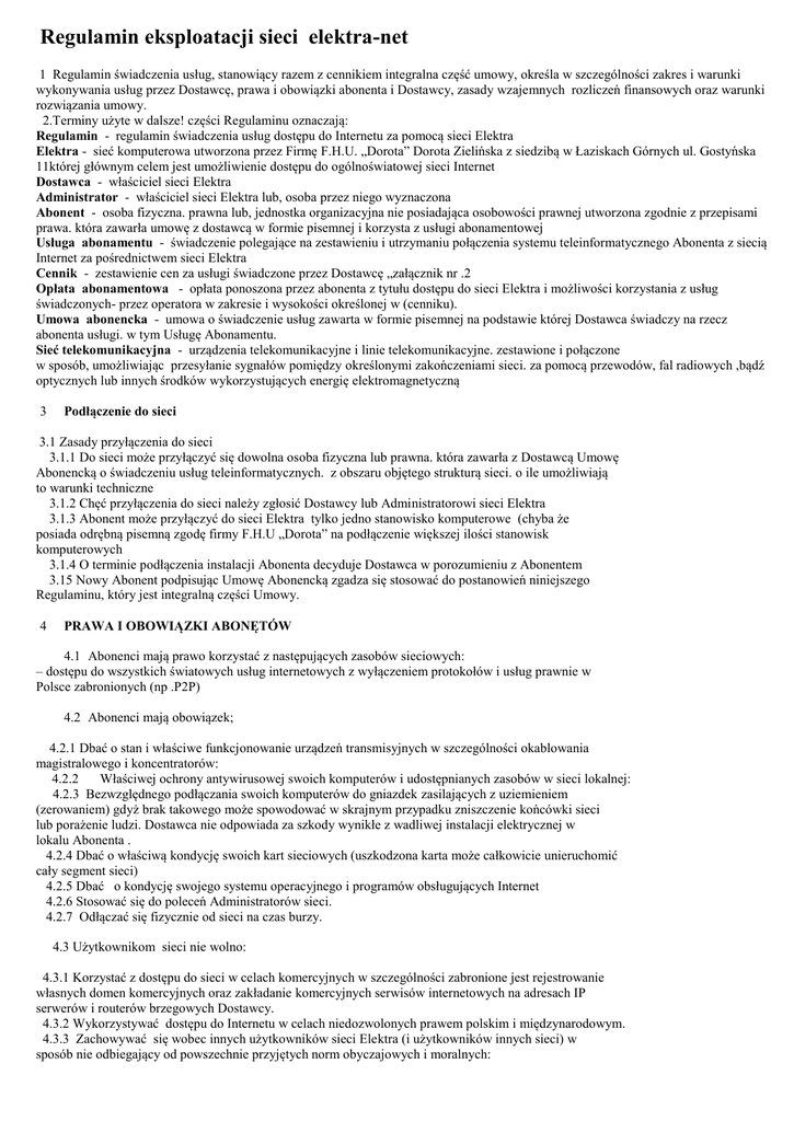 Regulamin eksploatacji sieci elektra-net 1 Regulamin świadczenia usług, stanowiący razem z cennikiem integralna część umowy, określa w szczególności zakres i warunki wykonywania usług przez Dostawcę, prawa i obowiązki abonenta i Dostawcy, zasady wzajemnych rozliczeń finansowych oraz warunki rozwiązania umowy. 2.Terminy użyte w dalsze! części Regulaminu oznaczają: Regulamin - regulamin świadczenia usług dostępu do Internetu za pomocą sieci Elektra Elektra - sieć komputerowa utworzona przez Firmę F.H.U. „Dorota” Dorota Zielińska z siedzibą w Łaziskach Górnych ul. Gostyńska 11której głównym celem jest umożliwienie dostępu do ogólnoświatowej sieci Internet Dostawca - właściciel sieci Elektra Administrator - właściciel sieci Elektra lub, osoba przez niego wyznaczona Abonent - osoba fizyczna. prawna lub, jednostka organizacyjna nie posiadająca osobowości prawnej utworzona zgodnie z przepisami prawa. która zawarła umowę z dostawcą w formie pisemnej i korzysta z usługi abonamentowej Usługa abonamentu - świadczenie polegające na zestawieniu i utrzymaniu połączenia systemu teleinformatycznego Abonenta z siecią Internet za pośrednictwem sieci Elektra Cennik - zestawienie cen za usługi świadczone przez Dostawcę „załącznik nr .2 Opłata abonamentowa - opłata ponoszona przez abonenta z tytułu dostępu do sieci Elektra i możliwości korzystania z usług świadczonych- przez operatora w zakresie i wysokości określonej w (cenniku). Umowa abonencka - umowa o świadczenie usług zawarta w formie pisemnej na podstawie której Dostawca świadczy na rzecz abonenta usługi. w tym Usługę Abonamentu. Sieć telekomunikacyjna - urządzenia telekomunikacyjne i linie telekomunikacyjne. zestawione i połączone w sposób, umożliwiając przesyłanie sygnałów pomiędzy określonymi zakończeniami sieci. za pomocą przewodów, fal radiowych ,bądź optycznych lub innych środków wykorzystujących energię elektromagnetyczną 3 Podłączenie do sieci 3.1 Zasady przyłączenia do sieci 3.1.1 Do sieci może przyłączyć się dowolna osoba fizyczna lub prawna. która zawarła z Dostawcą Umowę Abonencką o świadczeniu usług teleinformatycznych. z obszaru objętego strukturą sieci. o ile umożliwiają to warunki techniczne 3.1.2 Chęć przyłączenia do sieci należy zgłosić Dostawcy lub Administratorowi sieci Elektra 3.1.3 Abonent może przyłączyć do sieci Elektra tylko jedno stanowisko komputerowe (chyba że posiada odrębną pisemną zgodę firmy F.H.U „Dorota” na podłączenie większej ilości stanowisk komputerowych 3.1.4 O terminie podłączenia instalacji Abonenta decyduje Dostawca w porozumieniu z Abonentem 3.15 Nowy Abonent podpisując Umowę Abonencką zgadza się stosować do postanowień niniejszego Regulaminu, który jest integralną części Umowy. 4 PRAWA I OBOWIĄZKI ABONĘTÓW 4.1 Abonenci mają prawo korzystać z następujących zasobów sieciowych: – dostępu do wszystkich światowych usług internetowych z wyłączeniem protokołów i usług prawnie w Polsce zabronionych (np .P2P) 4.2 Abonenci mają obowiązek; 4.2.1 Dbać o stan i właściwe funkcjonowanie urządzeń transmisyjnych w szczególności okablowania magistralowego i koncentratorów: 4.2.2 Właściwej ochrony antywirusowej swoich komputerów i udostępnianych zasobów w sieci lokalnej: 4.2.3 Bezwzględnego podłączania swoich komputerów do gniazdek zasilających z uziemieniem (zerowaniem) gdyż brak takowego może spowodować w skrajnym przypadku zniszczenie końcówki sieci lub porażenie ludzi. Dostawca nie odpowiada za szkody wynikłe z wadliwej instalacji elektrycznej w lokalu Abonenta . 4.2.4 Dbać o właściwą kondycję swoich kart sieciowych (uszkodzona karta może całkowicie unieruchomić cały segment sieci) 4.2.5 Dbać o kondycję swojego systemu operacyjnego i programów obsługujących Internet 4.2.6 Stosować się do poleceń Administratorów sieci. 4.2.7 Odłączać się fizycznie od sieci na czas burzy. 4.3 Użytkownikom sieci nie wolno: 4.3.1 Korzystać z dostępu do sieci w celach komercyjnych w szczególności zabronione jest rejestrowanie własnych domen komercyjnych oraz zakładanie komercyjnych serwisów internetowych na adresach IP serwerów i routerów brzegowych Dostawcy. 4.3.2 Wykorzystywać dostępu do Internetu w celach niedozwolonych prawem polskim i międzynarodowym. 4.3.3 Zachowywać się wobec innych użytkowników sieci Elektra (i użytkowników innych sieci) w sposób nie odbiegający od powszechnie przyjętych norm obyczajowych i moralnych: 4.3.4 Obarczać Administratora winą za trudności w dostępie do Internetu wynikłe z powodu zapchania łącz, w szczególności międzynarodowych lub awarią własnego komputera/systemu oraz z powodów wynikłych z nieznajomości podstaw obsługi komputera, awarii swojego systemu operacyjnego ,bądź innych przyczyn całkowicie niezależnych od Administratora 4.3.5 Działać na szkodę zasobów lub innych użytkowników własnej i innych sieci 4.3.6 Używać oprogramowania uznanego za utrudniające pracę sieci 4.3.7 Abonent nie może wykorzystywać usługi dostarczanej przez Dostawcę do: - wykorzystywania sieci do przejęcia kontroli nad systemami informatycznymi ,bądź ich elementami, do których nie posiada uprawnionego dostępu - wykorzystywania sieci do nieuprawnionego śledzenia danych przesyłanych przez innych użytkowników tej sieci 4.3.8 Abonent poniesie wszelkie ewentualne koszty łącznie z sądowymi związane z naprawą szkód powstałych w skutek niezgodnego z prawem działalności Abonenta lub też przy pomocy jego końcówki za pośrednictwem sieci Internet 4.3.9 Dostawca nie ponosi odpowiedzialności za szkody wynikłe z użycia przez Abonenta lub za pośrednictwem jego końcówki kart płatniczych kodów dostępu do kont bankowych czy innych kont Abonenta 5 Opłaty 5.1 Rodzaj świadczonych usług i wysokość opłat są określone w umowie. Opłaty w umowi