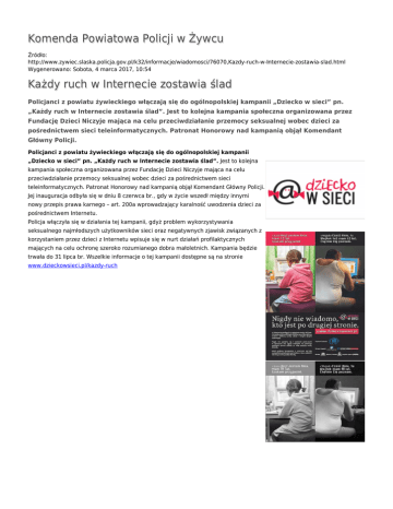 Komenda Powiatowa Policji w Żywcu Źródło: http://www.zywiec.slaska.policja.gov.pl/k32/informacje/wiadomosci/76070,Kazdy-ruch-w-Internecie-zostawia-slad.html Wygenerowano: Sobota, 4 marca 2017, 10:54 Każdy ruch w Internecie zostawia ślad Policjanci z powiatu żywieckiego włączają się do ogólnopolskiej kampanii „Dziecko w sieci” pn. „Każdy ruch w Internecie zostawia ślad”. Jest to kolejna kampania społeczna organizowana przez Fundację Dzieci Niczyje mająca na celu przeciwdziałanie przemocy seksualnej wobec dzieci za pośrednictwem sieci teleinformatycznych. Patronat Honorowy nad kampanią objął Komendant Główny Policji. Policjanci z powiatu żywieckiego włączają się do ogólnopolskiej kampanii „Dziecko w sieci” pn. „Każdy ruch w Internecie zostawia ślad”. Jest to kolejna kampania społeczna organizowana przez Fundację Dzieci Niczyje mająca na celu przeciwdziałanie przemocy seksualnej wobec dzieci za pośrednictwem sieci teleinformatycznych. Patronat Honorowy nad kampanią objął Komendant Główny Policji. Jej inauguracja odbyła się w dniu 8 czerwca br., gdy w życie wszedł między innymi nowy przepis prawa karnego – art. 200a wprowadzający karalność uwodzenia dzieci za pośrednictwem Internetu. Policja włączyła się w działania tej kampanii, gdyż problem wykorzystywania seksualnego najmłodszych użytkowników sieci oraz negatywnych zjawisk związanych z korzystaniem przez dzieci z Internetu wpisuje się w nurt działań profilaktycznych mających na celu ochronę szeroko rozumianego dobra małoletnich. Kampania będzie trwała do 31 lipca br. Wszelkie informacje o tej kampanii dostępne są na stronie www.dzieckowsieci.pl/kazdy-ruch Ocena: 0/5 (0) Tweetnij