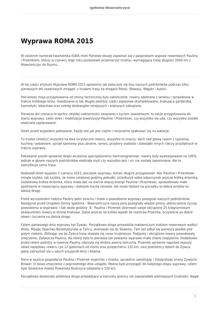 Igołomia-Wawrzeńczyce Wyprawa ROMA 2015 W ostatnim numerze kwartalnika IGWA mieli Państwo okazję zapoznać się z pasjonatami wypraw rowerowych Pauliną i Przemkiem, którzy w czerwcu tego roku postanowili przemierzyć trudną i wymagającą trasę długości 2000 km z Wawrzeńczyc do Rzymu. W tej części artykułu Wyprawa ROMA 2015 opowiemy jak potoczyły się losy naszych podróżników podczas kilku pierwszych dni rowerowych zmagań, z trudami trasy na drogach Polski, Słowacji, Węgier i Austrii. Pod koniec maja przygotowania od strony technicznej były zakończone: rowery odebrane z serwisu i sprawdzone w trakcie krótkiego testu, nieodzowne w tak długiej podróży części zapasowe skompletowane, brakująca garderoba, kosmetyki, lekarstwa oraz szereg drobiazgów mniejszych i większych zakupione. Pierwsze dni czerwca to oprócz zwykłej codzienności związanej z życiem zawodowym, to także przygotowania do startu wyprawy. Lekki stres i mobilizacja towarzyszył Paulinie i Przemkowi, czy wszystko się uda, czy wszystko zostało właściwie zaplanowane. Dzień przed wyjazdem pakowanie. Każdy wie jak jest ciężko i racjonalnie spakować się na wakacje. Tu trzeba zmieścić wszystko na dwa turystyczne rowery, wszystko to znaczy: dach nad głową razem z sypialnią, kuchnią i jedzeniem, sprzęt sportowy plus ubranie, serwis, przybory osobiste i dziesiątki innych rzeczy przydatnych w trakcie wyprawy. Pakowanie poszło sprawnie dzięki wcześniej sporządzonemu harmonogramowi, rowery były wyekwipowane na 100%, jednak w głowie naszych podróżników siedziała myśl czy wszystko jest i nic nie zostało zapomniane. Ale to zweryfikuje sama trasa. Nadszedł dzień wyjazdu 3 czerwca 2015, początek wyprawy, koniec długich przygotowań. Noc Paulinie i Przemkowi minęła szybko, tak szybko, że mimo ustalonej godziny pobudki, przedłużyli sobie odpoczynek jeszcze krótką drzemką. Dodatkowa krótka drzemka, która miała dać na starcie więcej energii Paulinie i Przemkowi, spowodowała małe opóźnienie w rozpoczęciu wyprawy i dołożyła trochę nerwów. Ale może falstart na początku to dobra wróżba na dalszą drogę. Przed wyruszeniem rodzice Pauliny pełni strachu i troski o powodzenie wyprawy pożegnali naszych podróżników. Następnie przed Urzędem Gminy Igołomia - Wawrzeńczyce naszą parę pożegnały władze gminy, jednocześnie życząc powodzenia w wyprawie. I tak około godziny 8, Paulina i Przemek skierowali swoje obciążone 25 kilogramowym ekwipunkiem rowery w stronę Krakowa. Gdzie jeszcze na krótko wpadli do rodziców Przemka, oczywiście po dobre słowo i życzenia na dalszą drogę. Celem pierwszego dnia wyprawy był Żywiec. Początkowo droga prowadziła malowniczym traktem rowerowym wzdłuż Wisły. Mijając Opactwo Benedyktynów w Tyńcu, skierowali się do Skawiny. Tam też odbył się pierwszy posiłek pod gołym niebem. Zbliżając się do Żywca trasa stawała się coraz trudniejsza. Podjazdy i obciążone rowery powodowały zmęczenie. Zwłaszcza Paulina, dla której była to pierwsza tak poważna wyprawa miała chwilę zwątpienia. Dodatkowo przed celem podróży w rowerze Pauliny zdarzyła się drobna awaria łańcucha. Przemek sprawnie naprawił zepsuty układ napędowy roweru i po 12 godzinach od startu oraz przejechaniu 132 km, nasi podróżnicy dotarli do Żywca, gdzie zatrzymali się u swych przyjaciół Alicji i Adama. Rano w asyście gospodarza Paulina i Przemek wyjechali z miasta, uprzednio zwiedzając i fotografując znany Żywiecki Browar. O dziwo zmęczenie z poprzedniego dnia ustąpiło. Można było przystąpić do kolejnego etapu wyprawy, celem było Słowackie miasto Powańska Bystrzyca oddalone o 120 km. Początkowo doskonała asfaltowa droga prowadząca w kierunku granicy nie zapowiadała późniejszych trudności. Nagle 1 Igołomia-Wawrzeńczyce super asfalt zmienił się w ażurowe płyty, po których dalsza jazda na rowerze była nie możliwa. Dodatkowo trasa ostro pięła się w górę. Pozostało Paulinie i Przemkowi pchać na piechotę przez parę kilometrów swe obciążone rowery. Około południa dotarli do granicy Polsko - Słowackiej i na najbliższe szesnaście dni pożegnali się z Ojczyzną. Po przejechaniu granicy oraz parunastu kilometrów w stronę Żyliny przyszedł czas na pierwszy obiad ugotowany na kuchence turystycznej. Paulina pokazała kunszt kucharski, smak rewelacja, po prostu był to obiadek domowy. W Żylinie nasi podróżnicy z racji Bożego Ciała wzięli udział w Mszy Świętej w języku Słowackim. Międzyczasie Przemek odebrał telefon od swych przyjaciół, z którymi wcześniej uczestniczył w paru rowerowych wyprawach po Europie. Koledzy szczegółowo dopytywali o miejsce noclegu w Powańskiej Bystrzycy, sami nie zdradzając swych planów. Część noclegów Paulina i Przemek ustalali za pośrednictwem portalu Warmshowers.pl, który łączy brać kolarską i oferuje możliwość przenocowania podróżników w całej Europie. Wieczorem po dojechaniu do celu trafili do przesympatycznego Jara, mieszkańca Powańskiej Bystrzycy. Jaro mieszkał w bloku, swój sprzęt rowerowy trzymał bez obaw w piwnicy i naszym podróżnikom zaproponował to samo miejsce garażowania. Na Słowacji piwnica w bloku jest bezpiecznym miejscem postoju roweru w przeciwieństwie do polskich realiów. Mimo wszystko mały strach pozostał, czy rano będzie jeszcze, na czym jechać. Ale główna niespodzianka miała dopiero przyjść, a właściwe przyjechać za chwilę. Przyjaciele, którzy chcieli znać miejsce noclegu naszych podróżników przejechali 200 km, by spotkać się z Pauliną i Przemkiem i życzyć im powodzenia w dalszej podróży. Tak mile zakończył się drugi dzień wyprawy. Trzeci dzień rozpoczął się od rewelacyjnego śniadania przygotowanego przez Jara, to jest prawdziwa gościnność. Jaro zaproponował też zmianę założonej trasy, na bardziej widokową i o mniejszym ruchu samochodowym. 