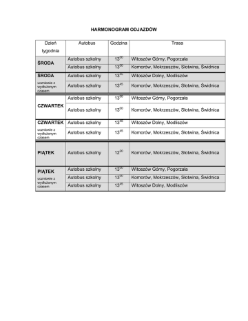 HARMONOGRAM ODJAZDÓW Dzień Autobus Godzina Trasa tygodnia Autobus szkolny 1300 Witoszów Górny, Pogorzała Autobus szkolny 1300 Komorów, Mokrzeszów, Słotwina, Świdnica ŚRODA Autobus szkolny 1345 Witoszów Dolny, Modliszów uczniowie z wydłużonym czasem Autobus szkolny 1345 Komorów, Mokrzeszów, Słotwina, Świdnica Autobus szkolny 1300 Witoszów Górny, Pogorzała Autobus szkolny 1300 Komorów, Mokrzeszów, Słotwina, Świdnica CZWARTEK Autobus szkolny 1345 Witoszów Dolny, Modliszów uczniowie z wydłużonym czasem Autobus szkolny 1345 Komorów, Mokrzeszów, Słotwina, Świdnica PIĄTEK Autobus szkolny 1220 Komorów, Mokrzeszów, Słotwina, Świdnica PIĄTEK Autobus szkolny 1300 Witoszów Górny, Pogorzała uczniowie z wydłużonym czasem Autobus szkolny 1300 Komorów, Mokrzeszów, Słotwina, Świdnica Autobus szkolny 1345 Witoszów Dolny, Modliszów ŚRODA CZWARTEK