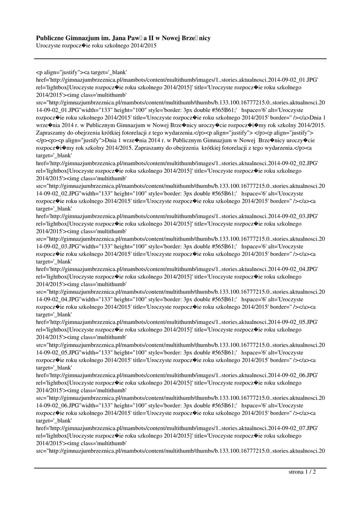 Publiczne Gimnazjum im. Jana Paw�a II w Nowej Brze�nicy Uroczyste rozpocz�ie roku szkolnego 2014/2015 <p align="justify"><a target='_blank' href='http://gimnazjumbrzeznica.pl/mambots/content/multithumb/images/1..stories.aktualnosci.2014-09-02_01.JPG' rel='lightbox[Uroczyste rozpocz�ie roku szkolnego 2014/2015]' title='Uroczyste rozpocz�ie roku szkolnego 2014/2015'><img class='multithumb' src="http://gimnazjumbrzeznica.pl/mambots/content/multithumb/thumbs/b.133.100.16777215.0..stories.aktualnosci.20 14-09-02_01.JPG"width="133" height="100" style='border: 3px double #565B61;' hspace='6' alt='Uroczyste rozpocz�ie roku szkolnego 2014/2015' title='Uroczyste rozpocz�ie roku szkolnego 2014/2015' border='' /></a>Dnia 1 wrze�nia 2014 r. w Publicznym Gimnazjum w Nowej Brze�nicy uroczy�cie rozpocz�i�my rok szkolny 2014/2015. Zapraszamy do obejrzenia krótkiej fotorelacji z tego wydarzenia.</p><p align="justify"> </p><p align="justify"> </p><p><p align="justify">Dnia 1 wrze�nia 2014 r. w Publicznym Gimnazjum w Nowej Brze�nicy uroczy�cie rozpocz�i�my rok szkolny 2014/2015. Zapraszamy do obejrzenia krótkiej fotorelacji z tego wydarzenia.</p><a target='_blank' href='http://gimnazjumbrzeznica.pl/mambots/content/multithumb/images/1..stories.aktualnosci.2014-09-02_02.JPG' rel='lightbox[Uroczyste rozpocz�ie roku szkolnego 2014/2015]' title='Uroczyste rozpocz�ie roku szkolnego 2014/2015'><img class='multithumb' src="http://gimnazjumbrzeznica.pl/mambots/content/multithumb/thumbs/b.133.100.16777215.0..stories.aktualnosci.20 14-09-02_02.JPG"width="133" height="100" style='border: 3px double #565B61;' hspace='6' alt='Uroczyste rozpocz�ie roku szkolnego 2014/2015' title='Uroczyste rozpocz�ie roku szkolnego 2014/2015' border='' /></a><a target='_blank' href='http://gimnazjumbrzeznica.pl/mambots/content/multithumb/images/1..stories.aktualnosci.2014-09-02_03.JPG' rel='lightbox[Uroczyste rozpocz�ie roku szkolnego 2014/2015]' title='Uroczyste rozpocz�ie roku szkolnego 2014/2015'><img class='multithumb' src="http://gimnazjumbrzeznica.pl/mambots/content/multithumb/thumbs/b.133.100.16777215.0..stories.aktualnosci.20 14-09-02_03.JPG"width="133" height="100" style='border: 3px double #565B61;' hspace='6' alt='Uroczyste rozpocz�ie roku szkolnego 2014/2015' title='Uroczyste rozpocz�ie roku szkolnego 2014/2015' border='' /></a><a target='_blank' href='http://gimnazjumbrzeznica.pl/mambots/content/multithumb/images/1..stories.aktualnosci.2014-09-02_04.JPG' rel='lightbox[Uroczyste rozpocz�ie roku szkolnego 2014/2015]' title='Uroczyste rozpocz�ie roku szkolnego 2014/2015'><img class='multithumb' src="http://gimnazjumbrzeznica.pl/mambots/content/multithumb/thumbs/b.133.100.16777215.0..stories.aktualnosci.20 14-09-02_04.JPG"width="133" height="100" style='border: 3px double #565B61;' hspace='6' alt='Uroczyste rozpocz�ie roku szkolnego 2014/2015' title='Uroczyste rozpocz�ie roku szkolnego 2014/2015' border='' /></a><a target='_blank' href='http://gimnazjumbrzeznica.pl/mambots/content/multithumb/images/1..stories.aktualnosci.2014-09-02_05.JPG' rel='lightbox[Uroczyste rozpocz�ie roku szkolnego 2014/2015]' title='Uroczyste rozpocz�ie roku szkolnego 2014/2015'><img class='multithumb' src="http://gimnazjumbrzeznica.pl/mambots/content/multithumb/thumbs/b.133.100.16777215.0..stories.aktualnosci.20 14-09-02_05.JPG"width="133" height="100" style='border: 3px double #565B61;' hspace='6' alt='Uroczyste rozpocz�ie roku szkolnego 2014/2015' title='Uroczyste rozpocz�ie roku szkolnego 2014/2015' border='' /></a><a target='_blank' href='http://gimnazjumbrzeznica.pl/mambots/content/multithumb/images/1..stories.aktualnosci.2014-09-02_06.JPG' rel='lightbox[Uroczyste rozpocz�ie roku szkolnego 2014/2015]' title='Uroczyste rozpocz�ie roku szkolnego 2014/2015'><img class='multithumb' src="http://gimnazjumbrzeznica.pl/mambots/content/multithumb/thumbs/b.133.100.16777215.0..stories.aktualnosci.20 14-09-02_06.JPG"width="133" height="100" style='border: 3px double #565B61;' hspace='6' alt='Uroczyste rozpocz�ie roku szkolnego 2014/2015' title='Uroczyste rozpocz�ie roku szkolnego 2014/2015' border='' /></a><a target='_blank' href='http://gimnazjumbrzeznica.pl/mambots/content/multithumb/images/1..stories.aktualnosci.2014-09-02_07.JPG' rel='lightbox[Uroczyste rozpocz�ie roku szkolnego 2014/2015]' title='Uroczyste rozpocz�ie roku szkolnego 2014/2015'><img class='multithumb' src="http://gimnazjumbrzeznica.pl/mambots/content/multithumb/thumbs/b.133.100.16777215.0..stories.aktualnosci.20 strona 1 / 2 Publiczne Gimnazjum im. Jana Paw�a II w Nowej Brze�nicy Uroczyste rozpocz�ie roku szkolnego 2014/2015 14-09-02_07.JPG"width="133" height="100" style='border: 3px double #565B61;' hspace='6' alt='Uroczyste rozpocz�ie roku szkolnego 2014/2015' title='Uroczyste rozpocz�ie roku szkolnego 2014/2015' border='' /></a><a target='_blank' href='http://gimnazjumbrzeznica.pl/mambots/content/multithumb/images/1..stories.aktualnosci.2014-09-02_08.JPG' rel='lightbox[Uroczyste rozpocz�ie roku szkolnego 2014/2015]' title='Uroczyste rozpocz�ie roku szkolnego 2014/2015'><img class='multithumb' src="http://gimnazjumbrzeznica.pl/mambots/content/multithumb/thumbs/b.133.100.16777215.0..stories.aktualnosci.20 14-09-02_08.JPG"width="133" height="100" style='border: 3px double #565B61;' hspace='6' alt='Uroczyste rozpocz�ie roku szkolnego 2014/2015' title='Uroczyste rozpocz�ie roku szkolnego 2014/2015' border='' /></a> strona 2 / 2