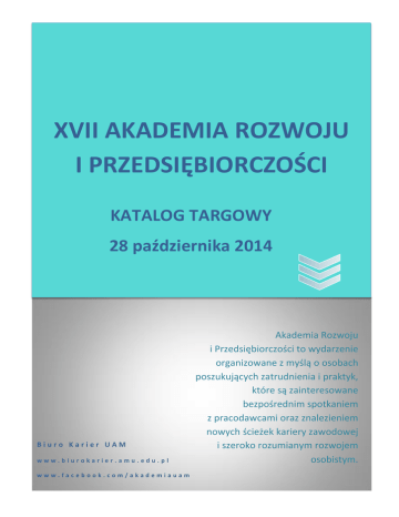 XVII AKADEMIA ROZWOJU I PRZEDSIĘBIORCZOŚCI KATALOG TARGOWY 28 października 2014 Biuro Karier UAM www.biurokarier.amu.edu.pl www.facebook.com/akademiauam Akademia Rozwoju i Przedsiębiorczości to wydarzenie organizowane z myślą o osobach poszukujących zatrudnienia i praktyk, które są zainteresowane bezpośrednim spotkaniem z pracodawcami oraz znalezieniem nowych ścieżek kariery zawodowej i szeroko rozumianym rozwojem osobistym. XVII AKADEMIA ROZWOJU 2014 I PRZEDSIĘBIORCZOŚCI 3 KATALOG TARGOWY PATRONAT MEDIALNY 4 XVII AKADEMIA ROZWOJU 2014 I PRZEDSIĘBIORCZOŚCI 5 KATALOG TARGOWY 6 XVII AKADEMIA ROZWOJU 2014 I PRZEDSIĘBIORCZOŚCI LISTA WYSTAWCÓW – spis treści: arvato Polska ........................................................................................9 Stowarzyszenie OCWP ...........................................................................9 Administration Personnel Services ...................................................... 10 Rule Financial ...................................................................................... 10 Procreate ............................................................................................ 11 DSA Investment .................................................................................. 11 Biuro Karier UAM ................................................................................ 12 Urząd Miasta Poznania ........................................................................ 13 Kariera IT ............................................................................................ 13 DAC Software Polska ........................................................................... 14 Grant Thornton ................................................................................... 14 Atrem ................................................................................................. 15 GoGlobal ............................................................................................. 15 Bank Zachodni WBK ............................................................................ 16 H&M Hennes&Mauritz Logistics .......................................................... 16 Praca.pl ............................................................................................... 17 BAE Systems Poland ............................................................................ 17 GlaxoSmithKline .................................................................................. 18 Sii........................................................................................................ 18 Hays Poland ........................................................................................ 19 Quad/Graphics Europe ........................................................................ 19 BTC Business Technology Consulting .................................................... 20 Samsung R&D Institute Poland ............................................................ 20 LiNA Medical ....................................................................................... 21 Camp Leaders ...................................................................................... 21 Franklin Templeton Investments Poland .............................................. 22 OTTO Polska ........................................................................................ 22 7 KATALOG TARGOWY Volkswagen Poznań............................................................................. 23 JCommerce ......................................................................................... 23 Pearson IOKI ....................................................................................... 24 pracuj.pl .............................................................................................. 24 Henkel Polska...................................................................................... 25 Adecco Poland .................................................................................... 25 Grupa Eurocash ................................................................................... 26 Starter ................................................................................................ 26 Studencka Rada Miasta Poznania ........................................................ 27 Akademickie Inkubatory Przedsiębiorczości ......................................... 27 Regionalny Ośrodek Debaty Międzynarodowej .................................... 28 CARE-ER.pl .......................................................................................... 28 Redexpert ........................................................................................... 29 InQbator PPNT FUAM .......................................................................... 29 Wojewódzki Urząd Pracy w Poznaniu .................................................. 30 Okręgowy Inspektorat Pracy w Poznaniu ............................................. 30 Powiatowy Urząd Pracy w Poznaniu .................................................... 31 Punkt Informacji Europejskiej Europe Direct – Poznań ......................... 31 Wielkopolska Wojewódzka Komenda OHP w Poznaniu ........................ 32 Grupa PrimeSoft.................................................................................. 32 8 XVII AKADEMIA ROZWOJU 2014 I PRZEDSIĘBIORCZOŚCI Nazwa firmy arvato Polska Branża Logistyka, Contact Center, IT, Finanse Kontakt 61 845 13 43 Strona internetowa https://praca.arvato.pl/praca/ Oferta dla kandydata Praktyka, staż, praca Miejsce pracy Poznań, Szczecin Preferowani kandydaci Studenci, absolwenci studiów licencjackich i magisterskich Preferowanie kierunki studiów Kierunki filologiczne, finanse, logistyczne i inne niemiecki, angielski, francuski, włoski, rosyjski, ukraiński, węgierski, hiszpański, holenderski, czeski, słowacki CV, list motywacyjny, rozmowa kwalifikacyjna, assessment Rekrutacja center Języki Nazwa Sto