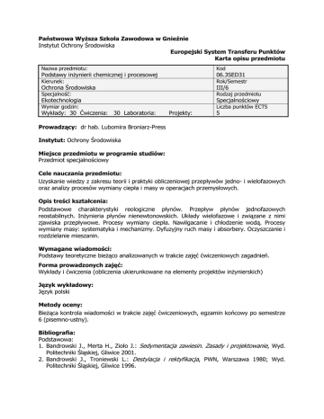 Państwowa Wyższa Szkoła Zawodowa w Gnieźnie Instytut Ochrony Środowiska Europejski System Transferu Punktów Karta opisu przedmiotu Nazwa przedmiotu: Kod Kierunek: Rok/Semestr Specjalność: Rodzaj przedmiotu Podstawy inżynierii chemicznej i procesowej 06.3SED31 Ochrona Środowiska III/6 Ekotechnologia Wymiar godzin: Wykłady: 30 Ćwiczenia: 30 Laboratoria: Specjalnościowy Projekty: Liczba punktów ECTS 5 Prowadzący: dr hab. Lubomira Broniarz-Press Instytut: Ochrony Środowiska Miejsce przedmiotu w programie studiów: Przedmiot specjalnościowy Cele nauczania przedmiotu: Uzyskanie wiedzy z zakresu teorii i praktyki obliczeniowej przepływów jedno- i wielofazowych oraz analizy procesów wymiany ciepła i masy w operacjach przemysłowych. Opis treści kształcenia: Podstawowe charakterystyki reologiczne płynów. Przepływ płynów jednofazowych reostabilnych. Inżynieria płynów nienewtonowskich. Układy wielofazowe i związane z nimi zjawiska przepływowe. Procesy wymiany ciepła. Nawilgacanie i chłodzenie wodą. Procesy wymiany masy: systematyka i mechanizmy. Dyfuzyjny ruch masy i absorbery. Oczyszczanie i rozdzielanie mieszanin. Wymagane wiadomości: Podstawy teoretyczne bieżąco analizowanych w trakcie zajęć ćwiczeniowych zagadnień. Forma prowadzonych zajęć: Wykłady i ćwiczenia (obliczenia ukierunkowane na elementy projektów inżynierskich) Język wykładowy: Język polski Metody oceny: Bieżąca kontrola wiadomości w trakcie zajęć ćwiczeniowych, egzamin końcowy po semestrze 6 (pisemno-ustny). Bibliografia: Podstawowa: 1. Bandrowski J., Merta H., Zioło J.: Sedymentacja zawiesin. Zasady i projektowanie, Wyd. Politechniki Śląskiej, Gliwice 2001. 2. Bandrowski J., Troniewski L.: Destylacja i rektyfikacja, PWN, Warszawa 1980; Wyd. Politechniki Śląskiej, Gliwice 1996. Uzupełniająca: 1. Broniarz-Press L. i inni: Inżynieria Chemiczna i Procesowa. Materiały Pomocnicze. I-III. Wyd. Politechniki Poznańskiej, Poznań 1999-2002, Inżynieria Chemiczna i Procesowa. Laboratorium, Wyd. Politechniki Poznańskiej, Poznań 2000. 2. Ferguson J., Kembłowski Z.: Reologia stosowana płynów, Wyd. Marcus, Łódź 1995. 3. Koch R., Noworyta A.: Procesy mechaniczne w inżynierii chemicznej, WNT, Warszawa 1995. 4. Troniewski L.: Hoblerowskie ujęcie ruchu masy, Wyd. WSI, Opole 1996.