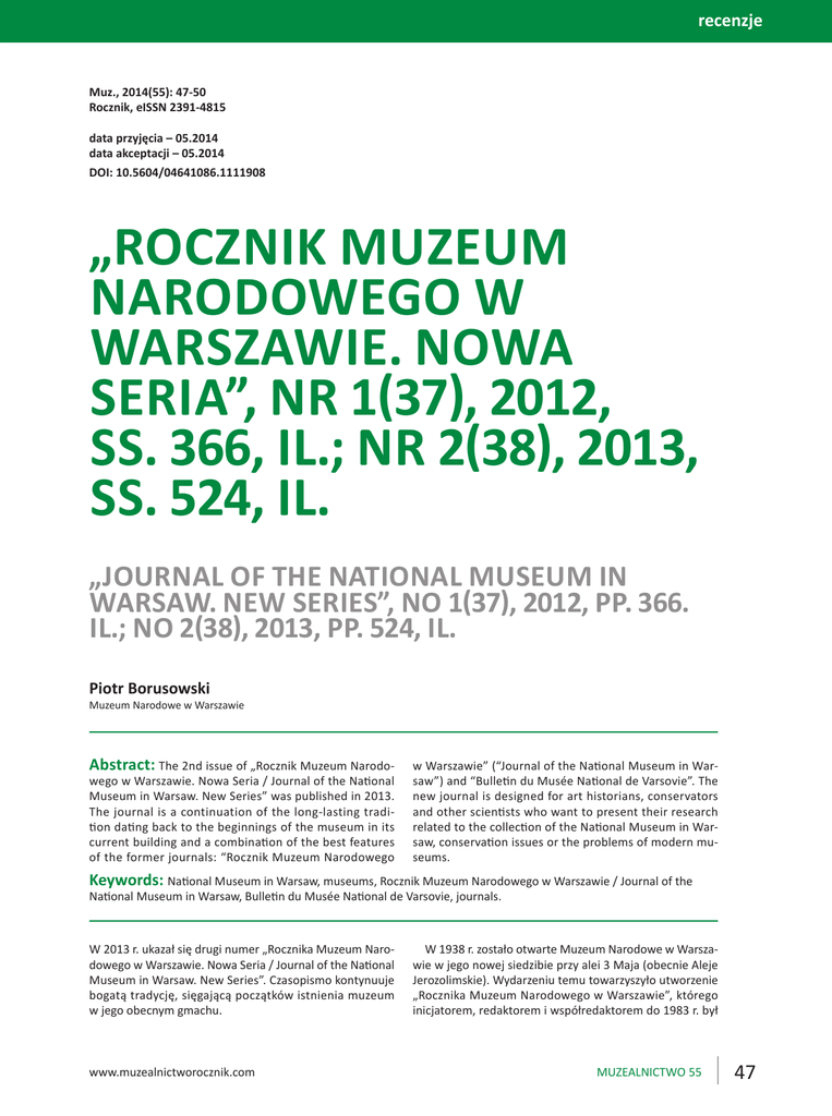 recenzje Muz., 2014(55): 47-50 Rocznik, eISSN 2391-4815 data przyjęcia – 05.2014 data akceptacji – 05.2014 DOI: 10.5604/04641086.1111908 „ROCZNIK MUZEUM NARODOWEGO W WARSZAWIE. NOWA SERIA”, NR 1(37), 2012, SS. 366, IL.; NR 2(38), 2013, SS. 524, IL. „JOURNAL OF THE NATIONAL MUSEUM IN WARSAW. NEW SERIES”, NO 1(37), 2012, PP. 366. IL.; NO 2(38), 2013, PP. 524, IL. Piotr Borusowski Muzeum Narodowe w Warszawie Abstract: The 2nd issue of „Rocznik Muzeum Narodo- wego w Warszawie. Nowa Seria / Journal of the National Museum in Warsaw. New Series” was published in 2013. The journal is a continuation of the long-lasting tradition dating back to the beginnings of the museum in its current building and a combination of the best features of the former journals: “Rocznik Muzeum Narodowego w Warszawie” (“Journal of the National Museum in Warsaw”) and “Bulletin du Musée National de Varsovie”. The new journal is designed for art historians, conservators and other scientists who want to present their research related to the collection of the National Museum in Warsaw, conservation issues or the problems of modern museums. Keywords: National Museum in Warsaw, museums, Rocznik Muzeum Narodowego w Warszawie / Journal of the National Museum in Warsaw, Bulletin du Musée National de Varsovie, journals. W 2013 r. ukazał się drugi numer „Rocznika Muzeum Narodowego w Warszawie. Nowa Seria / Journal of the National Museum in Warsaw. New Series”. Czasopismo kontynuuje bogatą tradycję, sięgającą początków istnienia muzeum w jego obecnym gmachu. www.muzealnictworocznik.com W 1938 r. zostało otwarte Muzeum Narodowe w Warszawie w jego nowej siedzibie przy alei 3 Maja (obecnie Aleje Jerozolimskie). Wydarzeniu temu towarzyszyło utworzenie „Rocznika Muzeum Narodowego w Warszawie”, którego inicjatorem, redaktorem i współredaktorem do 1983 r. był MUZEALNICTWO 55 47 jego dyrektor Stanisław Lorentz. Nakreślony został program czasopisma, w którym miały się ukazywać: 1) rozprawy poświęcone zabytkom stanowiącym własność Muzeum Narodowego w Warszawie i rozprawy wykraczające poza ten obręb, ale tylko w tych wypadkach, gdy nawiązują do zbiorów lub działalności muzeum, 2) materiały z dziejów muzealnictwa i kolekcjonerstwa w Polsce, 3) sprawozdania z działalności pracowni konserwatorskich muzeum, 4) sprawozdania z działalności naukowej i oświatowej muzeum oraz kronika zdarzeń, 5) bibliografia prac i artykułów drukowanych, dotyczących muzeum i jego zbiorów. Pierwszy artykuł, autorstwa samego dyrektora, dotyczył historii muzeum od początku jego istnienia jako Muzeum Sztuk Pięknych w Warszawie, czyli od 1862 roku. Wraz z planami nowego gmachu i bibliografią dotyczącą placówki liczył 102 strony. Kolejne – poświęcone m.in. twórczości Daniela Chodowieckiego, Jana de Braya i Pinturicchia – pokazały, że zbiory muzeum są bardzo różnorodne i zdecydowanie wykraczają poza obszar sztuki polskiej. Decyzja o wydawaniu artykułów przede wszystkim w języku polskim, jedynie z krótkim streszczeniem w języku obcym (opublikowane zostały tylko nieliczne artykuły po francusku, angielsku, niemiecku czy włosku), sprawiła, że „Rocznik” znalazł odbiorców przede wszystkim wśród przedstawicieli rodzimej historii sztuki. Należy jednak podkreślić, że publikowali tu wybitni przedstawiciele polskiej nauki – już w pierwszym numerze pojawiły się teksty Stefana Kozakiewicza, Zygmunta Batowskiego, Henryka Marconiego czy Juliusza Starzyńskiego. W 36 numerach „Rocznika” opublikowane zostały 592 artykuły blisko 240 autorów. Przez ponad 50 lat było to jedno z najważniejszych polskich wydawnictw muzealnych. Po raz ostatni ukazało się w 1992 roku. Powstanie w roku 1960 drugiego periodyku, „Bulletin du Musée National de Varsovie”, było inicjatywą prof. Jana Białostockiego. Dostrzegł on potrzebę uzupełnienia działalności wydawniczej instytucji zadaniami, których ze względu na swe założenia nie mógł spełnić „Rocznik”, czyli publikowaniem tekstów o muzeum i jego zbiorach w językach kongresowych. Nastąpił bardzo wyraźny podział na teksty ukazujące się w „Roczniku” (długie studia, podsumowania wieloletnich badań, opisy muzealnych kolekcji pełniące nierzadko funkcję katalogu zbiorów) i te przeznaczone do kwartalnika „Bulletin” – krótsze i, o większym poziomie specjalizacji. We wstępie do pierwszego numeru prof. Lorentz wyraził nadzieję, że czasopismo umożliwi promocję dzieł przechowywanych w Polsce i nawiązanie współpracy w ramach światowej historii sztuki. W kolejnych numerach ukazało się ponad 200 artykułów poświęconych pojedynczym dziełom, kolekcjom i zespołom zabytków ze zbiorów muzeum albo związanych z przechowywanymi w nim dziełami. Publikowali w kwartalniku zarówno pracownicy, jak i naukowcy spoza instytucji, również z zagranicy. Redagowany przez prof. Białostockiego „Bulletin” stał się szanowanym czasopismem, a poza Polską – głównym źródłem informacji o Muzeum Narodowym w Warszawie i jego zbiorach. Wydawany był regularnie (choć często w łączonych numerach) aż do 2009 roku. 48 MUZEALNICTWO 55 Warto dodać, że w ramach porozumienia z Uniwersytetem w Heidelbergu, Muzeum Narodowe w Warszawie udostępniło wszystkie numery „Rocznika” i „Bulletin”. Od 2013 r. na stronie internetowej tamtejszej Biblioteki Uniwersyteckiej umieszczane są sukcesywnie kolejne, zdigitalizowane numery obydwu czasopism. Korzystać z nich mogą nieodpłatnie wszyscy zainteresowani. Różnorodność prowadzonych w muzeum badań jest ogromna, nie wszystkie one znajdują zwieńczenie w postaci katalogu wystaw czy zbiorów. Problemem, szczególnie w ostatnich latach, był w związku z tym brak własnego czasopisma, które umożliwiałoby regularne publikowanie dokonywanych tu odkryć. W 2012 r. decyzją dyrektor Agnieszki Morawińskiej powołany został „Rocz