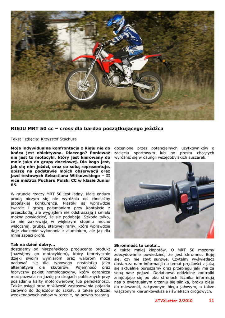 RIEJU MRT 50 cc – cross dla bardzo początkującego jeźdźca Tekst i zdjęcia: Krzysztof Stachura Moja indywidualna konfrontacja z Rieju nie do końca jest obiektywna. Dlaczego? Ponieważ nie jest to motocykl, który jest kierowany do mnie jako do grupy docelowej. Dla kogo jest, jak się nim jeździ, oraz co sobą reprezentuje, opiszę na podstawię moich obserwacji oraz jazd testowych Sebastiana Witkowskiego – II vice mistrza Pucharu Polski CC w klasie Junior 85. docenione przez potencjalnych użytkowników o zacięciu sportowym lub po prostu chcących wyróżnić się w dżungli wszędobylskich suszarek. W gruncie rzeczy MRT 50 jest ładny. Małe enduro urodą niczym się nie wyróżnia od chociażby japońskiej konkurencji. Plastiki są wprawdzie twarde i grożą połamaniem przy kontakcie z przeszkodą, ale wyglądem nie odstraszają i śmiało można powiedzieć, że się podobają. Szkoda tylko, że nie zakrywają w większym stopniu mocno widocznej, grubej, stalowej ramy, która wprawdzie daje złudzenie wykonania z aluminium, ale jak dla mnie szpeci profil. Tak na dzień dobry... dostajemy od hiszpańskiego producenta produkt (nazwijmy go motocyklem), który teoretycznie dzięki swoim wymiarom oraz walorom może nadawać się dla typowego nastolatka jako alternatywa dla skuterów. Pojemność oraz fabryczny pakiet homologacyjny, który ogranicza moc pozwala na jazdę po drogach publicznych przy posiadaniu karty motorowerowej lub pełnoletności. Także osiągi oraz możliwość zastosowania pojazdu zarówno do dojazdów do szkoły, a także podczas weekendowych zabaw w terenie, na pewno zostaną Skromność to cnota... a także mniej kłopotów. O MRT 50 możemy zdecydowanie powiedzieć, że jest skromne. Boję się, czy nie zbyt surowe. Czytelny wyświetlacz dostarcza nam informacji na temat prędkości z jaką się aktualnie poruszamy oraz przebiegu jaki ma za sobą nasz pojazd. Dodatkowo oddzielne kontrolki znajdujące się po obu stronach licznika informują nas o ewentualnym grzaniu się silnika, braku oleju do mieszanki, załączonym biegu jałowym, a także włączonym kierunkowskazie i światłach drogowych. ATVXLetter 2/2010 11 Po lewej stronie kierownicy znajduje się sterowanie kierunkowskazami oraz przełącznik świateł mijania i tzw długich, klakson, a także dźwignia ssania. O elektrycznym starterze w tym modelu możemy zapomnieć, dlatego prawa ręka dodaje tylko gazu. Cały pakiet homologacyjny działa bez zarzutu, miękko i elastycznie. Jedyny problem z jakim się spotkałem, to niestety słaba praca kierunkowskazów na wolnych obrotach. Brak akumulatora robi swoje i dla efektywnej pracy przerywacza silnik trzeba trzymać lekko w obrotach. Zbiornik paliwa mieści 6.3 litra płynu (1.1 litra oleju do mieszanki) co przy średnim spalaniu mieszczącym się w powyżej 3 litrów daje nam około 200 kilometrów beztroskiej zabawy. Korek wlewu wg mnie ma dwie wady (nie będę wspominał o braku kluczyka), po pierwsze perforacje na korku służące do zapierania palców są zbyt płytkie i młodsze osoby mogą mieć problem z odkręceniem. Po drugie gwint wewnętrzny w zbiorniku powoduje, że po odkręceniu cały brud znajdujący się wokół, bez ograniczeń wpada do środka. Serce do jazdy... jakim dysponuje Rieju to dwusuwowa jednostka napędowa o zapłonie iskrowym, chłodzona cieczą oraz automatycznym dozownikiem oleju. Pojemność silnika wynosi 50 ccm. Silnik na prawdę rwie się do pracy, delikatne ruszenie kopniaka nawet ręką powoduje już jego start. Dodając do tego 6. stopniową przekładnię manulaną skrzyni biegów to bez problemu rozpędzamy go do homologowanych 45km/h. Teoretyzując, wykręcenie podwojonego wyniku nie jest żadnym problemem, o ile dysponujemy odpowiednią wagą. Ciekawostką jak dla mnie jest brak możliwości odpalenia motocykla na sprzęgle, a co za tym idzie na biegu. Przypadkowe doprowadzenie do zgaśnięcia silnika na środku skrzyżowania będzie wymagało szybkiego szukania luzu. Praca silnika jest równa i adekwatna do pojemności. Dźwięk uchodzący z tłumika niestety nie daje powodów do dumy, amatorskie ucho nie odróżni go od dźwięków komarka. Chciałbym pochwalić Hiszpana... przede wszystkim za hamulce. Tarcza na przednim i tylnym kole oraz przewody w oplocie powodują skuteczne hamowanie w każdych warunkach nie tylko terenowych. Klamka przedniego hamulca, a także sprzęgła pracują lekko, nawet młodsi użytkownicy nie będą mieli problemu z ich częstą obsługą, Plus także trzeba przyznać za zawieszenie, które na pierwszy rzut oka sprawia wrażenie delikat- 12 ATVXLetter 2/2010 nego, ale w gruncie rzeczy swoją pracę wykonuje wystarczająco dobrze nawet pod znacznym obciążeniem. Jazda... po mieście jest wszystkim tym czego oczekujemy od małego miejskiego środka lokomocji. Rieju wjeżdża wszędzie tam, gdzie wjeżdżają skutery, a nawet dalej. Oprócz tego robi to z wielką gracją, zdecydowanie szybciej i sprawniej, no ale na pewno mniej wygodnie. Niestety wąska, twarda kanapa daje nam o sobie znać szybciej niż skuterowa pufa. W tej sytuacji jedynym pocieszeniem jest to, że siedzimy po męsku. Jednym zdaniem MRT-ek na ulicy rzuca się w oczy i budzi zainteresowanie wśród młodszej młodzieży. Offroad w wykonaniu tego pojazdu nie jest czymś nie do zrobienia lub czymś nadzwyczajnym. Spokojnie daje rade po wszelkich szutrach, polnych czy leśnych drogach, a także poligonowych piachach i crossowych trackach, ale to wszystko w granicach pojęcia jazdy turystycznej. Agresywna, sportowa jazda Seby obnażyła kilka mankamentów małego Rieju. Według Sebastiana „jest ona za ciężka i zdecydowanie za słaba. Moc jaką dysponuje ta jednostka napędowa pozostawia wiele do życzenia. Jej brak odczuwalny był na każdym biegu bez wyjątku, kręcenie po wysokościach nie przynosiło oczekiwanych skutków, do tego krótkie przełożenia skrzyni powodowały ciągłą pracę na sprzęgle, wa