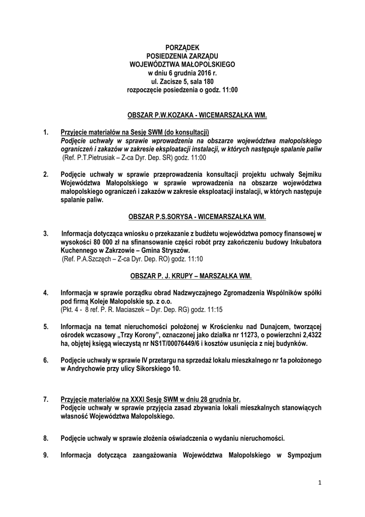 PORZĄDEK POSIEDZENIA ZARZĄDU WOJEWÓDZTWA MAŁOPOLSKIEGO w dniu 6 grudnia 2016 r. ul. Zacisze 5, sala 180 rozpoczęcie posiedzenia o godz. 11:00 OBSZAR P.W.KOZAKA - WICEMARSZAŁKA WM. 1. Przyjęcie materiałów na Sesję SWM (do konsultacji) Podjęcie uchwały w sprawie wprowadzenia na obszarze województwa małopolskiego ograniczeń i zakazów w zakresie eksploatacji instalacji, w których następuje spalanie paliw (Ref. P.T.Pietrusiak – Z-ca Dyr. Dep. SR) godz. 11:00 2. Podjęcie uchwały w sprawie przeprowadzenia konsultacji projektu uchwały Sejmiku Województwa Małopolskiego w sprawie wprowadzenia na obszarze województwa małopolskiego ograniczeń i zakazów w zakresie eksploatacji instalacji, w których następuje spalanie paliw. OBSZAR P.S.SORYSA - WICEMARSZAŁKA WM. 3. Informacja dotycząca wniosku o przekazanie z budżetu województwa pomocy finansowej w wysokości 80 000 zł na sfinansowanie części robót przy zakończeniu budowy Inkubatora Kuchennego w Zakrzowie – Gmina Stryszów. (Ref. P.A.Szczęch – Z-ca Dyr. Dep. RO) godz. 11:10 OBSZAR P. J. KRUPY – MARSZAŁKA WM. 4. Informacja w sprawie porządku obrad Nadzwyczajnego Zgromadzenia Wspólników spółki pod firmą Koleje Małopolskie sp. z o.o. (Pkt. 4 - 8 ref. P. R. Maciaszek – Dyr. Dep. RG) godz. 11:15 5. Informacja na temat nieruchomości położonej w Krościenku nad Dunajcem, tworzącej ośrodek wczasowy „Trzy Korony”, oznaczonej jako działka nr 11273, o powierzchni 2,4322 ha, objętej księgą wieczystą nr NS1T/00076449/6 i kosztów usunięcia z niej budynków. 6. Podjęcie uchwały w sprawie IV przetargu na sprzedaż lokalu mieszkalnego nr 1a położonego w Andrychowie przy ulicy Sikorskiego 10. 7. Przyjęcie materiałów na XXXI Sesję SWM w dniu 28 grudnia br. Podjęcie uchwały w sprawie przyjęcia zasad zbywania lokali mieszkalnych stanowiących własność Województwa Małopolskiego. 8. Podjęcie uchwały w sprawie złożenia oświadczenia o wydaniu nieruchomości. 9. Informacja dotycząca zaangażowania Województwa Małopolskiego w Sympozjum 1 Współczesna Gospodarka i Administracja Publiczna. (Pkt. 9 -12 ref. P.J.Domańska – Z-ca Dyr. Dep. RG) godz. 11:30 10. Informacja w sprawie propozycji uczestnictwa w projekcie Baltic Game Industry – Empowering a Booster for Regional Development (Bałtycki Przemysł Gier – Wzmocnienie przyspieszenia dla regionalnego rozwoju) w ramach Interreg Baltic Sea Region. 11. Podjęcie uchwały w sprawie opinii do „Projektu założeń do planu zaopatrzenia w ciepło, energię elektryczną i paliwa gazowe dla gminy Wolbrom na lata 2016 – 2030”. 12. Podjęcie postanowienia w sprawie udzielenia promesy koncesji na wytwarzanie energii elektrycznej przedsiębiorcy: Przedsiębiorstwo Usług Komunalnych “EMPOL” Sp. z .o.o 13. Podjęcie uchwały w sprawie w sprawie zmian w budżecie Województwa Małopolskiego na 2016 rok w działach 010, 150, 600, 630, 700, 710, 750, 758, 801, 851, 853, 854, 900, 925. (Ref. P.M.Tylek - Skarbnik WM) godz. 11:40 OBSZAR P. S.SORYSA - WICEMARSZAŁKA WM. 14. 15. 16. Podjęcie uchwały w sprawie zawarcia Aneksu nr 1 do Porozumienia Nr IXA/473/ZPO/15 z dnia 10 czerwca 2015 r. w sprawie powierzenia przetwarzania danych osobowych w związku z realizacją Regionalnego Programu Operacyjnego Województwa Małopolskiego na lata 2014-2020 pomiędzy Instytucją Zarządzającą Regionalnym Programem Operacyjnym Województwa Małopolskiego na lata 2014-2020 a Instytucją Pośredniczącą – Małopolskim Centrum Przedsiębiorczości w Krakowie. Podjęcie uchwały w sprawie zawarcia Aneksu nr 1 do Porozumienia Nr IXA/472/ZPO/15 z dnia 10 czerwca 2015 r. w sprawie powierzenia przetwarzania danych osobowych w związku z realizacją Regionalnego Programu Operacyjnego Województwa Małopolskiego na lata 2014-2020 pomiędzy Instytucją Zarządzającą Regionalnym Programem Operacyjnym Województwa Małopolskiego na lata 2014-2020 a Instytucją Pośredniczącą – Wojewódzkim Urzędem Pracy w Krakowie. Podjęcie uchwały w sprawie zawarcia Aneksu nr 1 do Porozumienia Nr IXA/563/ZPO/15 z dnia 11 sierpnia 2015 r. w sprawie powierzenia przetwarzania danych osobowych w związku z realizacją Regionalnego Programu Operacyjnego Województwa Małopolskiego na lata 2014-2020 pomiędzy Instytucją Zarządzającą Regionalnym Programem Operacyjnym Województwa Małopolskiego na lata 2014-2020 a Instytucją Pośredniczącą – Stowarzyszeniem Metropolia Krakowska. (Pkt. 14 - 18 ref. P.J.Szymański – Dyr. Dep. ZPO) godz.11:45 17. Podjęcie uchwały w sprawie ogłoszenia z Dzienniku Urzędowym Województwa Małopolskiego zmiany Małopolskiego Regionalnego Programu Operacyjnego na lata 20072013. 18. Podjęcie uchwały w sprawie zmiany uchwały Nr 334/16 Zarządu Województwa Małopolskiego z dnia 17 marca 2016 roku w sprawie przyjęcia wykazu kandydatów na ekspertów do udziału w wyborze do dofinansowania projektów w ramach Regionalnego Programu Operacyjnego Województwa Małopolskiego na lata 2014-2020. 19. Podjęcie uchwały w sprawie w sprawie uwzględnienia wyników procedury odwoławczej poprzez zatwierdzenie listy projektów ocenionych oraz wybór projektów do dofinansowania 2 w ramach konkursu nr RPMP.01.02.03-IP.01-12-018/15 w ramach Regionalnego Programu Operacyjnego Województwa Małopolskiego na lata 2014 – 2020 w ramach 1 Osi priorytetowej „Gospodarka wiedzy”, Działanie 1.2 „Badania i innowacje w przedsiębiorstwach”, Poddziałanie 1.2.3 „Bony na innowacje”. (Pkt. 19 - 21 ref. P.R.Solecki – Dyr. MCP w Krakowie) godz. 11:50 20. Podjęcie uchwały w sprawie zatwierdzenia listy projektów ocenionych oraz wyboru projektów do dofinansowania w ramach konkursu nr RPMP.01.02.03-IP.01-12-031/16 dla naboru wniosków o dofinansowanie projektów ze środków Regionalnego Programu Operacyjnego Województwa Małopolskiego na lata 2014 – 2020 w ramach 1 Osi priorytetowej „Gospodarka wiedzy”, Działanie 1.2 „Badania i innowa