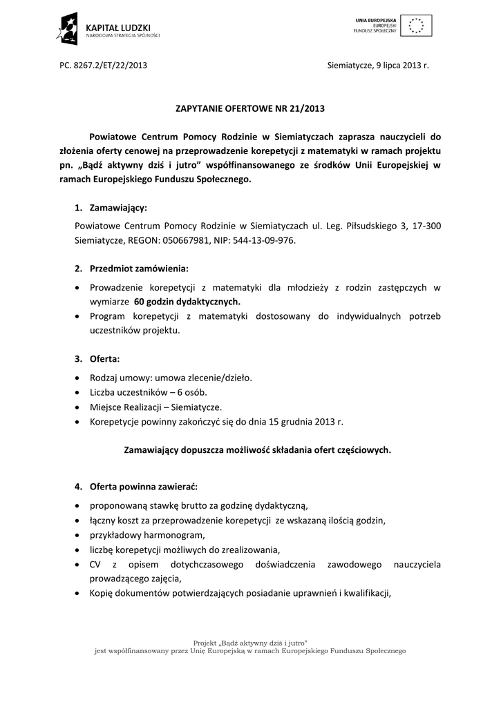 PC. 8267.2/ET/22/2013 Siemiatycze, 9 lipca 2013 r. ZAPYTANIE OFERTOWE NR 21/2013 Powiatowe Centrum Pomocy Rodzinie w Siemiatyczach zaprasza nauczycieli do złożenia oferty cenowej na przeprowadzenie korepetycji z matematyki w ramach projektu pn. „Bądź aktywny dziś i jutro” współfinansowanego ze środków Unii Europejskiej w ramach Europejskiego Funduszu Społecznego. 1. Zamawiający: Powiatowe Centrum Pomocy Rodzinie w Siemiatyczach ul. Leg. Piłsudskiego 3, 17-300 Siemiatycze, REGON: 050667981, NIP: 544-13-09-976. 2. Przedmiot zamówienia: Prowadzenie korepetycji z matematyki dla młodzieży z rodzin zastępczych w wymiarze 60 godzin dydaktycznych. Program korepetycji z matematyki dostosowany do indywidualnych potrzeb uczestników projektu. 3. Oferta: Rodzaj umowy: umowa zlecenie/dzieło. Liczba uczestników – 6 osób. Miejsce Realizacji – Siemiatycze. Korepetycje powinny zakończyć się do dnia 15 grudnia 2013 r. Zamawiający dopuszcza możliwość składania ofert częściowych. 4. Oferta powinna zawierać: proponowaną stawkę brutto za godzinę dydaktyczną, łączny koszt za przeprowadzenie korepetycji ze wskazaną ilością godzin, przykładowy harmonogram, liczbę korepetycji możliwych do zrealizowania, CV z opisem dotychczasowego doświadczenia zawodowego nauczyciela prowadzącego zajęcia, Kopię dokumentów potwierdzających posiadanie uprawnień i kwalifikacji, Projekt „Bądź aktywny dziś i jutro” jest współfinansowany przez Unię Europejską w ramach Europejskiego Funduszu Społecznego Oświadczenie o nie wykonywaniu zlecenia w innym projekcie finansowanym ze środków finansowanych ze środków publicznych w tym w szczególności ze środków Europejskiego Funduszu Społecznego oraz innych wymaganych oświadczeń (oświadczenie w załączniku). 5 Inne wymagania: prowadzenie karty czasu pracy na korepetycjach wraz z rozpisanym zakresem programowym. 6 Kryterium wyboru oferty: oferta zgodna z opisem przedmiotu zamówienia oraz innymi wymaganiami określonymi przez Zamawiającego: cena oferty. 7 Sposób i termin składania ofert: Oferty należy przesłać listownie lub złożyć osobiście pod adresem Powiatowe Centrum Pomocy Rodzinie w Siemiatyczach ul. Leg. Piłsudskiego 3, 17-300 Siemiatycze lub na adres e-mail: [email protected] w terminie do 24 lipca 2013 r. do godziny 15.30. Osoby do kontaktu: Beata Pogorzelska tel. 085 730 05 07, kom. 500 158 766, Elwira Tołwińska-Filipiak kom. 668 377 097. 8 Informacje dotyczące płatności: Zapłata za realizację zamówienia będzie uiszczona przelewem na podstawie rachunku wystawionego przez Wykonawcę w terminie 14 dni z konta Zamawiającego na konto Wykonawcy. Zapytanie ofertowe nie jest dokumentem wiążącym Projekt „Bądź aktywny dziś i jutro” jest współfinansowany przez Unię Europejską w ramach Europejskiego Funduszu Społecznego