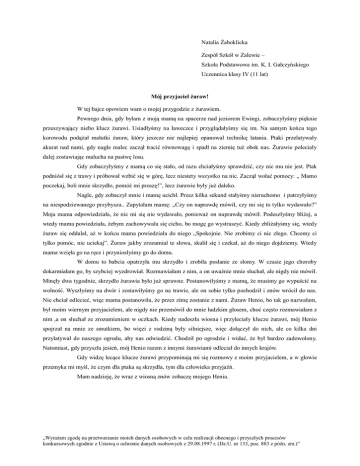 Natalia Żaboklicka Zespół Szkół w Zalewie – Szkoła Podstawowa im. K. I. Gałczyńskiego Uczennica klasy IV (11 lat) Mój przyjaciel żuraw! W tej bajce opowiem wam o mojej przygodzie z żurawiem. Pewnego dnia, gdy byłam z moją mamą na spacerze nad jeziorem Ewingi, zobaczyłyśmy pięknie przeszywający niebo klucz żurawi. Usiadłyśmy na ławeczce i przyglądałyśmy się im. Na samym końcu tego korowodu podążał malutki żuraw, który jeszcze nie najlepiej opanował technikę latania. Ptaki przelatywały akurat nad nami, gdy nagle malec zaczął tracić równowagę i spadł na ziemię tuż obok nas. Żurawie poleciały dalej zostawiając malucha na pastwę losu. Gdy zobaczyłyśmy z mamą co się stało, od razu chciałyśmy sprawdzić, czy nic mu nie jest. Ptak podniósł się z trawy i próbował wzbić się w górę, lecz niestety wszystko na nic. Zaczął wołać pomocy: „ Mamo poczekaj, boli mnie skrzydło, pomóż mi proszę!”, lecz żurawie były już daleko. Nagle, gdy zobaczył mnie i mamę ucichł. Przez kilka sekund stałyśmy nieruchomo i patrzyłyśmy na niespodziewanego przybysza.. Zapytałam mamę: „Czy on naprawdę mówił, czy mi się to tylko wydawało?” Moja mama odpowiedziała, że nic mi się nie wydawało, ponieważ on naprawdę mówił. Podeszłyśmy bliżej, a wtedy mama powiedziała, żebym zachowywała się cicho, bo mogę go wystraszyć. Kiedy zbliżałyśmy się, wtedy żuraw się oddalał, aż w końcu mama powiedziała do niego „Spokojnie. Nie zrobimy ci nic złego. Chcemy ci tylko pomóc, nie uciekaj”. Żuraw jakby zrozumiał te słowa, skulił się i czekał, aż do niego dojdziemy. Wtedy mama wzięła go na ręce i przyniosłyśmy go do domu. W domu to babcia opatrzyła mu skrzydło i zrobiła posłanie ze słomy. W czasie jego choroby dokarmiałam go, by szybciej wyzdrowiał. Rozmawiałam z nim, a on uważnie mnie słuchał, ale nigdy nie mówił. Minęły dwa tygodnie, skrzydło żurawia było już sprawne. Postanowiłyśmy z mamą, że musimy go wypuścić na wolność. Wyszłyśmy na dwór i zostawiłyśmy go na trawie, ale on sobie tylko pochodził i znów wrócił do nas. Nie chciał odlecieć, więc mama postanowiła, że przez zimę zostanie z nami. Żuraw Henio, bo tak go nazwałam, był moim wiernym przyjacielem, ale nigdy nie przemówił do mnie ludzkim głosem, choć często rozmawiałam z nim ,a on słuchał ze zrozumieniem w oczkach. Kiedy nadeszła wiosna i przyleciały klucze żurawi, mój Henio spojrzał na mnie ze smutkiem, bo więzi z rodziną były silniejsze, więc dołączył do nich, ale co kilka dni przylatywał do naszego ogrodu, aby nas odwiedzić. Chodził po ogrodzie i widać, że był bardzo zadowolony. Natomiast, gdy przyszła jesień, mój Henio razem z innymi żurawiami odleciał do innych krajów. Gdy widzę lecące klucze żurawi przypominają mi się rozmowy z moim przyjacielem, a w głowie przemyka mi myśl, że czym dla ptaka są skrzydła, tym dla człowieka przyjaźń. Mam nadzieję, że wraz z wiosną znów zobaczę mojego Henia. „Wyrażam zgodę na przetwarzanie moich danych osobowych w celu realizacji obecnego i przyszłych procesów konkursowych zgodnie z Ustawą o ochronie danych osobowych z 29.08.1997 r. (Dz.U. nr 133, poz. 883 z późn. zm.)”