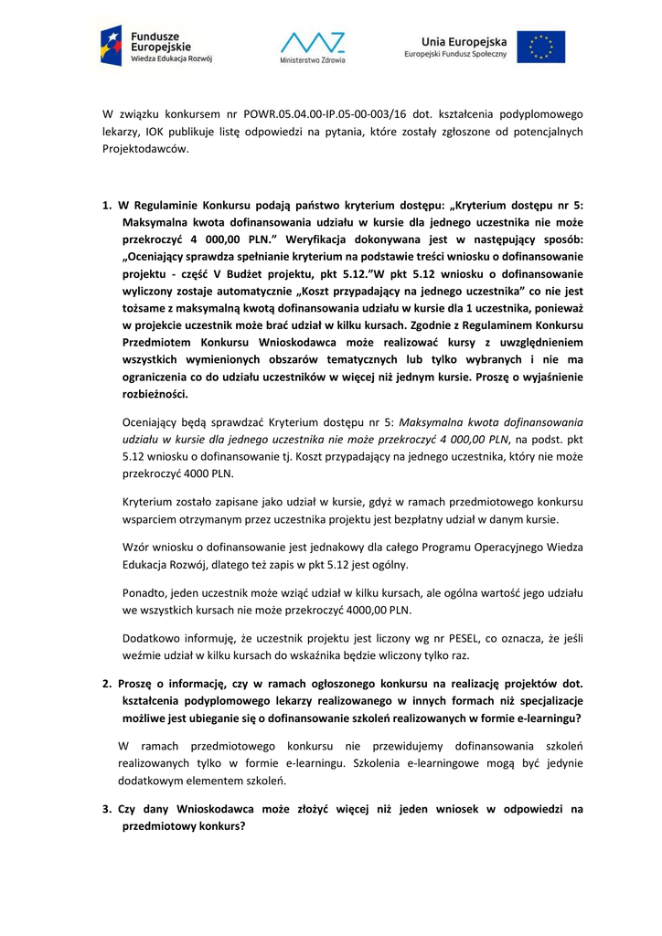 W związku konkursem nr POWR.05.04.00-IP.05-00-003/16 dot. kształcenia podyplomowego lekarzy, IOK publikuje listę odpowiedzi na pytania, które zostały zgłoszone od potencjalnych Projektodawców. 1. W Regulaminie Konkursu podają państwo kryterium dostępu: „Kryterium dostępu nr 5: Maksymalna kwota dofinansowania udziału w kursie dla jednego uczestnika nie może przekroczyć 4 000,00 PLN.” Weryfikacja dokonywana jest w następujący sposób: „Oceniający sprawdza spełnianie kryterium na podstawie treści wniosku o dofinansowanie projektu - część V Budżet projektu, pkt 5.12.”W pkt 5.12 wniosku o dofinansowanie wyliczony zostaje automatycznie „Koszt przypadający na jednego uczestnika” co nie jest tożsame z maksymalną kwotą dofinansowania udziału w kursie dla 1 uczestnika, ponieważ w projekcie uczestnik może brać udział w kilku kursach. Zgodnie z Regulaminem Konkursu Przedmiotem Konkursu Wnioskodawca może realizować kursy z uwzględnieniem wszystkich wymienionych obszarów tematycznych lub tylko wybranych i nie ma ograniczenia co do udziału uczestników w więcej niż jednym kursie. Proszę o wyjaśnienie rozbieżności. Oceniający będą sprawdzać Kryterium dostępu nr 5: Maksymalna kwota dofinansowania udziału w kursie dla jednego uczestnika nie może przekroczyć 4 000,00 PLN, na podst. pkt 5.12 wniosku o dofinansowanie tj. Koszt przypadający na jednego uczestnika, który nie może przekroczyć 4000 PLN. Kryterium zostało zapisane jako udział w kursie, gdyż w ramach przedmiotowego konkursu wsparciem otrzymanym przez uczestnika projektu jest bezpłatny udział w danym kursie. Wzór wniosku o dofinansowanie jest jednakowy dla całego Programu Operacyjnego Wiedza Edukacja Rozwój, dlatego też zapis w pkt 5.12 jest ogólny. Ponadto, jeden uczestnik może wziąć udział w kilku kursach, ale ogólna wartość jego udziału we wszystkich kursach nie może przekroczyć 4000,00 PLN. Dodatkowo informuję, że uczestnik projektu jest liczony wg nr PESEL, co oznacza, że jeśli weźmie udział w kilku kursach do wskaźnika będzie wliczony tylko raz. 2. Proszę o informację, czy w ramach ogłoszonego konkursu na realizację projektów dot. kształcenia podyplomowego lekarzy realizowanego w innych formach niż specjalizacje możliwe jest ubieganie się o dofinansowanie szkoleń realizowanych w formie e-learningu? W ramach przedmiotowego konkursu nie przewidujemy dofinansowania szkoleń realizowanych tylko w formie e-learningu. Szkolenia e-learningowe mogą być jedynie dodatkowym elementem szkoleń. 3. Czy dany Wnioskodawca może złożyć więcej niż jeden wniosek w odpowiedzi na przedmiotowy konkurs? Regulamin konkursu nie ogranicza liczby składnych wniosków. Niemniej, w ramach projektu mogą być organizowane różne kursy i nie ma potrzeby występowania z oddzielnymi projektami dla różnych tematycznie kursów. Dlatego też IOK zaleca składanie jednego wniosku przez danego Wnioskodawcę. 4. Wybór wykonawcy – czy jest dopuszczona możliwość odstępstwa od zasady konkurencyjności w przypadku prowadzenia stałej współpracy z wykonawcą? Chodzi o przypadek zatrudnienia wykładowców do prowadzenia szkoleń, którzy prowadzą własną działalność gospodarczą i współpracują z Wnioskodawcą od wielu lat. W przypadku prowadzenia stałej współpracy z wykonawcą nie ma możliwości odstąpienia od zasady konkurencyjności. 5. Programy szkoleniowe pisane językiem efektów kształcenia – czy mamy powoływać na zapisy jakiegoś dokumentu, standardów? IOK nie wymaga odniesienia się do konkretnego dokumentu wskazującego na standardy efektów kształcenia. 6. Czy przykładowe oferty do sprzętu dydaktycznego należy załączyć do wniosku? Przykładowe oferty do sprzętu dydaktycznego nie należy załączać do wniosku o dofinansowanie. 7. W regulaminie jest mowa o poprawie współpracy i komunikacji pomiędzy lekarzami POZ i specjalistami jako jeden z efektów projektów w tym działaniu. Czy mamy przewidzieć jakieś szkolenia w tym względzie? Poprawa współpracy i komunikacji pomiędzy lekarzami POZ i specjalistami ma być efektem prowadzonych w ramach programu szkoleń, nie zaś tematem szkolenia. 8. Czy w ramach projektu możliwe jest w celu przeprowadzenia kursu wynajęcie sali u podmiotu zewnętrznego? Jeżeli tak to czy jest to koszt bezpośredni czy pośredni ? Czy kwalifikowalny będzie koszt wynajmu sprzętu np. aparatu usg od podmiotu zewnętrznego ? Jeżeli tak to czy należy to zaliczyć do kosztów pośrednich czy bezpośrednich? Czy zakup środków zużywalnych np. rękawiczki, żel do usg itp. (rzeczy konieczne do przeprowadzenia ćwiczeń) są kosztem kwalifikowalnym? Jeżeli tak to czy należy go zaliczyć do kosztów pośrednich czy bezpośrednich? W ramach projektu możliwe jest przeprowadzenie kursu w sali wynajętej u podmiotu zewnętrznego. Jest to koszt bezpośredni. Nie ma również wykluczenia odnoszącego się do wynajmu sprzętu, który również traktowany jest jako koszt bezpośredni. Zakup środków zużywalnych niezbędnych do prowadzenia kursów również jest kosztem kwalifikowalnym w ramach kosztów bezpośrednich. 9. Czy lekarze zatrudnieni w podmiotach leczniczych, o których mowa w art. 4 Ustawy o działalności leczniczej (instytucjonalnych) będą kwalifikowanymi uczestnikami szkoleń? Czy jako ich zatrudnienie będzie uznane udzielanie świadczeń leczniczych na podstawie bycia wspólnikiem albo właścicielem podmiotu, osobą prowadzącą działalność gospodarczą i świadcząca sługi lecznicze osobiście? Czy w takich wypadkach potrzebna jest odrębna umowa podmiotu z lekarzem, który udziela świadczeń? Uczestnikami szkoleń mogą być lekarze zatrudnieni (bez względu na formę zatrudnienia) zarówno w podmiotach, o których mowa w art. 4 Ustawy o działalności leczniczej, jak również w podmiotach o których mowa w art. 5 Ustawy. 10. Czy lekarze POZ prowadzący własną działalność