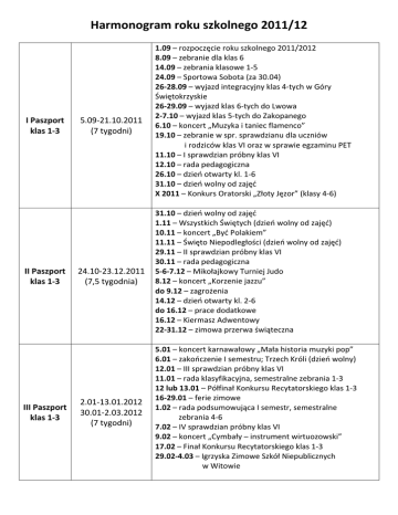 Harmonogram roku szkolnego 2011/12 I Paszport klas 1-3 II Paszport klas 1-3 III Paszport klas 1-3 5.09-21.10.2011 (7 tygodni) 24.10-23.12.2011 (7,5 tygodnia) 2.01-13.01.2012 30.01-2.03.2012 (7 tygodni) 1.09 – rozpoczęcie roku szkolnego 2011/2012 8.09 – zebranie dla klas 6 14.09 – zebrania klasowe 1-5 24.09 – Sportowa Sobota (za 30.04) 26-28.09 – wyjazd integracyjny klas 4-tych w Góry Świętokrzyskie 26-29.09 – wyjazd klas 6-tych do Lwowa 2-7.10 – wyjazd klas 5-tych do Zakopanego 6.10 – koncert „Muzyka i taniec flamenco” 19.10 – zebranie w spr. sprawdzianu dla uczniów i rodziców klas VI oraz w sprawie egzaminu PET 11.10 – I sprawdzian próbny klas VI 12.10 – rada pedagogiczna 26.10 – dzień otwarty kl. 1-6 31.10 – dzień wolny od zajęć X 2011 – Konkurs Oratorski „Złoty Jęzor” (klasy 4-6) 31.10 – dzień wolny od zajęć 1.11 – Wszystkich Świętych (dzień wolny od zajęć) 10.11 – koncert „Być Polakiem” 11.11 – Święto Niepodległości (dzień wolny od zajęć) 29.11 – II sprawdzian próbny klas VI 30.11 – rada pedagogiczna 5-6-7.12 – Mikołajkowy Turniej Judo 8.12 – koncert „Korzenie jazzu” do 9.12 – zagrożenia 14.12 – dzień otwarty kl. 2-6 do 16.12 – prace dodatkowe 16.12 – Kiermasz Adwentowy 22-31.12 – zimowa przerwa świąteczna 5.01 – koncert karnawałowy „Mała historia muzyki pop” 6.01 – zakończenie I semestru; Trzech Króli (dzień wolny) 12.01 – III sprawdzian próbny klas VI 11.01 – rada klasyfikacyjna, semestralne zebrania 1-3 12 lub 13.01 – Półfinał Konkursu Recytatorskiego klas 1-3 16-29.01 – ferie zimowe 1.02 – rada podsumowująca I semestr, semestralne zebrania 4-6 7.02 – IV sprawdzian próbny klas VI 9.02 – koncert „Cymbały – instrument wirtuozowski” 17.02 – Finał Konkursu Recytatorskiego klas 1-3 29.02-4.03 – Igrzyska Zimowe Szkół Niepublicznych w Witowie IV Paszport klas 1-3 5.03-27.04.2012 (7 tygodni) przerwa majowa 30.04-4.05.2012 V Paszport klas 1-3 7.05-8.06.2012 (5 tygodni) Zielona Szkoła 18-22.06.2012 ostatni tydzień 25-29.06.2012 6.03 – V sprawdzian próbny klas VI 8.03 – koncert „O tańcach towarzyskich” 10.03 – Pływacka Sobota (za 2.05) 14.03 – rada pedagogiczna 15.03 – Międzynarodowy Konkurs Matematyczny „Kangur” 28.03 – dzień otwarty kl. 1-6 3.04 – Sprawdzian po VI klasie 5-10.04 – wiosenna przerwa świąteczna 12.04 – koncert „O instrumentach smyczkowych” 14.04 – pierwsza spowiedź dla klas 2 21.04 – Igrzyska Matematyczne Szkół Niepublicznych 25.04 – rada pedagogiczna dni wolne od zajęć (odrobione) 9.05 – zebrania klasowe 1-6 + dzień otwarty (przedmioty) 10.05 – koncert „Znane arie operowe i pieśni”; Test Wałbrzyski klas 3, 4, 5 13.05 – I Komunia Św. (kl. 2) godz. 1030 19.05 – Święto Szkoły (za 4.05) 20.05 – rocznica I Komunii Św. (kl. 3) godz. 900 20-26.05 – wyjazd klas 5-tych do Londynu 25.05 – prace dodatkowe (ostateczny termin) 7.06 – Boże Ciało (dzień wolny) 8.06 – dzień wolny od zajęć 11-15.06 – Tydzień Teatru Angielskiego klasy 1-4, 6 12.06 – rada klasyfikacyjna 13.06 – rada zatwierdzająca, ostatnie zebrania klasowe 14.06 – „Koncert piosenki wakacyjnej” 27.06 – Wieczór Teatralny z „Białymi Butami Prezydenta” 28.06 – rada podsumowująca 29.06 – zakończenie roku szkolnego Wakacje: 30.06-31.08.2012