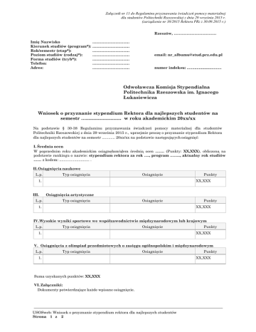 Załącznik nr 11 do Regulaminu przyznawania świadczeń pomocy materialnej dla studentów Politechniki Rzeszowskiej z dnia 29 września 2015 r. (zarządzenie nr 38/2015 Rektora PRz z 30.09.2015 r.) Rzeszów, …………………………… Imię Nazwisko Kierunek studiów (program*): Rok/semestr (etap*): Poziom studiów (rodzaj*): Forma studiów (tryb*): Telefon: Adres: ……………………….. ……………………….. ……………………….. ……………………….. ……………………….. ……………………….. ……………………….. email: [email protected] numer indeksu: ................................ Odwoławcza Komisja Stypendialna Politechnika Rzeszowska im. Ignacego Łukasiewicza Wniosek o przyznanie stypendium Rektora dla najlepszych studentów na semestr …........................... w roku akademickim 20xx/xx Na podstawie § 30-38 Regulaminu przyznawania świadczeń pomocy materialnej dla studentów Politechniki Rzeszowskiej z dnia 29 września 2015 r., uprzejmie proszę o przyznanie stypendium Rektora dla najlepszych studentów na semestr ............ 20xx/xx na podstawie następujących osiągnięć: I. Średnia ocen W poprzednim roku akademickim osiągnęłam/ąłem średnią ocen ……. (Punkty: XX,XXX), obliczoną na podstawie rankingu o nazwie: stypendium rektora za rok …., program …….., aktualny rok studiów …… z kodem: ............................ . II. Osiągnięcia naukowe L.p. Typ osiągnięcia Osiągnięcie 1. III. L.p. Punkty XX,XXX Osiągnięcia artystyczne Typ osiągnięcia Osiągnięcie 1. Punkty XX,XXX IV. Wysokie wyniki sportowe we współzawodnictwie międzynarodowym lub krajowym L.p. Typ osiągnięcia Osiągnięcie 1. Punkty XX,XXX V. Osiągnięcia z olimpiad przedmiotowych o zasięgu ogólnopolskim i międzynarodowym L.p. Typ osiągnięcia Osiągnięcie 1. Suma uzyskanych punktów: XX,XXX VI. Załączniki: Dokumenty potwierdzające każde wpisane osiągnięcie. USOSweb: Wniosek o przyznanie stypendium rektora dla najlepszych studentów Strona 1 z 2 Punkty XX,XXX VII. Oświadczenie Świadomy/a odpowiedzialności karnej za podanie nieprawdziwych danych, w tym odpowiedzialności dyscyplinarnej, aż do wydalenia z Uczelni i obowiązku zwrotu nienależnie pobranego świadczenia pomocy materialnej oświadczam, że przedstawione we wniosku informacje i dane oraz załączone do wniosku dokumenty, dotyczące wnioskowanego świadczenia pomocy materialnej są kompletne i zgodne ze stanem faktycznym. Oświadczam, że zapoznałem/am się z obowiązującym „Regulaminem przyznawania świadczeń pomocy materialnej dla studentów Politechniki Rzeszowskiej” z dnia 29 września 2015 r. Oświadczam, że wyrażam zgodę na przetwarzanie przez Politechnikę Rzeszowską danych osobowych zawartych we wniosku i przyjmuję do wiadomości, iż: 1. Administratorem danych osobowych jest Politechnika Rzeszowska im. Ignacego Łukasiewicza z siedzibą przy al. Powstańców Warszawy 12, 35-959 Rzeszów. 2. Dane osobowe będą gromadzone i przetwarzane w celu wskazanym we wniosku. 3. Posiadam prawo dostępu do treści podanych przeze mnie danych oraz ich poprawiania. 4. Podanie danych jest dobrowolne, przy czym odmowa ich podania jest równoznaczna z brakiem możliwości rozpatrzenia wniosku. Zgodnie z art. 184 ust. 7 ustawy z dnia 27 lipca 2005 r. − Prawo o szkolnictwie wyższym (t. j. Dz. U. z 2012 r. poz. 572, z późn. zm.) świadomy/a odpowiedzialności karnej za złożenie fałszywego oświadczenia oświadczam, że nie będę pobierał/a stypendium rektora na innym kierunku niż ..................................................................... . Oświadczam również, że nie będę pobierał/a świadczeń pomocy materialnej na innej uczelni niż Politechnika Rzeszowska im. Ignacego Łukasiewicza. Rzeszów, ................... .................................................... Podpis studenta USOSweb: Wniosek o przyznanie stypendium rektora dla najlepszych studentów Strona 2 z 2 * nazwy stosowane w systemie USOS