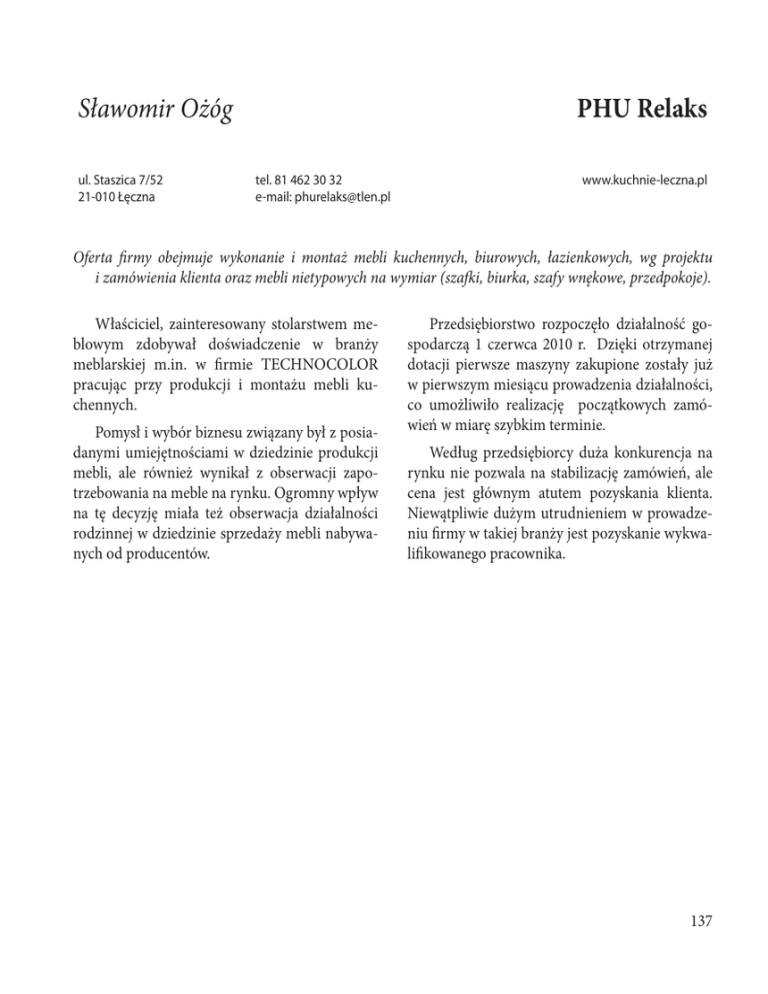 PHU Relaks Sławomir Ożóg ul. Staszica 7/52 21-010 Łęczna tel. 81 462 30 32 e-mail: [email protected] www.kuchnie-leczna.pl Oferta firmy obejmuje wykonanie i montaż mebli kuchennych, biurowych, łazienkowych, wg projektu i zamówienia klienta oraz mebli nietypowych na wymiar (szafki, biurka, szafy wnękowe, przedpokoje). Właściciel, zainteresowany stolarstwem meblowym zdobywał doświadczenie w branży meblarskiej m.in. w firmie TECHNOCOLOR pracując przy produkcji i montażu mebli kuchennych. Pomysł i wybór biznesu związany był z posiadanymi umiejętnościami w dziedzinie produkcji mebli, ale również wynikał z obserwacji zapotrzebowania na meble na rynku. Ogromny wpływ na tę decyzję miała też obserwacja działalności rodzinnej w dziedzinie sprzedaży mebli nabywanych od producentów. Przedsiębiorstwo rozpoczęło działalność gospodarczą 1 czerwca 2010 r. Dzięki otrzymanej dotacji pierwsze maszyny zakupione zostały już w pierwszym miesiącu prowadzenia działalności, co umożliwiło realizację początkowych zamówień w miarę szybkim terminie. Według przedsiębiorcy duża konkurencja na rynku nie pozwala na stabilizację zamówień, ale cena jest głównym atutem pozyskania klienta. Niewątpliwie dużym utrudnieniem w prowadzeniu firmy w takiej branży jest pozyskanie wykwalifikowanego pracownika. 137