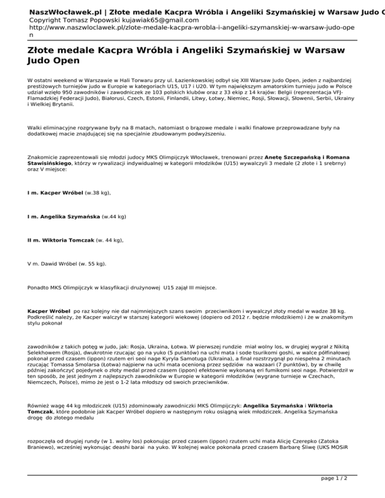 NaszWłocławek.pl | Złote medale Kacpra Wróbla i Angeliki Szymańskiej w Warsaw Judo O Copyright Tomasz Popowski [email protected] http://www.naszwloclawek.pl/zlote-medale-kacpra-wrobla-i-angeliki-szymanskiej-w-warsaw-judo-ope n Złote medale Kacpra Wróbla i Angeliki Szymańskiej w Warsaw Judo Open W ostatni weekend w Warszawie w Hali Torwaru przy ul. Łazienkowskiej odbył się XIII Warsaw Judo Open, jeden z najbardziej prestiżowych turniejów judo w Europie w kategoriach U15, U17 i U20. W tym największym amatorskim turnieju judo w Polsce udział wzięło 950 zawodników i zawodniczek ze 103 polskich klubów oraz z 33 ekip z 14 krajów: Belgii (reprezentacja VFJFlamadzkiej Federacji Judo), Białorusi, Czech, Estonii, Finlandii, Litwy, Łotwy, Niemiec, Rosji, Słowacji, Słowenii, Serbii, Ukrainy i Wielkiej Brytanii. Walki eliminacyjne rozgrywane były na 8 matach, natomiast o brązowe medale i walki finałowe przeprowadzane były na dodatkowej macie znajdującej się na specjalnie zbudowanym podwyższeniu. Znakomicie zaprezentowali się młodzi judocy MKS Olimpijczyk Włocławek, trenowani przez Anetę Szczepańską i Romana Stawisińskiego, którzy w rywalizacji indywidualnej w kategorii młodzików (U15) wywalczyli 3 medale (2 złote i 1 srebrny) oraz V miejsce: I m. Kacper Wróbel (w.38 kg), I m. Angelika Szymańska (w.44 kg) II m. Wiktoria Tomczak (w. 44 kg), V m. Dawid Wróbel (w. 55 kg). Ponadto MKS Olimpijczyk w klasyfikacji drużynowej U15 zajął III miejsce. Kacper Wróbel po raz kolejny nie dał najmniejszych szans swoim przeciwnikom i wywalczył złoty medal w wadze 38 kg. Podkreślić należy, że Kacper walczył w starszej kategorii wiekowej (dopiero od 2012 r. będzie młodzikiem) i że w znakomitym stylu pokonał zawodników z takich potęg w judo, jak: Rosja, Ukraina, Łotwa. W pierwszej rundzie miał wolny los, w drugiej wygrał z Nikitą Selekhowem (Rosja), dwukrotnie rzucając go na yuko (5 punktów) na uchi mata i sode tsurikomi goshi, w walce półfinałowej pokonał przed czasem (ippon) rzutem eri seoi nage Kyryla Samotuga (Ukraina), a finał rozstrzygnął po niespełna 2 minutach rzucając Tomassa Smolarsa (Łotwa) najpierw na uchi mata ocenioną przez sędziów na wazaari (7 punktów), by w chwilę później zakończyć pojedynek o złoty medal przed czasem (ippon) efektownie wykonaną eri fumikomi seoi nage. Potwierdził w ten sposób, że jest jednym z najlepszych zawodników w Europie w kategorii młodzików (wygrane turnieje w Czechach, Niemczech, Polsce), mimo że jest o 1-2 lata młodszy od swoich przeciwników. Również wagę 44 kg młodziczek (U15) zdominowały zawodniczki MKS Olimpijczyk: Angelika Szymańska i Wiktoria Tomczak, które podobnie jak Kacper Wróbel dopiero w następnym roku osiągną wiek młodziczek. Angelika Szymańska drogę do złotego medalu rozpoczęła od drugiej rundy (w 1. wolny los) pokonując przed czasem (ippon) rzutem uchi mata Alicję Czerepko (Zatoka Braniewo), wcześniej wykonując deashi barai na yuko. W kolejnej walce pokonała przed czasem Barbarę Śliwę (UKS MOSiR page 1 / 2 NaszWłocławek.pl | Złote medale Kacpra Wróbla i Angeliki Szymańskiej w Warsaw Judo O Copyright Tomasz Popowski [email protected] http://www.naszwloclawek.pl/zlote-medale-kacpra-wrobla-i-angeliki-szymanskiej-w-warsaw-judo-ope n Jasło) przez dźwignię po rzucie tai otoshi, a w finale również przed czasem (dźwignia) swoją koleżankę klubową Wiktorię Tomczak. Zdobywczyni srebrnego medalu Wiktoria Tomczak wygrała przez rzut z Idą Jeżewską (Akademia Judo Poznań), następnie Weroniką Banaszek (Judo Fight Club Warszawa) i w walce półfinałowej decyzją sędziów z rozstawioną z nr 1 Karoliną Bobilewicz (Wisła Kraków). Dobrze zaprezentował się także Dawid Wróbel, który w wadze 55 kg wywalczył V miejsce wygrywając na dźwignię ze Stasem Uladzimirau (Białoruś), w drugiej rundzie na rzut (ura nage) z Sławomirem Skoczem (Wisła Kraków), a następnie przez trzymanie z Tomaszem Trelą (GKS Czarni Bytom), by w walce półfinałowej przez duszenie przegrać ze zwycięzcą tej kategorii wagowej Deanem Rogelj (Słowenia). O trzecie miejsce przegrał przez trzymanie z Dawidem Zykubkiem ( Koka Jastrzębie). IX m. w tej kategorii wagowej wywalczył Bartosz Bykowski, który w bilansie walk zanotował 2 wygrane i 2 przegrane. Należy podkreślić dalszy postęp Filipa Bazeli, który dobrze zaprezentował się w wadze 81 kg juniorów (U20) w walce z Dzeisonsem Smolarsem (Łotwa). Przegrał w końcowych sekundach dogrywki, w normalnym czasie prowadził na yuko za rzut osoto gari. page 2 / 2