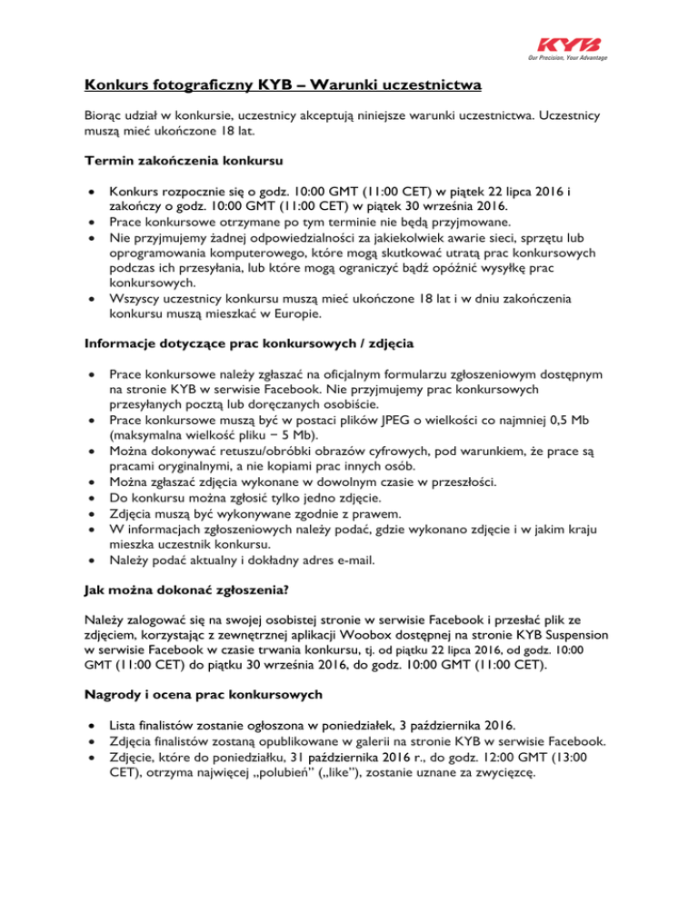 Konkurs fotograficzny KYB – Warunki uczestnictwa Biorąc udział w konkursie, uczestnicy akceptują niniejsze warunki uczestnictwa. Uczestnicy muszą mieć ukończone 18 lat. Termin zakończenia konkursu • • • • Konkurs rozpocznie się o godz. 10:00 GMT (11:00 CET) w piątek 22 lipca 2016 i zakończy o godz. 10:00 GMT (11:00 CET) w piątek 30 września 2016. Prace konkursowe otrzymane po tym terminie nie będą przyjmowane. Nie przyjmujemy żadnej odpowiedzialności za jakiekolwiek awarie sieci, sprzętu lub oprogramowania komputerowego, które mogą skutkować utratą prac konkursowych podczas ich przesyłania, lub które mogą ograniczyć bądź opóźnić wysyłkę prac konkursowych. Wszyscy uczestnicy konkursu muszą mieć ukończone 18 lat i w dniu zakończenia konkursu muszą mieszkać w Europie. Informacje dotyczące prac konkursowych / zdjęcia • • • • • • • • Prace konkursowe należy zgłaszać na oficjalnym formularzu zgłoszeniowym dostępnym na stronie KYB w serwisie Facebook. Nie przyjmujemy prac konkursowych przesyłanych pocztą lub doręczanych osobiście. Prace konkursowe muszą być w postaci plików JPEG o wielkości co najmniej 0,5 Mb (maksymalna wielkość pliku − 5 Mb). Można dokonywać retuszu/obróbki obrazów cyfrowych, pod warunkiem, że prace są pracami oryginalnymi, a nie kopiami prac innych osób. Można zgłaszać zdjęcia wykonane w dowolnym czasie w przeszłości. Do konkursu można zgłosić tylko jedno zdjęcie. Zdjęcia muszą być wykonywane zgodnie z prawem. W informacjach zgłoszeniowych należy podać, gdzie wykonano zdjęcie i w jakim kraju mieszka uczestnik konkursu. Należy podać aktualny i dokładny adres e-mail. Jak można dokonać zgłoszenia? Należy zalogować się na swojej osobistej stronie w serwisie Facebook i przesłać plik ze zdjęciem, korzystając z zewnętrznej aplikacji Woobox dostępnej na stronie KYB Suspension w serwisie Facebook w czasie trwania konkursu, tj. od piątku 22 lipca 2016, od godz. 10:00 GMT (11:00 CET) do piątku 30 września 2016, do godz. 10:00 GMT (11:00 CET). Nagrody i ocena prac konkursowych • • • Lista finalistów zostanie ogłoszona w poniedziałek, 3 października 2016. Zdjęcia finalistów zostaną opublikowane w galerii na stronie KYB w serwisie Facebook. Zdjęcie, które do poniedziałku, 31 października 2016 r., do godz. 12:00 GMT (13:00 CET), otrzyma najwięcej „polubień” („like”), zostanie uznane za zwycięzcę. • • • • • • • O ile to będzie konieczne w celu ustalenia niekwestionowanego zwycięzcy w przypadku remisu, KYB zastrzega sobie prawo zażądania od uczestników konkursu uczestnictwa w konkursie eliminacyjnym („dodatkowa runda”). Osoba, której zdjęcie zostanie uznane za najlepsze, otrzyma nagrodę w postaci zestawu narzędzi do zawieszenia Sykes Pickavant, osoby, które zajmą drugie i trzecie miejsce w konkursie otrzymają drobne zestawy narzędzi do zawieszenia Sykes Pickavant. Nagrody są nieprzenaszalne. Biorąc udział w konkursie, uczestnicy zwalniają firmę KYB GmbH z wszelkich roszczeń i odszkodowań wynikających lub związanych z ich uczestnictwem w konkursie. Uczestnicy zgadzają się przestrzegać niniejszych zasad uczestnictwa w konkursie. Zwycięzcy zostaną powiadomieni o nagrodach w wiadomościach wysłanych na adresy email podane przez nich w zgłoszeniach konkursowych. Firma KYB Europe GmbH nie ponosi odpowiedzialności w przypadku, gdy uczestnik konkursu poda nieprawidłowy lub niepełny adres e-mail. Zwycięzca musi przedstawić ważne prawo jazdy lub inny dowód tożsamości. Obowiązki uczestników konkursu • • • Uczestnicy konkursu mają obowiązek powiadomić firmę KYB Europe GmbH o wszelkich zmianach w zgłoszonych przez siebie danych, w szczególności o zmianach danych kontaktowych w dowolnym czasie przed terminem zakończenia konkursu. Nie wolno zgłaszać zdjęć obscenicznych, wulgarnych, pornograficznych, promujących nienawiść, zawierających groźby, o wydźwięku rasistowskim, bądź seksistowskim lub zdjęć dyskryminujących, bądź takich, które w inny sposób naruszają jakiekolwiek prawa lokalne lub międzynarodowe. Firma KYB Europe GmbH ostatecznie zdecyduje o uznaniu danego zdjęcia za odpowiednie i czy może ono zostać zgłoszone do konkursu. Wykonując zdjęcia z zamiarem zgłoszenia ich do konkursu, należy zachować ostrożność. Firma KYB Europe nie odpowiada (a) wobec osób trzecich z tytułu szkód fizycznego mienia wyrządzonych przez uczestnika podczas wykonywania zdjęcia do konkursu oraz (b) za śmierć lub obrażenia ciała (chyba, że wynikają one z niedbalstwa KYB) podczas wykonywania zdjęć przez uczestnika dla celów niniejszego konkursu, a uczestnik konkursu przejmie odpowiedzialność KYB Europe z tytułu wszelkich takich roszczeń. Prawa autorskie i wykorzystanie zdjęć Zgłaszając zdjęcia do konkursu, uczestnik potwierdza, że: • jest wyłącznym autorem każdego zgłoszonego zdjęcia, i że jest to jego oryginalna praca, • jest właścicielem praw autorskich oraz innych praw własności intelektualnej w przypadku każdego zdjęcia, • zdjęcie nie narusza, ani nie będzie naruszać w przyszłości żadnych praw autorskich lub innych praw osób trzecich, przepisów prawnych czy regulacji, • uzyskał on zgodę osób przedstawionych na zdjęciu, • zdjęcie nie przedstawia żadnych osób poniżej 18 roku życia, • nie udzielił on licencji, ani nie zbył on żadnych praw do zdjęcia, które byłyby sprzeczne z dozwolonymi użyciami opisanymi w poniższej części dotyczącej licencji, • zgadza się na podawanie jego imienia i nazwiska w ramach kampanii reklamowych realizowanych po konkursie, • • • wszelkie zgłoszenia, zdjęcia oraz inne materiały przekazane w ramach konkursu staną się własnością firmy KYB Europe i, przekazując takie materiały, uczestnik udziela firmom KYB Europe GmbH i KYB Americas LLC niewyłącznej, nieo
