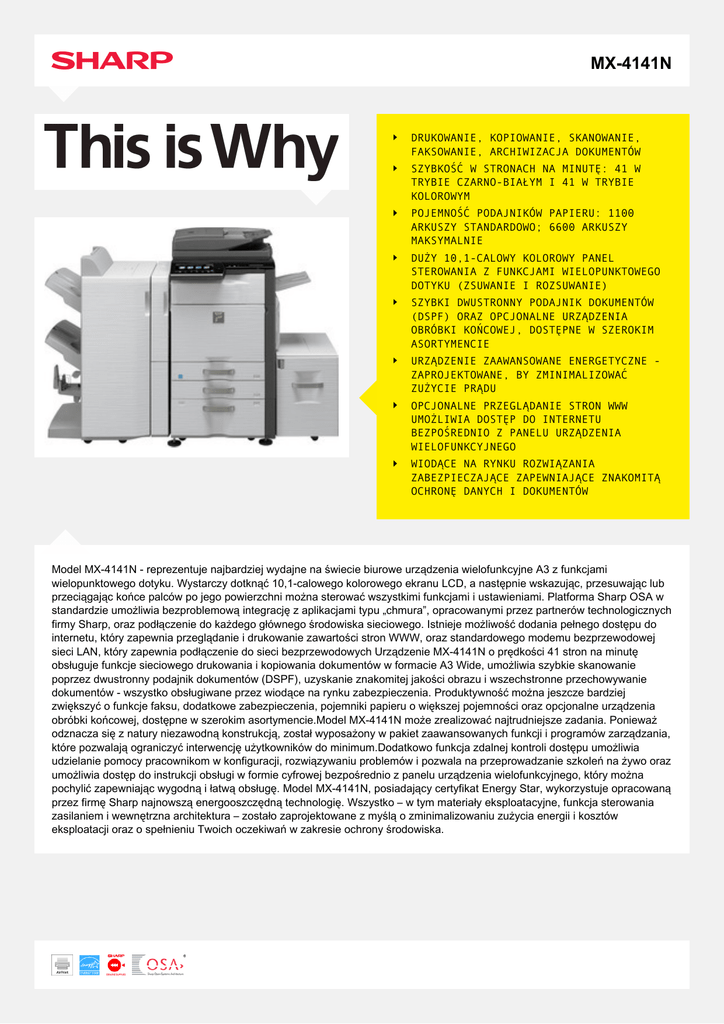 MX-4141N DRUKOWANIE, KOPIOWANIE, SKANOWANIE, FAKSOWANIE, ARCHIWIZACJA DOKUMENTÓW SZYBKOŚĆ W STRONACH NA MINUTĘ: 41 W TRYBIE CZARNO-BIAŁYM I 41 W TRYBIE KOLOROWYM POJEMNOŚĆ PODAJNIKÓW PAPIERU: 1100 ARKUSZY STANDARDOWO; 6600 ARKUSZY MAKSYMALNIE DUŻY 10,1-CALOWY KOLOROWY PANEL STEROWANIA Z FUNKCJAMI WIELOPUNKTOWEGO DOTYKU (ZSUWANIE I ROZSUWANIE) SZYBKI DWUSTRONNY PODAJNIK DOKUMENTÓW (DSPF) ORAZ OPCJONALNE URZĄDZENIA OBRÓBKI KOŃCOWEJ, DOSTĘPNE W SZEROKIM ASORTYMENCIE URZĄDZENIE ZAAWANSOWANE ENERGETYCZNE ZAPROJEKTOWANE, BY ZMINIMALIZOWAĆ ZUŻYCIE PRĄDU OPCJONALNE PRZEGLĄDANIE STRON WWW UMOŻLIWIA DOSTĘP DO INTERNETU BEZPOŚREDNIO Z PANELU URZĄDZENIA WIELOFUNKCYJNEGO WIODĄCE NA RYNKU ROZWIĄZANIA ZABEZPIECZAJĄCE ZAPEWNIAJĄCE ZNAKOMITĄ OCHRONĘ DANYCH I DOKUMENTÓW Model MX-4141N - reprezentuje najbardziej wydajne na świecie biurowe urządzenia wielofunkcyjne A3 z funkcjami wielopunktowego dotyku. Wystarczy dotknąć 10,1-calowego kolorowego ekranu LCD, a następnie wskazując, przesuwając lub przeciągając końce palców po jego powierzchni można sterować wszystkimi funkcjami i ustawieniami. Platforma Sharp OSA w standardzie umożliwia bezproblemową integrację z aplikacjami typu „chmura”, opracowanymi przez partnerów technologicznych firmy Sharp, oraz podłączenie do każdego głównego środowiska sieciowego. Istnieje możliwość dodania pełnego dostępu do internetu, który zapewnia przeglądanie i drukowanie zawartości stron WWW, oraz standardowego modemu bezprzewodowej sieci LAN, który zapewnia podłączenie do sieci bezprzewodowych Urządzenie MX-4141N o prędkości 41 stron na minutę obsługuje funkcje sieciowego drukowania i kopiowania dokumentów w formacie A3 Wide, umożliwia szybkie skanowanie poprzez dwustronny podajnik dokumentów (DSPF), uzyskanie znakomitej jakości obrazu i wszechstronne przechowywanie dokumentów - wszystko obsługiwane przez wiodące na rynku zabezpieczenia. Produktywność można jeszcze bardziej zwiększyć o funkcje faksu, dodatkowe zabezpieczenia, pojemniki papieru o większej pojemności oraz opcjonalne urządzenia obróbki końcowej, dostępne w szerokim asortymencie.Model MX-4141N może zrealizować najtrudniejsze zadania. Ponieważ odznacza się z natury niezawodną konstrukcją, został wyposażony w pakiet zaawansowanych funkcji i programów zarządzania, które pozwalają ograniczyć interwencję użytkowników do minimum.Dodatkowo funkcja zdalnej kontroli dostępu umożliwia udzielanie pomocy pracownikom w konfiguracji, rozwiązywaniu problemów i pozwala na przeprowadzanie szkoleń na żywo oraz umożliwia dostęp do instrukcji obsługi w formie cyfrowej bezpośrednio z panelu urządzenia wielofunkcyjnego, który można pochylić zapewniając wygodną i łatwą obsługę. Model MX-4141N, posiadający certyfikat Energy Star, wykorzystuje opracowaną przez firmę Sharp najnowszą energooszczędną technologię. Wszystko – w tym materiały eksploatacyjne, funkcja sterowania zasilaniem i wewnętrzna architektura – zostało zaprojektowane z myślą o zminimalizowaniu zużycia energii i kosztów eksploatacji oraz o spełnieniu Twoich oczekiwań w zakresie ochrony środowiska. KOPIARKA OGÓLNE Szybkość urządzenia, tryb kolorowy w str./min (A4): 41 Szybkość urządzenia, tryb cz.-b. w str./min (A4): 41 Szybkość urządzenia, tryb kolorowy w str./min (A3): 19 Szybkość urządzenia, tryb cz.-b. w str./min (A3): 19 Format papieru: min.- maks.: A5R - A3W Gramatura papieru (g/m²): 55 - 300 Pojemność: standardowa (arkuszy): 1100 Pojemność: maks. (arkuszy): 6600 Czas nagrzewania (w sekundach): 28 Pamięć ogólna min./maks. (MB): 4096 Twardy dysk: STD Pojemność twardego dysku (GB): 320 Dupleks: STD Wymagania dotyczące źródła zasilania - sieciowe napięcie lokalne (Hz): 200 - 240V, 50/60Hz Pobór mocy (kW): 1,84 Wymiary (mm): 648 x 764 x 960 Waga (kg): 126 PODAJNIK DOKUMENTÓW Pojemność podajnika oryginałów (kartek): 150 FUNKCJA ARCHIWIZACJI DOKUMENTÓW Funkcja archiwizacji dokumentów (std./opcja): STD Pojemność funkcji przechowywania dokumentów - foldery główny i własny (liczba stron): 20000 Pojemność funkcji przechowywania dokumentów - folder tymczasowy (liczba stron): 10000 Programowane zadania: Kopiowanie, drukowanie, druk bezpośredni, skanowanie, wysyłanie faksów Foldery do przechowywania dokumentów: Folder tymczasowy, folder główny, foldery własne (maks. 1000) Przechowywanie faksów poufnych: FAKS Faks (std./opcja): Opcja System kompresji: MH/MR/MMR/JBIG Protokół komunikacyjny: Super G3/G3 Czas transmisji (w sekundach): 3 Szybkość modemu (b/s): 33.600 - 2.400 Rozdzielczość transmisji: STD 203,2 x 97,8 dpi Ultra Fine 406,4 x 391 dpi Format dokumentu (min.): A5 Format dokumentu (maks.): A3 Pamięć (MB): 1024 Poziomy szarości: 256 Programowanie połączeń; skrócone, szybkie: 2000 Rozsyłanie (maks. liczba odbiorców): 500 www.sharp.pl Powered by TCPDF (www.tcpdf.org) Format oryginału (maks.): A3 Czas pierwszej kopii kolorowej (sek.): 6,7 Czas pierwszej kopii cz.-b. (sek.): 4,7 Sorter elektroniczny (standard): Kopiowanie ciągłe (maks. kopii): 999 Rozdzielczość skanowania w trybie cz.-b. (dpi): 600 x 600,600 x 400 Rozdzielczość skanowania w trybie kolorowym (dpi): 600 x 600 Rozdzielczość druku (dpi): 600 x 600,9600 equivalent x 600 (interpolated) Gradacja (liczba odcieni) - tryb czarno-biały: 2 Gradacja (liczba odcieni) - tryb kolorowy: 256 Zakres regulacji skali (%): 25 - 400 (25 - 200 using optional DSPF) in 1% increments Zaprogramowane skale kopiowania: 10 (5R/5E) SKANER Skaner sieciowy (std./opcja): STD Skanowanie w trybach "pull scan" i "push scan": Rozdzielczość w trybie "push scan" (dpi): 100,150, 200,300, 400,600 Rozdzielczość w trybie "pull scan" (dpi): 75,100, 150,200, 300,400, 600,50 to 9600 custom Formaty plików: XPS, TIFF, PDF, Encrypted PDF, Compact PDF, PDF/A, JPEG (colour only) Narzędzia skanera: Network Scan Tool, Sharpdesk, Sharpdesk Mo