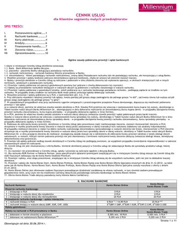 CENNIK USŁUG dla Klientów segmentu małych przedsiębiorstw SPIS TREŚCI: I. II III IV V VI VII Postanowienia ogólne……1 Rachunki bankowe…………1 Karty płatnicze………………4 Kredyty………………………….6 Finansowanie handlu…….7 Zlecenia różne……………...8 Oprocentowanie……………10 I. Ogólne zasady pobierania prowizji i opłat bankowych 1.Użyte w niniejszym Cenniku Usług określenia oznaczają: 1.1. Bank – Bank Millennium Spółka Akcyjna . 1.2. placówka - placówka Banku obsługująca posiadaczy rachunków. 1.3. rachunek rozliczeniowy - rachunek bankowy Klienta prowadzony w Banku. 1.4. zleceniodawca - Klient posiadający rachunek rozliczeniowy, zwany dalej Posiadaczem rachunku lub nie posiadający rachunku, ale korzystający z usług Banku. 3. Wszelkie prowizje i opłaty bankowe pokrywa zleceniodawca operacji bankowej, chyba że umowa lub zlecenie stanowi inaczej. 4. Opłaty i prowizje określone w Cenniku Usług są naliczane i pobierane w dniu złożenia zlecenia lub wykonania operacji, w okresach miesięcznych lub w innych terminach, ustalonych z posiadaczem rachunku. 4.1 Prowizje i opłaty pobierane od operacji gotówkowych powinny być pobrane z chwilą dokonywania tej czynności. 4.2 Opłaty za prowadzenie rachunków bieżących w walutach obcych są pobierane z rachunku walutowego w walucie rachunku. 4.3 Prowizje i opłaty pobierane z pozostałych tytułów, jeżeli pobierane są z rachunku bankowego posiadacza rachunku , podlegają zapłacie ze środków na tym rachunku. W przypadku braku środków na rachunku Bank może pobrać prowizję/opłatę debetując rachunek. 5. Wszystkie prowizje i opłaty pobierane są w PLN, z zastrzeżeniem pkt. 4.2, 7 i 8. 6. Przy obliczaniu wysokości należnej prowizji lub opłaty, kwota poniżej pół grosza ulega zaokrągleniu do pełnego grosza “w dół”, zaś kwota równa lub wyższa od pół grosza ulega zaokrągleniu do pełnego grosza “w górę”. 7. W uzasadnionych przypadkach oraz przy zachowaniu rygorów związanych z przestrzeganiem przepisów Prawa dewizowego, dopuszcza się możliwość pobierania prowizji i/ lub opłat: a) w walucie obcej, pomimo że właściwa stawka została określona w PLN. Stawkę PLN przelicza się wówczas z zastosowaniem kursu kupna tej waluty, określonego w Tabeli kursów walut obcych Banku Millennium SA , obowiązującej w dniu dokonania rozliczenia ze zleceniodawcą (kursu kupna dewiz - w przypadku obciążenia kwotą prowizji rachunku zleceniodawcy, kursu kupna pieniędzy - w przypadku dokonania zapłaty w innej formie), b) w PLN, pomimo że właściwa stawka została ustalona w walucie obcej (dotyczy zwłaszcza stawek prowizji i opłat pobieranych przez banki trzecie). Stawkę w walucie obcej przelicza się wówczas z zastosowaniem kursu sprzedaży tej waluty, określonego w Tabeli kursów walut obcych Banku Millennium SA w dniu dokonania rozliczenia ze zleceniodawcą (kursu sprzedaży dewiz - w przypadku obciążenia kwotą prowizji rachunku zleceniodawcy, kursu sprzedaży pieniędzy - w przypadku dokonania zapłaty w innej formie). 8. Podstawę do obliczenia kwoty prowizji, określonej w Cenniku Usług jako procentowa część realizowanego zlecenia, stanowi równowartość zlecenia w PLN, otrzymana w wyniku przeliczenia kwoty zlecenia w walucie obcej przez zastosowany w danej transakcji kurs walutowy (tabelowy lub ustalony indywidualnie). W przypadku realizacji zlecenia w ciężar/na dobro rachunku walutowego zleceniodawcy (prowadzonego w walucie zlecenia lub innej), równowartość w PLN zlecenia otrzymuje się w wyniku przemnożenia kwoty zlecenia w walucie obcej przez kurs sprzedaży dewiz w danej walucie, określony w Tabeli kursów walut obcych Banku Millennium SA w dniu przyjęcia zlecenia do realizacji. Analogiczną zasadę stosuje się w odniesieniu do obliczania kwoty prowizji należnej z tytułu obsługi zleceń walutowych, w ramach, których termin pobrania prowizji nie jest skorelowany z terminem rozliczenia kwoty zlecenia (dotyczy zwłaszcza obsługi inkasa, akredytywy dokumentowej oraz gwarancji). 9. Prowizje lub opłaty pobrane według stawek określonych w Cenniku Usług nie podlegają zwrotowi, za wyjątkiem przypadku stwierdzenia nieprawidłowości w zakresie zastosowanych zasad ich naliczania. 10. Cennik Usług nie jest równoznaczny z ofertą Banku. Istnienie określonej pozycji w Cenniku usług nie zobowiązuje Banku do sprzedaży produktu/usługi, której dotyczy. 11. Za czynności nie przewidziane w Cenniku Usług, opłaty i prowizje są naliczane zgodnie z decyzją Banku. 12. Dla rachunku ROR Partner w Pakiecie Partner, poza specyficznymi opłatami/prowizjami znajdującymi się w niniejszym Cenniku Usług stosuje się Cennik Usług dla osób fizycznych odnoszący się do konta Konto Osobiste Premium. 14. Prowizje i opłaty, oraz stopy procentowe, znajdujące się w niniejszym Cenniku Usług odnoszą się do wszystkich rachunków, jeśli nie jest to dokładnie inaczej określone. 15. Prowizje i opłaty do: Konta Biznes Start, Konta Biznes Profesja, Konta Biznes PayUp oraz Konta Biznes Oferta Specjalna otwartych do dnia 31.12.2013r. są takie same jak do Konta Biznes. Konto Biznes Start, Konto Biznes Profesja, Konto Biznes PayUp oraz Konto Biznes Oferta Specjalna zostały wycofane z oferty z dniem 01.01.2014r. 16. Konto Biznes Online jest oferowane osobom fizycznym prowadzącym działalność zarobkową na własny rachunek, w tym również osobom prowadzącym gospodarstwa rolne, przy czym nie ma możliwości zamiany dotychczas posiadanego rachunku bankowego na Konto Biznes Online. 17. Oferta Konta Biznes Trade dotyczy posiadaczy karty klienta Makro Cash&Carry. II. RACHUNKI BANKOWE Rachunki Bankowe: Otwarcie rachunku bankowego 1 bieżącego w PLN 2 bieżącego w walucie obcej dla rezydentów 3 bieżącego w walucie obcej dla nierezydentów Prowadzenie rachunku bankowego - opłata miesięczna 4 rachunek bieżący w PLN 5 