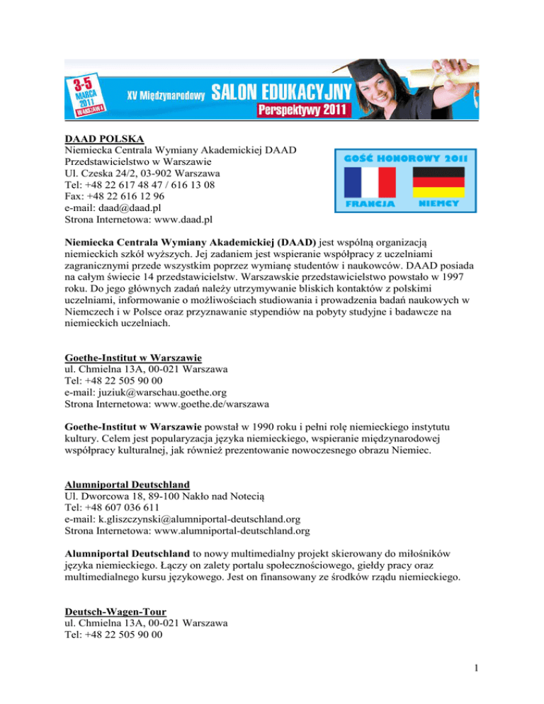DAAD POLSKA Niemiecka Centrala Wymiany Akademickiej DAAD Przedstawicielstwo w Warszawie Ul. Czeska 24/2, 03-902 Warszawa Tel: +48 22 617 48 47 / 616 13 08 Fax: +48 22 616 12 96 e-mail: [email protected] Strona Internetowa: www.daad.pl Niemiecka Centrala Wymiany Akademickiej (DAAD) jest wspólną organizacją niemieckich szkół wyższych. Jej zadaniem jest wspieranie współpracy z uczelniami zagranicznymi przede wszystkim poprzez wymianę studentów i naukowców. DAAD posiada na całym świecie 14 przedstawicielstw. Warszawskie przedstawicielstwo powstało w 1997 roku. Do jego głównych zadań należy utrzymywanie bliskich kontaktów z polskimi uczelniami, informowanie o możliwościach studiowania i prowadzenia badań naukowych w Niemczech i w Polsce oraz przyznawanie stypendiów na pobyty studyjne i badawcze na niemieckich uczelniach. Goethe-Institut w Warszawie ul. Chmielna 13A, 00-021 Warszawa Tel: +48 22 505 90 00 e-mail: [email protected] Strona Internetowa: www.goethe.de/warszawa Goethe-Institut w Warszawie powstał w 1990 roku i pełni rolę niemieckiego instytutu kultury. Celem jest popularyzacja języka niemieckiego, wspieranie międzynarodowej współpracy kulturalnej, jak również prezentowanie nowoczesnego obrazu Niemiec. Alumniportal Deutschland Ul. Dworcowa 18, 89-100 Nakło nad Notecią Tel: +48 607 036 611 e-mail: [email protected] Strona Internetowa: www.alumniportal-deutschland.org Alumniportal Deutschland to nowy multimedialny projekt skierowany do miłośników języka niemieckiego. Łączy on zalety portalu społecznościowego, giełdy pracy oraz multimedialnego kursu językowego. Jest on finansowany ze środków rządu niemieckiego. Deutsch-Wagen-Tour ul. Chmielna 13A, 00-021 Warszawa Tel: +48 22 505 90 00 1 e-mail: [email protected] Strona Internetowa: www.deutsch-wagen-tour.pl Deutsch-Wagen-Tour to akcja promująca język niemiecki oraz kraj naszego zachodniego sąsiada. Projekt skierowany jest do uczniów, rodziców, studentów, nauczycieli, dyrektorów szkół oraz wszystkich osób zainteresowanych językiem niemieckim. Profesjonalnie przygotowani lektorzy, którzy poruszają się specjalnymi autami, przeprowadzają niekonwencjonalne zajęcia z animacji językowej. Uczelnie Niemieckie: TU9 TU9 German Institutes of Technology Anna-Louisa-Karsch-Straße 2, D-10178 Berlin Tel: +49 30 386 39003 e-mail: [email protected] Strona Internetowa: www.tu9.de/studies TU9 is the alliance of the leading Institutes of Technology in Germany: RWTH Aachen, Technische Universität Berlin, Technische Universität Braunschweig, Technische Universität Darmstadt, Technische Universität Dresden, Leibniz Universität Hannover, Karlsruhe Institute of Technology, Technische Universität München and Universität Stuttgart Excellence in Engineering and the sciences Made in Germany! Albstadt-Sigmaringen University Jakobstraße 6, D-72458 Albstadt Tel: +49 7571 732 9205 e-mail: [email protected] Strona Internetowa: www.hs-albsig.de Are you interested in Bachelor and Master degree programmes in Engineering, Business Administration, Textile, Life Science or Informatics? Well, Albstadt-Sigmaringen University in Germany is the place to go! Martin-Luther-University of Halle Universitätsplatz 11, D-06099 Halle Tel: +49 345 552 1308 e-mail: [email protected] Strona Internetowa: www.uni-halle.de Theology, law, economics, medicine, and liberal arts, as e.g. classical history, oriental studies, South and East Asian studies, archaeology, art history, modern languages, music, sport, media studies and the social sciences, chemistry, physics, mathematics, informatics and the life sciences, such as agricultural science and the geo-sciences. 2 Ohm University Nuremberg Bahnhofstraße 87, D-90459 Nuremberg Tel: +49 911 5880 2729 e-mail: [email protected] Strona Internetowa: www.ohm-university.de/ib At the OHM University in Nuremberg we do offer four International Business Programs which are taught in English: - Bachelor in International Business (B.A.) - Bachelor in International Business and Technology (B.Eng.) - Master in International Finance and Economics (M.Sc.) - Master in International Marketing (M.A.) Johannes Gutenberg-Universität Mainz, Université de Bourgogne, Dijon, Uniwersytet Opolski EUROPA-MASTER Uniwersytet Opolski Instytut Politologii Ul. Katowicka 89, 45-061 Opole Tel: +48 77 452 74 60 e-mail: [email protected] Strona Internetowa: www.uni.opole.pl The Johannes Gutenberg-Universität Mainz, the Université de Bourgogne, Dijon, and the Uniwersytet Opolski are about to establish a trinational master’s programme in European Studies (“Europa Master”). All students admitted to the programme spend the first semester in Opole, the second in Mainz and the third in Dijon. 3 Logos: U Mainz_logo.eps; LogoUOpole_ai_zip: logo uB filet.jpg Hochschule Ruhr West – University of Applied Sciences Melinghofer Str. 55, D-45473 Müllheim an der Ruhr Tel: +49 208 88 254 210 e-mail: [email protected] Strona Internetowa: www.hs-ruhrwest.de Hochschule Ruhr West – University of Applied Sciences is a young university committed to high-quality research and teaching. The core subjects are mathematics, computer science, natural sciences and technology. Our students benefit from personalized degree programmes in small groups, interdisciplinary institutes and close contact with the local industry. The Franco-German University Villa Europa – Kohlweg 7, D-66123 Saarbrücken Tel: +49 681 938 12 100 e-mail: [email protected] 3 Strona Internetowa: www.dfh-ufa.org • Promoting Franco-German cooperation in higher education • 130 Double degree binational and trinational study programs • Binational doctoral studies • A network of 180 universities in Germany, France and other European countries • Over 5 000 students and young scientists • Mobility, excellence, networking TestDaF Institute Massenbergstraße 13 b, D-44787 Bochum Tel: +49 234 32 29770 e-mail: [email protected] Strona Internetowa: www.testd