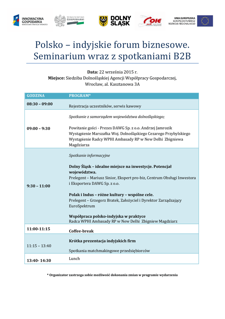 Polsko – indyjskie forum biznesowe. Seminarium wraz z spotkaniami B2B Data: 22 września 2015 r. Miejsce: Siedziba Dolnośląskiej Agencji Współpracy Gospodarczej, Wrocław, al. Kasztanowa 3A GODZINA PROGRAM* 08:30 – 09:00 Rejestracja uczestników, serwis kawowy Spotkanie z samorządem województwa dolnośląskiego; 09:00 – 9:30 Powitanie gości - Prezes DAWG Sp. z o.o. Andrzej Jamrozik Wystąpienie Marszałka Woj. Dolnośląskiego Cezarego Przybylskiego Wystąpienie Radcy WPHI Ambasady RP w New Delhi Zbigniewa Magdziarza Spotkanie informacyjne 9:30 – 11:00 Dolny Śląsk – idealne miejsce na inwestycje. Potencjał województwa. Prelegent – Mariusz Sinior, Ekspert pro-biz, Centrum Obsługi Inwestora i Eksportera DAWG Sp. z o.o. Polak i Indus – różne kultury – wspólne cele. Prelegent – Grzegorz Bratek, Założyciel i Dyrektor Zarządzający EuroSpektrum Współpraca polsko-indyjska w praktyce Radca WPHI Ambasady RP w New Delhi Zbigniew Magdziarz 11:00-11:15 Coffee-break Krótka prezentacja indyjskich firm 11:15 – 13:40 13:40- 14:30 Spotkania matchmakingowe przedsiębiorców Lunch * Organizator zastrzega sobie możliwość dokonania zmian w programie wydarzenia