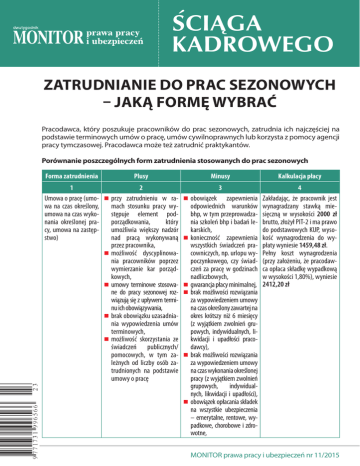 ściąga KADROWEGO Zatrudnianie do prac sezonowych – jaką formę wybrać Pracodawca, który poszukuje pracowników do prac sezonowych, zatrudnia ich najczęściej na podstawie terminowych umów o pracę, umów cywilnoprawnych lub korzysta z pomocy agencji pracy tymczasowej. Pracodawca może też zatrudnić praktykantów. Porównanie poszczególnych form zatrudnienia stosowanych do prac sezonowych Forma zatrudnienia Plusy Minusy Kalkulacja płacy 1 2 3 4 zapewnienia odpowiednich warunków bhp, w tym przeprowadzania szkoleń bhp i badań lekarskich, konieczność zapewnienia wszystkich świadczeń pracowniczych, np. urlopu wypoczynkowego, czy świadczeń za pracę w godzinach nadliczbowych, gwarancja płacy minimalnej, brak możliwości rozwiązania za wypowiedzeniem umowy na czas określony zawartej na okres krótszy niż 6 miesięcy (z wyjątkiem zwolnień grupowych, indywidualnych, likwidacji i upadłości pracodawcy), brak możliwości rozwiązania za wypowiedzeniem umowy na czas wykonania określonej pracy (z wyjątkiem zwolnień grupowych, indywidualnych, likwidacji i upadłości), obowiązek opłacania składek na wszystkie ubezpieczenia – emerytalne, rentowe, wypadkowe, chorobowe i zdrowotne, Zakładając, że pracownik jest wynagradzany stawką miesięczną w wysokości 2000 zł brutto, złożył PIT-2 i ma prawo do podstawowych KUP, wysokość wynagrodzenia do wypłaty wyniesie 1459,48 zł. Pełny koszt wynagrodzenia (przy założeniu, że pracodawca opłaca składkę wypadkową w wysokości 1,80%), wyniesie 2412,20 zł Umowa o pracę (umo- przy zatrudnieniu w rawa na czas określony, mach stosunku pracy wyumowa na czas wykostępuje element podnania określonej praporządkowania, który cy, umowa na zastępumożliwia większy nadzór stwo) nad pracą wykonywaną przez pracownika, możliwość dyscyplinowania pracowników poprzez wymierzanie kar porządkowych, umowy terminowe stosowane do pracy sezonowej rozwiązują się z upływem terminu ich obowiązywania, brak obowiązku uzasadniania wypowiedzenia umów terminowych, możliwość skorzystania ze świadczeń publicznych/ pomocowych, w tym zależnych od liczby osób zatrudnionych na podstawie umowy o pracę obowiązek Monitor prawa pracy i ubezpieczeń nr 11/2015 1 2 3 4 obowiązek opłacania skła- dek na Fundusz Pracy, FGŚP i FEP (pod ustawowymi warunkami), prawo pracownika do wynagrodzenia chorobowego i zasiłków z ubezpieczeń społecznych (co do zasady po 30-dniowym okresie wyczekiwania) Umowa zlecenia możliwość zawarcia nieod- ryzyko płatnej umowy, łatwość rozwiązania umowy, brak uprawnień pracowniczych dla zleceniobiorców, możliwość płacenia wyłącznie wynagrodzenia za czas faktycznie wykonanej pracy, brak obowiązku wypłaty dodatków za pracę w nadgodzinach, porze nocnej, w dni wolne od pracy oraz w święta, nielimitowany czas pracy, brak prawa do minimalnego wynagrodzenia, możliwość wykorzystania tzw. zbiegu tytułów do ubezpieczeń – brak obowiązku opłacania składek na ubezpieczenia społeczne, jeżeli zleceniobiorca podlega im obowiązkowo z innego tytułu, od umowy zlecenia zawartej ze studentem lub uczniem do 26. roku życia nie opłaca się składek ZUS, brak prawa zleceniobiorcy do wynagrodzenia chorobowego zakwestionowania umowy przez PIP i ZUS, jeżeli spełnia ona warunki właściwe dla umowy o pracę, konieczność bardziej szczegółowego uregulowania wzajemnych praw i obowiązków w umowie (niż w przypadku umowy o pracę), konieczność zapewnienia odpowiednich warunków bhp, w przypadku osób, które mają zawartą tylko umowę zlecenia – wysokie koszty składek (obowiązkowo ubezpieczenia emerytalne, rentowe, wypadkowe, zdrowotne, dobrowolne ubezpieczenie chorobowe), obowiązek opłacania składek na Fundusz Pracy i FGŚP (pod ustawowymi warunkami) Monitor prawa pracy i ubezpieczeń nr 11/2015 Przy założeniu, że zleceniobiorca jest wynagradzany stawką miesięczną 2000 zł brutto i zleceniodawca opłaca składkę wypadkową w wysokości 1,80% oraz: 1) zleceniobiorca nie ma innych źródeł przychodów, z których podlega obowiązkowo ubezpieczeniom społecznym – wysokość jego wynagrodzenia do wypłaty (bez składki na ubezpieczenie chorobowe, które jest dobrowolne) wyniesie 1497,07 zł, 2) zleceniobiorca, o którym mowa w pkt 1, przystąpił do dobrowolnego ubezpieczenia chorobowego – jego wynagrodzenie do wypłaty wyniesie 1455,48 zł. Koszt wynagrodzenia zleceniobiorcy w obu przypadkach (pkt 1 i pkt 2) będzie taki sam i wyniesie 2412,20 zł. 3) zleceniobiorca posiada inny tytuł do obowiązkowych ubezpieczeń społecznych i po spełnieniu ustawowych warunków podlega wyłącznie ubezpieczeniu zdrowotnemu – wysokość wynagrodzenia do wypłaty wyniesie 1687 zł, a koszt zleceniodawcy – 2000 zł, 4) zleceniobiorca jest uczniem/ studentem w wieku do 26 lat – wysokość wynagrodzenia do wypłaty wyniesie 1 Umowa o dzieło 2 3 łatwość rozwiązania umowy, brak możliwości wypowie brak uprawnień pracownidzenia umowy, duża samodzielność wykoczych dla wykonawcy dzieła, możliwość płacenia wynanawcy przy wykonywaniu grodzenia wyłącznie za czas faktycznie wykonanej pracy, brak obowiązku wypłaty dodatków za pracę w nadgodzinach, porze nocnej, w dni wolne od pracy oraz w święta, nielimitowany czas pracy, brak prawa do minimalnego wynagrodzenia, brak kosztów związanych z obowiązkiem opłacania składek ZUS (z wyjątkiem umów o dzieło zawartych z własnym pracownikiem), brak prawa do wynagrodzenia chorobowego i świadczeń z ubezpieczeń społecznych łatwa możliwość rezygnacji Zatrudnianie pracow- z pracy pracownika tymczaników tymczasowych sowego, brak większości obowiązków związanych z zatrudnieniem, brak problemu zastępstw w okresie niezdolności do pracy pracownika tymczasowego, pracodawca użytkownik nie wypłaca wynagrodzenia chorobowego ani zasiłków z ubezpieczeń społecznych dzieła, ryzyko zakwestionowania umowy przez