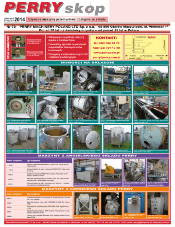Listopad Grudzień 2014 PERRY MACHINERY POLAND LTD Sp. z o.o. 05-850 Ożarów Mazowiecki, ul. Wolności 1a DZIAŁ HANDLOWY Nr 70 Używane maszyny przemysłowe dostępne ze składu Ponad 70 lat na światowym rynku – od ponad 15 lat w Polsce •Odkupujemy za gotówkę maszyny zbędne w Państwa firmie. Sebastian Grzybek [email protected] tel. kom. 512 369 724 Wojciech Kuśmierski [email protected] tel. kom. 512 369 725 •Prowadzimy sprzedaż na podstawie indywidualnie dobranych umów komisowych. •Pomagamy w upłynnieniu całych linii i zakładów produkcyjnych. KONTAKT: tel: (22) 722 32 70 fax: (22) 721 13 48 www.perry.com.pl [email protected] NOWOŚCI NA SKŁADZIE U2133-1 – Suszarnia rozpyłowa ANHYDRO typ LAB S1. Posiada atomizer. Części kontaktowe ze stali ko. U2132 – Nieużywany młynek palcowy VEB. Tarcze mielące o średnicy 220 mm. Napęd 2.2 kW. U2131-1 – Pionowy zbiornik mieszający 350 l ze stali ko. Płaszcz grzewczy i mieszadło łopatowe. 3 szt dostępne. U2134 – Mieszalnik PARIMIX do miksowania substancji sypkich z cieczami w pracy ciągłej. U2130 – Młyn tarczowo-udarowy MŁYNPOL typ MUK-50. Tarcza mieląca o śr. 215 mm. Napęd 2.2 kW. U2133-2 – Ceramiczny młyn kulowy VEB. Pojemność robocza około 60 l. Napęd o mocy 1 kW. U2131-4 – Kwasoodporny zbiornik magazynowy o pojemności 650 l. U794V-1 – Membranowa prasa filtracyjna RITTERSHAUS & BLECHER. Pojemność placka 508 l. U2135-1 – Mieszalnik beczkowy do substancji sypkich COLENOVA AB, beczka o poj. całkowitej 54 l. U2135-2 – Przecierak pionowy do substancji sypkich EMPAK PGM-2. Napęd o mocy 2.2 kW. U2131-5 – Kwasoodporny zbiornik magazynowy o pojemności 650 l, Posiada izolacje termiczną i pokrywę. U2135-3 – Pionowy zbiornik mieszający ze stali ko z płaszczem. Pojemność robocza 6000 l. Mieszadło ramowe. U794V-2 – Reaktor emaliowany TECHNOGLASS. Pojemność 3510 l. Mieszadło kotwicowe 5.5 kW. U795V-1 – Kwasoodporny ekstraktor do pracy ciągłej. Robocza długość ślimaków 15m. Napęd 11 kW. U2136 – Poziomy zbiornik magazynowy typ FK100, pojemność 10000 l. Izolacje termiczną z blachy stalowej. MASZYNY Z ANGIELSKIEGO SKŁADU PERRY Numer urządzenia: Opis urządzenia: L1109-01 Wirówka szybkoobrotowa SHARPLES model AS26. Obroty bąka do 15000 obr/min. L1110-02 Suszarnia fluidalna do pracy wsadowej AEROMATIC S4. Waga wsadu do 150 kg. L1098-02 Tabletkarka rotacyjna MANESTY B4. 25 gniazd. Prasowanie 65 kN. Średnica tabletki do 16 mm. L1060-01 Mieszalnik dyspersyjny NETZSCH PMB VC2500. Poj. robocza 2500l. Dwa mieszadla – dyspergujące i zgarniające. L1057-01 Suszarnia fluidalna do pracy wsadowej GLATT GPCG-1.1. z możliwością granulacji i powlekania produktu. L1121 – Młyn kuleczkowy WAB DYNO MILL typ KD60. Pojemność 60l. Napęd o mocy 44 kW. L1120 - Młyn typu turbo BAUERMEISTER UT63. Tarcza mieląca o śr. 1200 mm. Napęd 185 kW. L1118-02 – Wirówka koszowa ELLEWERK 931 L-II. Średnica bąka 500 mm. Wykonanie stal ko 316Ti. L1110-01 – Używana suszarnia rozpyłowa NIRO model S-25-R. Wydajność odparowania wody do 82 kg/godz. MASZYNY Z CZESKIEGO SKŁADU PERRY Numer urządzenia: Opis urządzenia: H3683-2 Kruszarka dwuwalcowa PSP PREROV. Śr. walców 200 mm x 585 mm szer. 2 szt. dostępne. H3685-1 Mieszalnik stożkowy typu „nauta” PHARMING HV 1000. Poj. robocza 1000 l. H3678-1 Kwasoodporny młynek koloidalny STROJOBAL ZM2. Napęd o mocy 14 kW. H3660 Tabletkarka jednostemplowa FETTE model E1. Prasownie do 1,5 tony. Średnica tabletki do 16 mm. H3600-1 Poziomy młyn młotkowy VEB model 262D. Srednica wirnika 450 mm. Napęd 22 kW. H3615-1 – Wsadowy ceramiczny młyn kulowy VEB. Pojemność całkowita 180 l. Naped 1 kW. H3657 – Młyn pelletyzujący SALMATEC MAXIMA 500/580. Napęd 2 x 75 kW. H3641 – Homogenizator tłokowy APV GAULIN typ 184MC4-STBS. Przepływ 700l/h. Ciśnienie 345 barów. H3658 – Młyn młotkowy z osią pionową TAURUS VM45. Napęd 45 kW. Perry Machinery Poland LTD Sp. z o.o. - 05-850 Ożarów Mazowiecki, ul. Wolności 1a - tel: +48 (22) 722 32 70, fax: +48 (22) 721 13 48; e-mail: [email protected], www.perry.com.pl MŁYNY I ROZDRABNIACZE Numer urządzenia: Opis urządzenia: U1910-5 Młynek koloidalny PUC KOLLOIDTECHNIK JV14. Napęd o mocy 1.5 kW. U2118 Dwuwalcarka z walcami granitowymi BENIER typ AM310. Walce o szer. 250 mm. Naped 1.1 kW. U1931-4 Młynek młotkowy PMPZ TORUŃ. Napęd o mocy 18.5 kW. U2117 Młyn pulweryzujący NAGEMA. Rotor o średnicy 520 mm. Napędy o mocy 11 kW i 7.5 kW U2106-1 Korpus młyna tarczowo-udarowego ze stali węglowej. Tarcza mieląca o śr. 240 mm U2122-1&2 - Młyny palcowe VEB. Tarcze mielące o średnicy 610 mm. Napędy o mocy 17 i 20 kW. U1883-6 – Poziomy młyn kuleczkowy PROFARB EHP-50. Pojemność robocza 50 l. Napęd 45 kW Ex. U2014-7 - Rozdrabniacz wstępny z przesiewaczem. Napęd silnikiem o mocy 7.5 kW. U1973-1 – Pionowy młyn kuleczkowy typu co-ball FRYMA MSM-32. Pojemność robocza 3.4 l. Napęd 22 kW Ex. MASZYNY DO TWORZYW SZTUCZNYCH Numer urządzenia: Opis urządzenia: U1968-3 Mieszalnik typu „zimnego” TRUSIOMA MSK 1000. Poj. 1000 l. Napęd o mocy 15 kW. U2010-3 Zestaw mieszalników T.K. FIELDER typu „gorący” o poj. 500 l i „zimny” o poj 2400 l. U1978-3 Suszarnia wirowa do granulatu tworzyw BKG TEWA 300. Wydajność do 500 kg/godz. U2025-1 Pionowy młynek do tworzyw produkcji polskiej. Napęd o mocy 15 kW. U1916 Wtryskarka PONAR ŻYWIEC FORMOPLAST 395/165. Siła zamknięcia 165 ton. U1984-2 – Suszarka strumieniowa do granulatu tworzyw RIETER AERO 500. Wydajność do 4000 kg/godz U1936-1 – Mieszalnik intensywny T.K. FIELDER TURBO RAPID TRM 300. Kadź o poj. 370 l. Napęd 18 kW. U2085-10 - Młynek nożowy Mecanofil o mocy 4 kW. U1911 – Wtryskarka BATTENFELD 750/300. Siła zamknięcia 75 ton. Rozstaw kolumn 400 x 300 mm. U2088-3 - Komorowa prasa filtracyjna FILTRI DIEMME GIGANTE 1500. Pojemność placka 4300l. U2031-1 – Obrotowy filtr próżniowy. Wykonanie ze stali ko. P