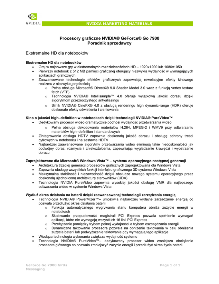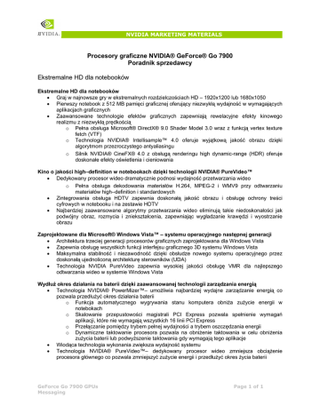 NVIDIA MARKETING MATERIALS Procesory graficzne NVIDIA® GeForce® Go 7900 Poradnik sprzedawcy Ekstremalne HD dla notebooków Ekstremalne HD dla notebooków • Graj w najnowsze gry w ekstremalnych rozdzielczościach HD – 1920x1200 lub 1680x1050 • Pierwszy notebook z 512 MB pamięci graficznej oferujący niezwykłą wydajność w wymagających aplikacjach graficznych • Zaawansowane technologie efektów graficznych zapewniają rewelacyjne efekty kinowego realizmu z niezwykłą prędkością o Pełna obsługa Microsoft® DirectX® 9.0 Shader Model 3.0 wraz z funkcją vertex texture fetch (VTF) o Technologia NVIDIA® Intellisample™ 4.0 oferuje wyjątkową jakość obrazu dzięki algorytmom przezroczystego antyaliasingu o Silnik NVIDIA® CineFX® 4.0 z obsługą renderingu high dynamic-range (HDR) oferuje doskonałe efekty oświetlenia i cieniowania Kino o jakości high–definition w notebookach dzięki technologii NVIDIA® PureVideo™ • Dedykowany procesor wideo dramatycznie podnosi wydajność przetwarzania wideo o Pełna obsługa dekodowania materiałów H.264, MPEG-2 i WMV9 przy odtwarzaniu materiałów high–definition i standardowych • Zintegrowania obsługa HDTV zapewnia doskonałą jakość obrazu i obsługę ochrony treści cyfrowych w notebooku i na zestawie HDTV • Najbardziej zaawansowane algorytmy przetwarzania wideo eliminują takie niedoskonałości jak podwójny obraz, rozmycia i zniekształcenia, zapewniając wygładzanie krawędzi i wyostrzanie obrazu Zaprojektowane dla Microsoft® Windows Vista™ – systemu operacyjnego następnej generacji • Architektura trzeciej generacji procesorów graficznych zaprojektowana dla Windows Vista • Zapewnia obsługę wszystkich funkcji interfejsu graficznego 3D systemu Windows Vista • Maksymalna stabilność i niezawodność dzięki obsłudze nowego systemu operacyjnego przez doskonałą ujednoliconą architekturę sterowników (UDA) • Technologia NVIDIA PureVideo zapewnia wysokiej jakości obsługę VMR dla najlepszego odtwarzania wideo w systemie Windows Vista Wydłuż okres działania na baterii dzięki zaawansowanej technologii zarządzania energią • Technologia NVIDIA® PowerMizer™– umożliwia najbardziej wydajne zarządzanie energią co pozwala przedłużyć okres działania baterii o Funkcja automatycznego wygrywania stanu komputera obniża zużycie energii w notebokach o Skalowanie przepustowości magistrali PCI Express pozwala spełnienie wymagań aplikacji, które nie wymagają wszystkich 16 linii PCI Express o Przełączanie pomiędzy trybem pełnej wydajności a trybem oszczędzania energii o Dynamiczne taktowanie procesora pozwala na obniżenie taktowania w celu obniżenia zużycia baterii lub podwyższenie taktowania gdy wymagają tego aplikacje • Wiodąca technologia wykonania zwiększa wydajność systemu • Technologia NVIDIA® PureVideo™– dedykowany procesor wideo zmniejsza obciążenie procesora głównego co pozwala zmniejszyć zużycie energii i przedłużyć okres życia baterii GeForce Go 7900 GPUs Messaging Page 1 of 1