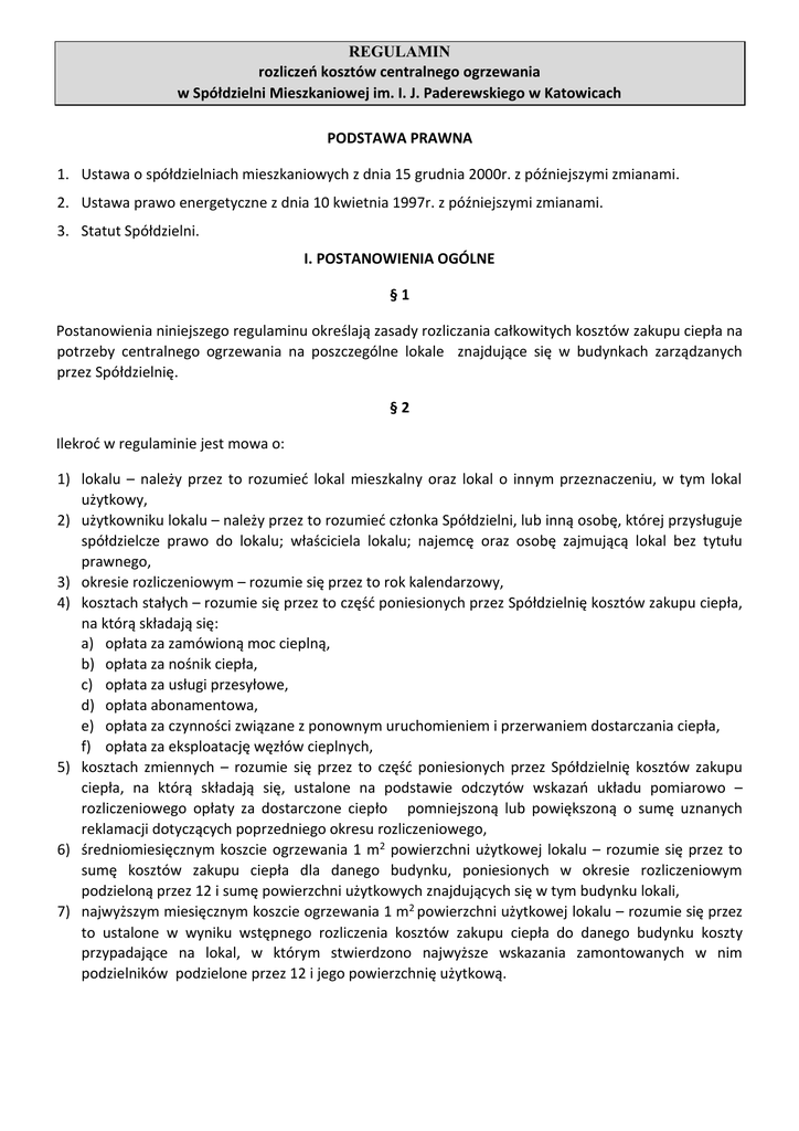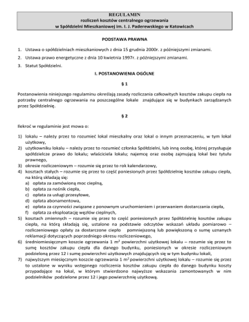 REGULAMIN rozliczeń kosztów centralnego ogrzewania w Spółdzielni Mieszkaniowej im. I. J. Paderewskiego w Katowicach PODSTAWA PRAWNA 1. Ustawa o spółdzielniach mieszkaniowych z dnia 15 grudnia 2000r. z późniejszymi zmianami. 2. Ustawa prawo energetyczne z dnia 10 kwietnia 1997r. z późniejszymi zmianami. 3. Statut Spółdzielni. I. POSTANOWIENIA OGÓLNE §1 Postanowienia niniejszego regulaminu określają zasady rozliczania całkowitych kosztów zakupu ciepła na potrzeby centralnego ogrzewania na poszczególne lokale znajdujące się w budynkach zarządzanych przez Spółdzielnię. §2 Ilekroć w regulaminie jest mowa o: 1) lokalu – należy przez to rozumieć lokal mieszkalny oraz lokal o innym przeznaczeniu, w tym lokal użytkowy, 2) użytkowniku lokalu – należy przez to rozumieć członka Spółdzielni, lub inną osobę, której przysługuje spółdzielcze prawo do lokalu; właściciela lokalu; najemcę oraz osobę zajmującą lokal bez tytułu prawnego, 3) okresie rozliczeniowym – rozumie się przez to rok kalendarzowy, 4) kosztach stałych – rozumie się przez to część poniesionych przez Spółdzielnię kosztów zakupu ciepła, na którą składają się: a) opłata za zamówioną moc cieplną, b) opłata za nośnik ciepła, c) opłata za usługi przesyłowe, d) opłata abonamentowa, e) opłata za czynności związane z ponownym uruchomieniem i przerwaniem dostarczania ciepła, f) opłata za eksploatację węzłów cieplnych, 5) kosztach zmiennych – rozumie się przez to część poniesionych przez Spółdzielnię kosztów zakupu ciepła, na którą składają się, ustalone na podstawie odczytów wskazań układu pomiarowo – rozliczeniowego opłaty za dostarczone ciepło pomniejszoną lub powiększoną o sumę uznanych reklamacji dotyczących poprzedniego okresu rozliczeniowego, 6) średniomiesięcznym koszcie ogrzewania 1 m2 powierzchni użytkowej lokalu – rozumie się przez to sumę kosztów zakupu ciepła dla danego budynku, poniesionych w okresie rozliczeniowym podzieloną przez 12 i sumę powierzchni użytkowych znajdujących się w tym budynku lokali, 7) najwyższym miesięcznym koszcie ogrzewania 1 m2 powierzchni użytkowej lokalu – rozumie się przez to ustalone w wyniku wstępnego rozliczenia kosztów zakupu ciepła do danego budynku koszty przypadające na lokal, w którym stwierdzono najwyższe wskazania zamontowanych w nim podzielników podzielone przez 12 i jego powierzchnię użytkową. §3 Decyzję o rozpoczęciu, przerwaniu, ponownym uruchomieniu i zakończeniu dostawy ciepła do budynków zarządzanych przez Spółdzielnię podejmuje Zarząd. II. ZASADY ROZLICZANIA KOSZTÓW CENTRALNEGO OGRZEWANIA I USTALANIA OPŁAT §4 Koszty zakupu ciepła rozliczane są odrębnie dla każdego budynku. §5 1. Rozliczanie kosztów centralnego ogrzewania na poszczególne lokale odbywa się przy wykorzystaniu wskazań zainstalowanych w nich urządzeń wskaźnikowych (tzw. podzielników kosztów ogrzewania) i zastosowaniu współczynników wyrównawczych zużycia ciepła na ogrzewanie, wynikających z położenia lokalu w bryle budynku, zgodnie z załącznikiem nr 1 do regulaminu. 2. Użytkownik lokalu ma obowiązek udostępnić swój lokal w celu zainstalowania lub wymiany podzielników oraz umożliwić dokonywanie ich kontroli i odczytu wskazań. §6 1. W przypadku gdy: 1) lokal nie został wyposażony w podzielniki z uwagi na niewykonanie obowiązku, o którym mowa w § 5 ust. 2, 2) w lokalu stwierdzono brak, uszkodzenie lub zniszczenie przynajmniej jednego podzielnika kosztów ogrzewania, 3) w lokalu stwierdzono ingerencję użytkownika zmierzającą do zafałszowania odczytu (np. zerwanie lub uszkodzenie plomby podzielnika, zmianę miejsca zamocowania podzielnika), 4) stwierdzono brak możliwości odczytu wskazań przynajmniej jednego podzielnika z przyczyn leżących po stronie użytkownika lokalu, 5) w lokalu stwierdzono demontaż grzejnika, ustalenie kosztów centralnego ogrzewania i zaliczek obciążających taki lokal odbywa się w oparciu o najwyższy koszt ogrzewania, o którym mowa w § 2 pkt.7. 2. W przypadku, gdy podzielnik kosztów ulegnie awarii uniemożliwiającej odczyt wskazania, bez winy użytkownika lokalu, koszty centralnego ogrzewania dla lokalu, w którym znajduje się ten podzielnik ustala się w oparciu o wskazania podzielników z poprzedniego okresu rozliczeniowego. §7 1. Koszty zakupu ciepła dla potrzeb ogrzania danego budynku rozliczane są na poszczególne lokale w następujący sposób: 1) koszty stałe, o których mowa w § 2 pkt. 4) rozliczane są proporcjonalnie do powierzchni lokali, 2) koszty zmienne, o których mowa w § 2 pkt. 5) rozliczane są w proporcji: a) 20 % tych kosztów rozliczane jest proporcjonalnie do powierzchni lokali, b) 80 % tych kosztów rozliczanych jest wg wskazań podzielników kosztów korygowanych współczynnikami wyrównawczymi, o których mowa w § 5 ust.1. 2. Odczyty podzielników kosztów odbywają się drogą radiową na koniec okresu rozliczeniowego, tj. 31 grudnia. 2 3. W przypadku stwierdzenia w trakcie odczytu: sygnalizowanego przez system błędu lub braku wskazania podzielnika, albo powzięcia wątpliwości co do prawidłowości odczytu, użytkownik lokalu zobowiązany jest w wyznaczonym terminie udostępnić swój lokal w celu przeprowadzenia kontroli. §8 1. Użytkownicy lokali mają obowiązek wnosić miesięczne zaliczki na poczet należności z tytułu kosztów centralnego ogrzewania. Zaliczki stanowią integralną część opłat miesięcznych za lokale. 2. Zaliczka, o której mowa w ust. 1 ustalana jest w kwocie odpowiadającej średniomiesięcznym kosztom ogrzewania danego lokalu za ostatni okres rozliczeniowy powiększonym współczynnikiem 1,1. 3. Zarząd kierując się względami społecznymi, w zależności od poziomu planowanych przez dostawcę ciepła cen, może ustalić inny poziom współczynnika, o którym mowa w ust. 2. 4. Na pisemny wniosek użytkownika lokalu, w p