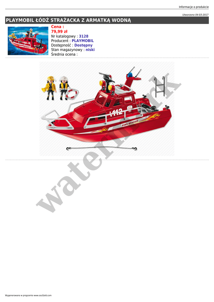 Informacje o produkcie Utworzono 04-03-2017 PLAYMOBIL ŁÓDŹ STRAŻACKA Z ARMATKĄ WODNĄ Cena : 79,99 zł w at er m ar k Nr katalogowy : 3128 Producent : PLAYMOBIL Dostępność : Dostępny Stan magazynowy : niski Średnia ocena : Wygenerowano w programie www.oscGold.com