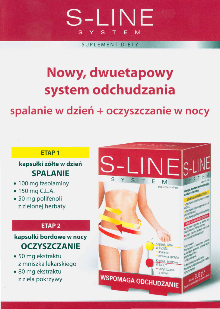 Nowy, dwuetapowy system odchudzania spalanie w dzień + oczyszczanie w nocy kapsułki żółte w dzień SPALANIE • 100 mg fasolaminy • 150 mg eL.A. • 50 mg polifenoli z zielonej herbaty ETAP 2 kapsułki bordowe w nocy OCZYSZCZANIE • 50 mg ekstraktu z mniszka lekarskiego • 80 mg ekstraktu z ziela pokrzywy Etap 1 - kapsułki żółte w dzień - SPALANIE Formuła oparta jest na składnikach przyspieszających spalanie tłuszczów i węglowodanów z pożywienia oraz hamujących nadmierny apetyt. Kapsułki żółte należy stosować dwa razy dziennie przed zasadniczymi posiłkami zjadanymi w ciągu dnia, by zaktywizować przebiegające wtedy najintensywniej procesy metaboliczne. Główne kierunki działania kapsułek żółtych: • przyspieszanie spalania tłuszczów z pożywienia (CL.A.) • przyspieszanie spalania węglowodanów z pożywienia (fasolamina) • redukcja apetytu (polifenole z zielonej herbaty) Etap 2 - kapsułki bordowe w nocy - OCZYSZCZANIE Formuła wspomaga organizm w usunięciu nadmiaru nagromadzonej w ciągu dnia wody i szkodli toksyn. Kapsułki bordowe należy stosować prze jest najlepszą porą na oczyszczanie o tabolitów (mogących hamować proces oachudzania) i usuwanie wody, której nadmiar w tkankach prowadzi do problemów z cellulitem. Główne kierunki działania kapsułek bordowych: • oczyszczanie organizmu ze zbędnej wody i toksyn (ekstrakty z mniszka i pokrzywy) • regulacja procesów przemiany materii (witaminy i minerały z ekstraktu pokrzywy)