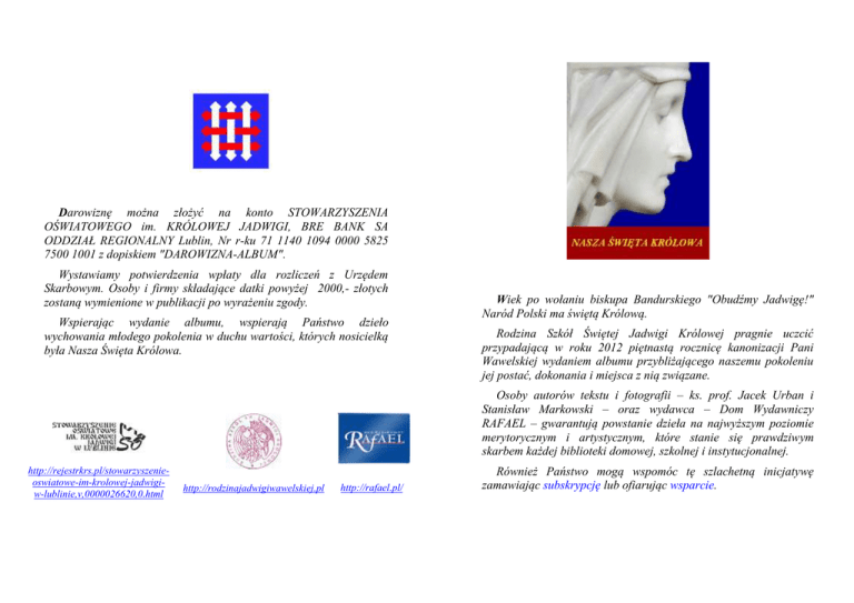 Darowiznę można złożyć na konto STOWARZYSZENIA OŚWIATOWEGO im. KRÓLOWEJ JADWIGI, BRE BANK SA ODDZIAŁ REGIONALNY Lublin, Nr r-ku 71 1140 1094 0000 5825 7500 1001 z dopiskiem "DAROWIZNA-ALBUM". Wystawiamy potwierdzenia wpłaty dla rozliczeń z Urzędem Skarbowym. Osoby i firmy składające datki powyżej 2000,- złotych zostaną wymienione w publikacji po wyrażeniu zgody. Wspierając wydanie albumu, wspierają Państwo dzieło wychowania młodego pokolenia w duchu wartości, których nosicielką była Nasza Święta Królowa. Wiek po wołaniu biskupa Bandurskiego "Obudźmy Jadwigę!" Naród Polski ma świętą Królową. Rodzina Szkół Świętej Jadwigi Królowej pragnie uczcić przypadającą w roku 2012 piętnastą rocznicę kanonizacji Pani Wawelskiej wydaniem albumu przybliżającego naszemu pokoleniu jej postać, dokonania i miejsca z nią związane. Osoby autorów tekstu i fotografii – ks. prof. Jacek Urban i Stanisław Markowski – oraz wydawca – Dom Wydawniczy RAFAEL – gwarantują powstanie dzieła na najwyższym poziomie merytorycznym i artystycznym, które stanie się prawdziwym skarbem każdej biblioteki domowej, szkolnej i instytucjonalnej. http://rejestrkrs.pl/stowarzyszenieoswiatowe-im-krolowej-jadwigiw-lublinie,v,0000026620,0.html http://rodzinajadwigiwawelskiej.pl http://rafael.pl/ Również Państwo mogą wspomóc tę szlachetną inicjatywę zamawiając subskrypcję lub ofiarując wsparcie. Album zawiera bogato ilustrowane itinerarium świętej Jadwigi – króla Polski, połączone z ukazaniem aktualności przesłania zawartego w jej życiu dla współczesnego człowieka i wyeksponowaniem tajemniczego, historycznego związku łączącego Panią Wawelską z papieżem-Polakiem – Janem Pawłem II. Niezwykłej urody fotografie miejsc – Budapesztu, Biecza, Krakowa, Lwowa, Pragi, Sandomierza, Wilna i innych miast – oraz przedmiotów związanych z Królową, która "rozeznała zamysł Boży nie tylko w stosunku do swego własnego powołania, ale także w stosunku do powołania narodów", pozwalają Czytelnikowi głębiej zrozumieć, że "Jadwiga jest w sercu Polski. A Polska na każdym etapie swoich dziejów musi stwierdzać, że była i jest sobą w znacznej mierze przez Jadwigę". Skłaniają jednocześnie do refleksji nad losami zapoczątkowanego przez nią dzieła unii wiążącej Polskę, Litwę i Ruś, oraz inspirują w kontekście odpowiedzialności za to trudne dziedzictwo do myślenia nad miejscem i rolą Polski w Unii Europejskiej i dzisiejszym świecie. Pieczołowite opracowanie grafiki, doskonała jakość druku i najwyższej jakości papier świadczą nie tylko o niezrównanym profesjonalizmie wydawców, ale i o ich serdecznej trosce o przekazywane duchowe bogactwo. Sprawiają, że będziemy sięgać po album chętnie, często i z przyjemnością. Album można zamawiać poprzez wpłatę na konto STOWARZYSZENIA OŚWIATOWEGO im. KRÓLOWEJ JADWIGI, BRE BANK SA ODDZIAŁ REGIONALNY Lublin, Nr r-ku 71 1140 1094 0000 5825 7500 1001 z dopiskiem "SUBSKRYPCJA-ALBUM". Spodziewana cena jednego egzemplarza wyniesie 60 złotych. Przy wpłacie należy podać imię, nazwisko, dokładny adres oraz ilość egzemplarzy, a także zaznaczyć formę odbioru. Więcej informacji o albumie można uzyskać w Domu Wydawniczym „RAFAEL”. Informacja o Stowarzyszeniu Oświatowym im. Królowej Jadwigi jest dostępna na stronie http://rejestrkrs.pl/stowarzyszenie-oswiatowe-imkrolowej-jadwigi-w-lublinie,v,0000026620,0.html Zamawiając album wspomagają Państwo działalność Rodziny Szkół Świętej Jadwigi Królowej. http://rafael.pl/ http://rodzinajadwigiwawelskiej.pl http://rejestrkrs.pl/stowarzyszenieoswiatowe-im-krolowej-jadwigiw-lublinie,v,0000026620,0.html