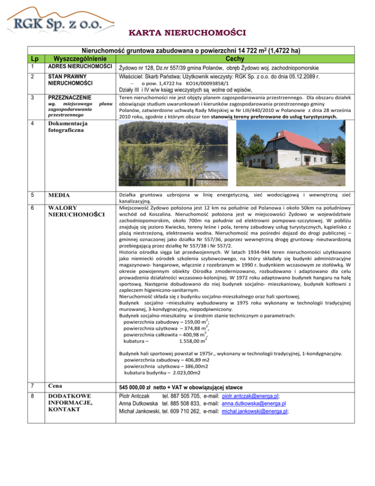 KARTA NIERUCHOMOŚCI Lp Nieruchomość gruntowa zabudowana o powierzchni 14 722 m2 (1,4722 ha) Wyszczególnienie Cechy 1 ADRES NIERUCHOMOŚCI 2 STAN PRAWNY NIERUCHOMOŚCI 3 o pow. 1,4722 ha KO1K/00093858/1 Działy III i IV w/w ksiąg wieczystych są wolne od wpisów, PRZEZNACZENIE wg. miejscowego zagospodarowania przestrzennego Żydowo nr 128, Dz.nr 557/39 gmina Polanów, obręb Żydowo woj. zachodniopomorskie Właściciel: Skarb Państwa; Użytkownik wieczysty: RGK Sp. z o.o. do dnia 05.12.2089 r. planu 4 Dokumentacja fotograficzna 5 MEDIA 6 WALORY NIERUCHOMOŚCI Teren nieruchomości nie jest objęty planem zagospodarowania przestrzennego. Dla obszaru działek obowiązuje studium uwarunkowań i kierunków zagospodarowania przestrzennego gminy Polanów, zatwierdzone uchwałą Rady Miejskiej w Nr LIII/440/2010 w Polanowie z dnia 28 września 2010 roku, zgodnie z którym obszar ten stanowią tereny preferowane do usług turystycznych. Działka gruntowa uzbrojona w linię energetyczną, sieć wodociągową i wewnętrzną sieć kanalizacyjną. Miejscowość Żydowo położona jest 12 km na południe od Polanowa i około 50km na południowy wschód od Koszalina. Nieruchomość położona jest w miejscowości Żydowo w województwie zachodniopomorskim, około 700m na południe od elektrowni pompowo-szczytowej. W pobliżu znajduję się jezioro Kwiecko, tereny leśne i pola, tereny zabudowy usług turystycznych, kąpielisko z plażą niestrzeżoną, elektrownia wodna. Nieruchomość ma pośredni dojazd do drogi publicznej – gminnej oznaczonej jako działka Nr 557/36, poprzez wewnętrzną drogę gruntową- nieutwardzoną przebiegającą przez działkę Nr 557/38 i Nr 557/2. Historia ośrodka sięga lat przedwojennych. W latach 1934-944 teren nieruchomości użytkowano jako niemiecki ośrodek szkolenia szybowcowego, na który składały się budynki administracyjne magazynowo- hangarowe, włącznie z rozebranym w 1990 r. budynkiem wczasowym ze stołówką. W okresie powojennym obiekty Ośrodka zmodernizowano, rozbudowano i adaptowano dla celu prowadzenia działalności wczasowo-kolonijnej. W 1972 roku adaptowano budynek hangaru na halę sportową. Następnie dobudowano do niej budynek socjalno- mieszkaniowy, budynek kotłowni z zapleczem higieniczno-sanitarnym. Nieruchomość składa się z budynku socjalno-mieszkalnego oraz hali sportowej. Budynek socjalno –mieszkalny wybudowany w 1975 roku wykonany w technologii tradycyjnej murowanej, 3-kondygnacyjny, niepodpiwniczony. Budynek socjalno-mieszkalny w średnim stanie technicznym o parametrach: 2 powierzchnia zabudowy – 159,00 m ; 2 powierzchnia użytkowa – 374,88 m , 2 powierzchnia całkowita – 400,98 m , 2 kubatura – 1.558,00 m Budynek hali sportowej powstał w 1975r., wykonany w technologii tradycyjnej, 1-kondygnacyjny. powierzchnia zabudowy – 406,89 m2 powierzchnia użytkowa – 386,00m2 kubatura budynku – 2.023,00m2 7 Cena 8 DODATKOWE INFORMACJE, KONTAKT 545 000,00 zł netto + VAT w obowiązującej stawce Piotr Antczak tel. 887 505 705, e-mail: [email protected]; Anna Dutkowska tel. 885 508 833, e-mail: [email protected] Michał Jankowski, tel. 609 710 262, e-mail: [email protected];
