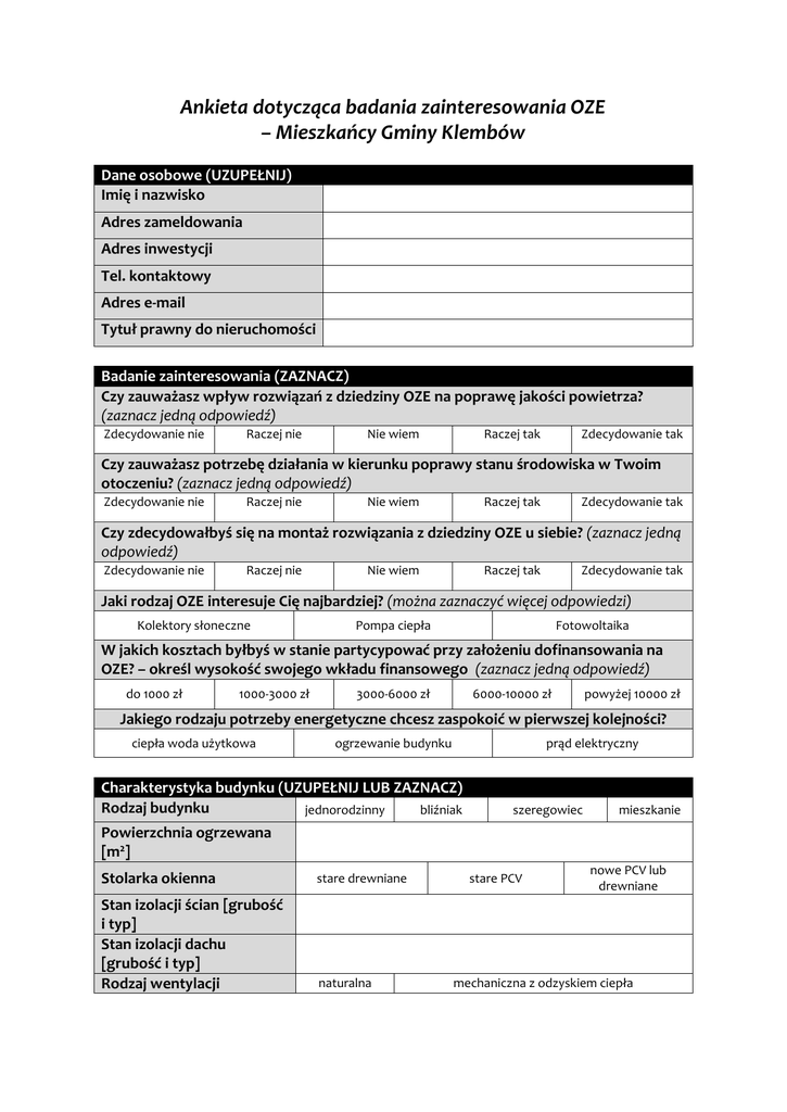 Ankieta dotycząca badania zainteresowania OZE – Mieszkańcy Gminy Klembów Dane osobowe (UZUPEŁNIJ) Imię i nazwisko Adres zameldowania Adres inwestycji Tel. kontaktowy Adres e-mail Tytuł prawny do nieruchomości Badanie zainteresowania (ZAZNACZ) Czy zauważasz wpływ rozwiązań z dziedziny OZE na poprawę jakości powietrza? (zaznacz jedną odpowiedź) Zdecydowanie nie Raczej nie Nie wiem Raczej tak Zdecydowanie tak Czy zauważasz potrzebę działania w kierunku poprawy stanu środowiska w Twoim otoczeniu? (zaznacz jedną odpowiedź) Zdecydowanie nie Raczej nie Nie wiem Raczej tak Zdecydowanie tak Czy zdecydowałbyś się na montaż rozwiązania z dziedziny OZE u siebie? (zaznacz jedną odpowiedź) Zdecydowanie nie Raczej nie Nie wiem Raczej tak Zdecydowanie tak Jaki rodzaj OZE interesuje Cię najbardziej? (można zaznaczyć więcej odpowiedzi) Kolektory słoneczne Pompa ciepła Fotowoltaika W jakich kosztach byłbyś w stanie partycypować przy założeniu dofinansowania na OZE? – określ wysokość swojego wkładu finansowego (zaznacz jedną odpowiedź) do 1000 zł 1000-3000 zł 3000-6000 zł 6000-10000 zł powyżej 10000 zł Jakiego rodzaju potrzeby energetyczne chcesz zaspokoić w pierwszej kolejności? ciepła woda użytkowa ogrzewanie budynku prąd elektryczny Charakterystyka budynku (UZUPEŁNIJ LUB ZAZNACZ) Rodzaj budynku jednorodzinny bliźniak szeregowiec mieszkanie Powierzchnia ogrzewana [m2] Stolarka okienna stare drewniane Stan izolacji ścian [grubość i typ] Stan izolacji dachu [grubość i typ] Rodzaj wentylacji naturalna stare PCV nowe PCV lub drewniane mechaniczna z odzyskiem ciepła Dotychczasowy sposób przygotowania ciepłej wody użytkowej Dotychczasowy sposób ogrzewania budynku Typ pokrycia dachowego Nachylenie dachu (w stopniach) Dostępna powierzchnia na gruncie lub dachu kocioł stałopalny kocioł gazowy kocioł olejowy elektryczne kocioł stałopalny kocioł gazowy kocioł olejowy elektryczne dachówka blacha gont papa Informacje dodatkowe (UZUPEŁNIJ LUB ZAZNACZ) TAK Dostęp do internetu Ilość osób stale użytkujących budynek Zużycie energii elektrycznej za rok ubiegły [kWh] Zużycie wody za rok ubiegły [m3] Rodzaj i zużycie opału w roku ubiegłym [t lub m3 lub kWh] NIE Zgodnie z Ustawą z dnia 29. 08. 1997 roku o ochronie danych osobowych (tekst jednolity: Dz. U. z 2002 r. Nr 101, poz. 926 ze zm.) oświadczam, że: • wyrażam zgodę na przetwarzanie moich danych osobowych, do celów związanych z uruchomieniem oraz realizacją projektu współfinansowanego ze środków Regionalnego Programu Operacyjnego Województwa Mazowieckiego na lata 2014-2020, działanie 4.1 „Odnawialne źródła energii - typ projektów „Infrastruktura do produkcji i dystrybucji energii ze źródeł odnawialnych” w zakresie czynności dotyczących budowy mikroinstalacji prosumenckich wykorzystujących odnawialne źródła energii w zakresie związanym ze wszystkimi czynnościami, operacjami i pracami niezbędnymi do przygotowania, uruchomienia, wdrożenia, realizacji i rozliczenia projektu, • jestem świadomy/a przysługującego mi prawa uaktualniania, uzupełniania, usunięcia danych ze zbioru oraz możliwości wglądu do nich. Oświadczam ponadto, że moje dane osobowe udostępniam dobrowolnie. ……………………………………… miejscowość i data ……………………………………… czytelny podpis