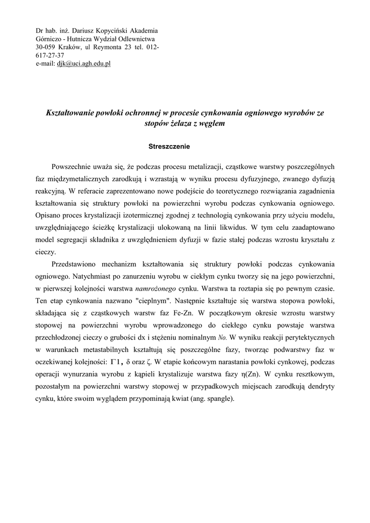 Dr hab. inŜ. Dariusz Kopyciński Akademia Górniczo - Hutnicza Wydział Odlewnictwa 30-059 Kraków, ul Reymonta 23 tel. 012617-27-37 e-mail: [email protected] Kształtowanie powłoki ochronnej w procesie cynkowania ogniowego wyrobów ze stopów Ŝelaza z węglem Streszczenie Powszechnie uwaŜa się, Ŝe podczas procesu metalizacji, cząstkowe warstwy poszczególnych faz międzymetalicznych zarodkują i wzrastają w wyniku procesu dyfuzyjnego, zwanego dyfuzją reakcyjną. W referacie zaprezentowano nowe podejście do teoretycznego rozwiązania zagadnienia kształtowania się struktury powłoki na powierzchni wyrobu podczas cynkowania ogniowego. Opisano proces krystalizacji izotermicznej zgodnej z technologią cynkowania przy uŜyciu modelu, uwzględniającego ścieŜkę krystalizacji ulokowaną na linii likwidus. W tym celu zaadaptowano model segregacji składnika z uwzględnieniem dyfuzji w fazie stałej podczas wzrostu kryształu z cieczy. Przedstawiono mechanizm kształtowania się struktury powłoki podczas cynkowania ogniowego. Natychmiast po zanurzeniu wyrobu w ciekłym cynku tworzy się na jego powierzchni, w pierwszej kolejności warstwa namroŜonego cynku. Warstwa ta roztapia się po pewnym czasie. Ten etap cynkowania nazwano "cieplnym". Następnie kształtuje się warstwa stopowa powłoki, składająca się z cząstkowych warstw faz Fe-Zn. W początkowym okresie wzrostu warstwy stopowej na powierzchni wyrobu wprowadzonego do ciekłego cynku powstaje warstwa przechłodzonej cieczy o grubości dx i stęŜeniu nominalnym No. W wyniku reakcji perytektycznych w warunkach metastabilnych kształtują się poszczególne fazy, tworząc podwarstwy faz w oczekiwanej kolejności: Γ1, δ oraz ζ. W etapie końcowym narastania powłoki cynkowej, podczas operacji wynurzania wyrobu z kąpieli krystalizuje warstwa fazy η(Zn). W cynku resztkowym, pozostałym na powierzchni warstwy stopowej w przypadkowych miejscach zarodkują dendryty cynku, które swoim wyglądem przypominają kwiat (ang. spangle). W referacie wykazano ponadto, Ŝe skład chemiczny podłoŜa istotnie wpływa na kinetykę wzrostu i budowę warstwy Fe-Zn. Ocenę powyŜszego wpływu przeprowadzono przy wykorzystaniu równowaŜnika krzemu E = Si+2SP. Sterowanie strukturą powłoki cynkowej na wyrobach o niekorzystnym współczynniku E stanowi interesujące zagadnienie, które wymaga prostego i praktycznego rozwiązania. Dlatego teŜ w referacie podjęto próbę wyjaśnienia mechanizmu wzrostu powłoki na wyrobach z róŜnych gatunków stali oraz z Ŝeliwa sferoidalnego (charakteryzujących się duŜą wartością równowaŜnika krzemu E). TakŜe wskazano moŜliwości sterowania budową powłoki cynkowej przez prostą zmianę składu chemicznego kąpieli cynkowej lub jej temperatury oraz na duŜy wpływ zabiegu topnikowania w technologii cynkowania ogniowego. Wykazano to w opracowaniu teoretycznym. W modelu własnym ujęto wpływ zabiegu topnikowania na sekwencję wzrostu podwarstw faz z układu równowagi fazowej stopów Fe-Zn. MoŜe to sugerować, Ŝe modyfikacja zabiegu pokrywania powierzchni wyrobu roztworem soli topnika jest najprostszą metodą Gak dotąd niedocenianą) sterowania grubością powłoki, która jest w prostej zaleŜności z osiągnięciem korzystnego efektu ekonomicznego w zakładzie cynkowniczym.