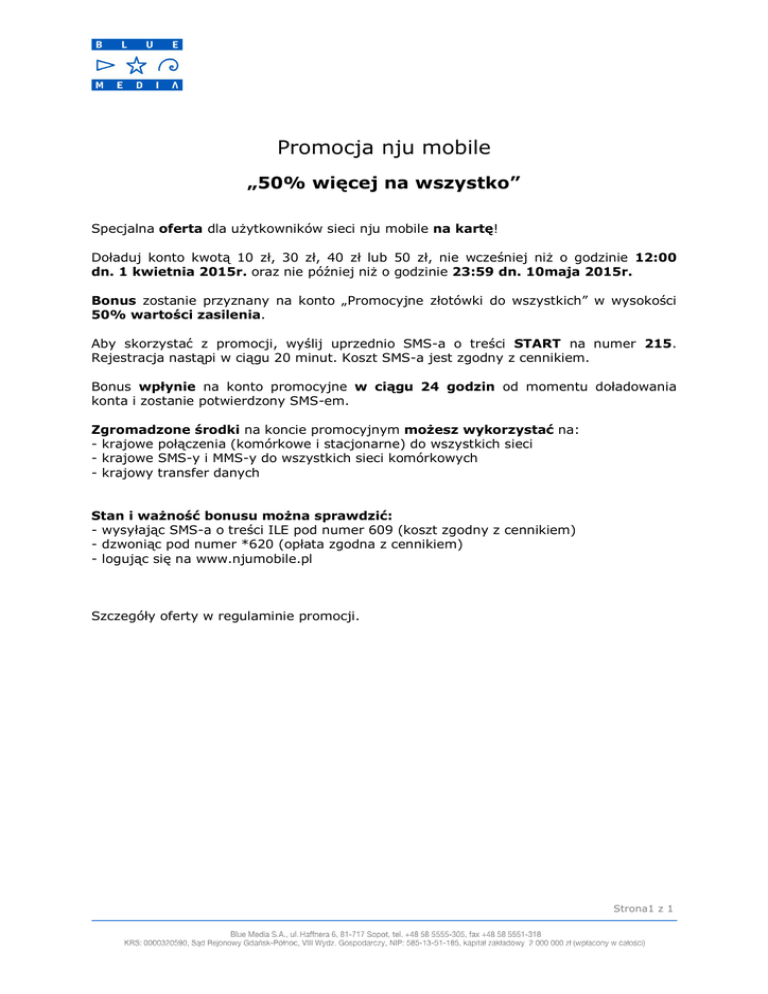 Promocja nju mobile „50% więcej na wszystko” Specjalna oferta dla użytkowników sieci nju mobile na kartę! Doładuj konto kwotą 10 zł, 30 zł, 40 zł lub 50 zł, nie wcześniej niż o godzinie 12:00 dn. 1 kwietnia 2015r. oraz nie później niż o godzinie 23:59 dn. 10maja 2015r. Bonus zostanie przyznany na konto „Promocyjne złotówki do wszystkich” w wysokości 50% wartości zasilenia. Aby skorzystać z promocji, wyślij uprzednio SMS-a o treści START na numer 215. Rejestracja nastąpi w ciągu 20 minut. Koszt SMS-a jest zgodny z cennikiem. Bonus wpłynie na konto promocyjne w ciągu 24 godzin od momentu doładowania konta i zostanie potwierdzony SMS-em. Zgromadzone środki na koncie promocyjnym możesz wykorzystać na: - krajowe połączenia (komórkowe i stacjonarne) do wszystkich sieci - krajowe SMS-y i MMS-y do wszystkich sieci komórkowych - krajowy transfer danych Stan i ważność bonusu można sprawdzić: - wysyłając SMS-a o treści ILE pod numer 609 (koszt zgodny z cennikiem) - dzwoniąc pod numer *620 (opłata zgodna z cennikiem) - logując się na www.njumobile.pl Szczegóły oferty w regulaminie promocji. Strona1 z 1