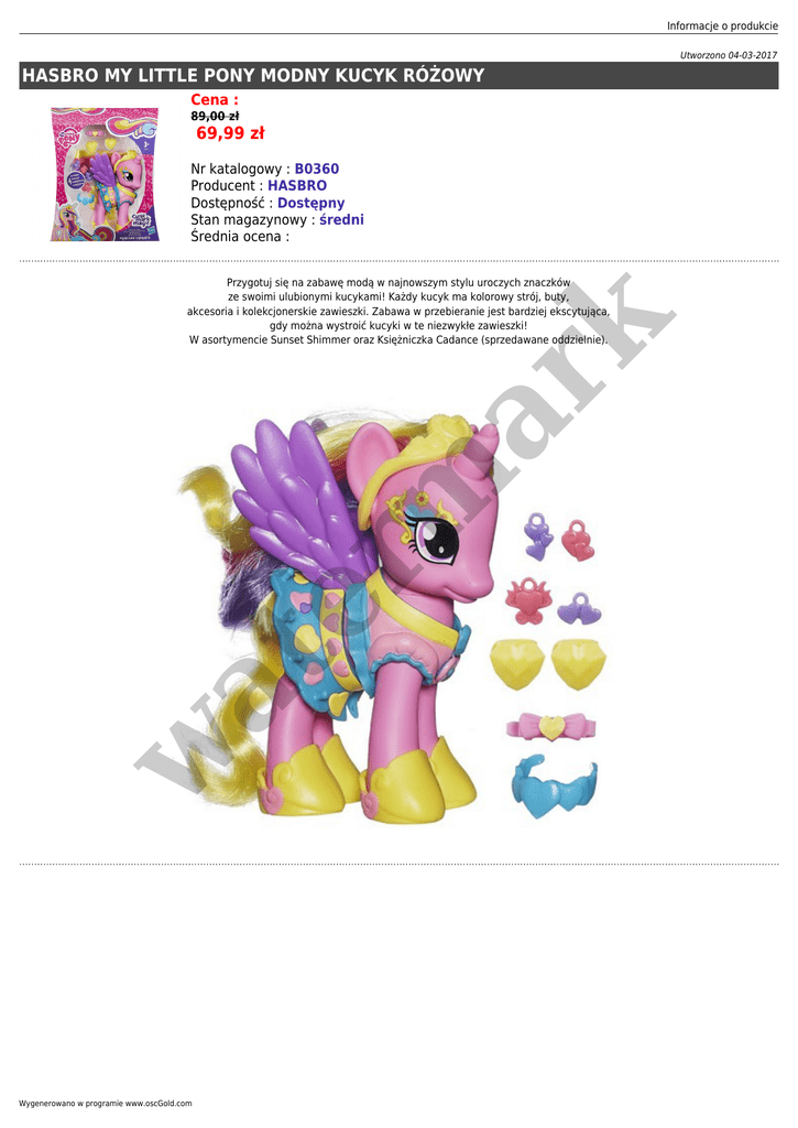 Informacje o produkcie Utworzono 04-03-2017 HASBRO MY LITTLE PONY MODNY KUCYK RÓŻOWY Cena : 89,00 zł 69,99 zł Nr katalogowy : B0360 Producent : HASBRO Dostępność : Dostępny Stan magazynowy : średni Średnia ocena : w at er m ar k Przygotuj się na zabawę modą w najnowszym stylu uroczych znaczków ze swoimi ulubionymi kucykami! Każdy kucyk ma kolorowy strój, buty, akcesoria i kolekcjonerskie zawieszki. Zabawa w przebieranie jest bardziej ekscytująca, gdy można wystroić kucyki w te niezwykłe zawieszki! W asortymencie Sunset Shimmer oraz Księżniczka Cadance (sprzedawane oddzielnie). Wygenerowano w programie www.oscGold.com