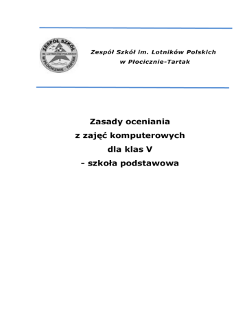 Zespół Szkół im. Lotników Polskich w Płocicznie-Tartak Zasady oceniania z zajęć komputerowych dla klas V - szkoła podstawowa I. Podstawa prawna do opracowania zasad oceniania 1. Rozporządzenie MEN z dnia 30.04.2007 (Dz. U. z 2007 r. Nr 83, poz. 562 z późniejszymi zmianami) w sprawie warunków i sposobu oceniania, klasyfikowania i promowania uczniów i słuchaczy oraz przeprowadzania sprawdzianów i egzaminów w szkołach publicznych. 2. Rozporządzenie MEN z dnia 30. 04. 2013 r. ( Dz. U. 2013 poz. 532) w sprawie zasad udzielania i organizacji pomocy psychologiczno-pedagogicznej w publicznych przedszkolach, szkołach i placówkach. 3. Wewnątrzszkolne Zasady Oceniania 4. Podstawa Programowa. II. Szczegółowe cele zasad oceniania 1. Rozpoznanie przez nauczyciela poziomu i postępów w opanowaniu przez ucznia wiadomości i umiejętności w stosunku do wymagań programowych. 2. Wspieranie rozwoju ucznia przez diagnozowanie jego osiągnięć w odniesieniu do wymagań edukacyjnych przewidzianych w programie nauczania. 3. Informowanie ucznia o poziomie jego osiągnięć edukacyjnych i zachowaniu oraz postępach w tym zakresie. 4. Pomoc uczniowi w samodzielnym planowaniu swojego rozwoju. 5. Motywowanie ucznia do dalszej, systematycznej pracy i postępów w nauce. 6. Dostarczenie rodzicom i nauczycielom informacji o postępach, trudnościach w nauce i specjalnych uzdolnieniach ucznia. 7. Wykorzystywanie osiągnięć uczniów do planowania pracy dydaktycznej nauczyciela. III. Formy aktywności uczniów, które podlegają ocenie 1. Aktywność na lekcji. 2. Prace pisemne między innymi: kartkówki, sprawdziany, prace klasowe. 3. Odpowiedzi ustne. 4. Prace domowe. 5. Udział w konkursach. 6. Projekty grupowe. 7. Ćwiczenia praktyczne IV. Sprawdzanie osiągnięć uczniów 1. Prace klasowe 1) Praca klasowa przeprowadzana jest po zakończeniu działu i jest dla ucznia obowiązkowa; 2) Każda praca klasowa poprzedzona jest zapowiedzią ustną na tydzień przed i udokumentowanym wpisem w dzienniku; 3) Czas trwania pracy klasowej – jedna godzina lekcyjna; 4) Ocenę niedostateczną z pracy klasowej uczeń może poprawić pisemnie w terminie do 14 dni; 5) Każdą pracę klasową można poprawić tylko raz; 6) Jeżeli uczeń opuścił pracę klasową, jest zobowiązany do napisania jej w terminie do 14 dni od dnia powrotu do szkoły. 2. Sprawdziany 1) Sprawdzian obejmuje mniejszą partię materiału niż dział programowy; 2) Sprawdzian jest poprzedzony zapowiedzią ustną na dwa dni przed jego przeprowadzeniem; 3) Czas trwania sprawdzianu - do 30 minut; 3. Kartkówki 1) Kartkówki obejmują bieżące i podstawowe wiadomości z max trzech ostatnich lekcji; 2) Czas trwania kartkówek od 10 do 15 minut; 3) Kartkówka może być (ale nie musi być) poprzedzona zapowiedzią ustną. 4. Odpowiedzi ustne 1) Termin odpowiedzi nie jest podawany do wiadomości ucznia; 2) Uczeń ma czas na zastanowienie się, a jego odpowiedź trwa do 15 minut; 3) Dodatkowe pytania naprowadzające mogą skutkować obniżeniem oceny; 4) Ocenie ustnej podlega: - zawartość rzeczowa, czy odpowiedź jest na temat (jasna, konkretna); - w jakim stopniu uczeń potrafi posługiwać się językiem związanym z przedmiotem; - znajomość poznanych reguł i umiejętność ich stosowania. 5. Prace domowe 1) Prace domowe są obowiązkowe, służą utrwaleniu wiedzy i umiejętności ucznia bądź stanowią przygotowanie do nowej lekcji; 2) Dla uczniów zdolnych mogą być zadawane dodatkowe zadania nadobowiązkowe o podwyższonym stopniu trudności, które mają wpływ na wystawienie końcoworocznej oceny. 6. Praca w grupach 1) Uczniowie mogą otrzymać ocenę za efektywną pracę w grupach lub zespołach; 2) Grupa uczniów za wspólnie wykonaną pracę otrzymuje taką samą ocenę; 3) W przypadku niezaangażowania się ucznia w pracę grupy, uczeń otrzymuje ocenę adekwatną do jego wkładu. 7. Konkursy przedmiotowe 1) Za udział w I etapie konkursu przedmiotowego i lokatę w pierwszej trójce, uczeń otrzymuje ocenę cząstkową – celującą; 2) Za zakwalifikowanie się do II etapu konkursu uczeń może otrzymać ocenę cząstkową celującą; 3) Laureat konkursu przedmiotowego o zasięgu wojewódzkim lub ponadwojewódzkim otrzymuje celującą roczną ocenę klasyfikacyjną. 8. W przypadku nieobecności nauczyciela w dniu zapowiedzianego sprawdzianu lub pracy klasowej należy ponownie uzgodnić z klasą termin, przy czym nie obowiązuje jednotygodniowe wyprzedzenie. 9. Sprawdzone, ocenione i opatrzone komentarzem prace pisemne uczniowie otrzymują do wglądu w ciągu dwóch tygodni od daty ich napisania. Termin udostępnienia prac może ulec przesunięciu ze względu na nieobecność nauczyciela, zmianę planu zajęć klasy lub okres ferii szkolnych. 10. Uczeń może przystąpić tylko raz do poprawy/zaliczenia w terminie dwóch tygodni od otrzymania informacji o ustalonej ocenie lub powrotu do szkoły (w szczególnie uzasadnionych przypadkach losowych, wynikających z absencji nauczyciela lub ucznia, termin może ulec zmianie) w dzienniku lekcyjnym obok ustalonej oceny z prac pisemnych wpisuje się ocenę z poprawy, przy czym obie oceny brane są pod uwagę przy ustalaniu oceny śródrocznej i rocznej. 11. Brak pracy domowej, brak zeszytu przedmiotowego lub zeszytu ćwiczeń może być podstawą do ustalenia bieżącej oceny niedostatecznej. 12. Za wykonanie dodatkowych prac nauczyciel może wystawić bieżącą ocenę: celującą, bardzo dobrą lub dobrą, ale nie niższą 13. Uczeń, który podczas prac pisemnych, korzysta ze źródeł nieustalonych przez nauczyciela otrzymuje 0 punktów i traci możliwość poprawy tej pracy. 14. Uczeń ma prawo być nieprzygotowanym do zajęć dwa razy w ciągu semestru: 1) wskutek wypadków losowych; 2) z powodu choroby trwającej dłużej niż 5 dni; 3) po powrocie z sanatorium, szpitala lub uzdrowiska. 15. Używa się umownych symboli, które mają na celu danie szansy na poprawę i uzup
