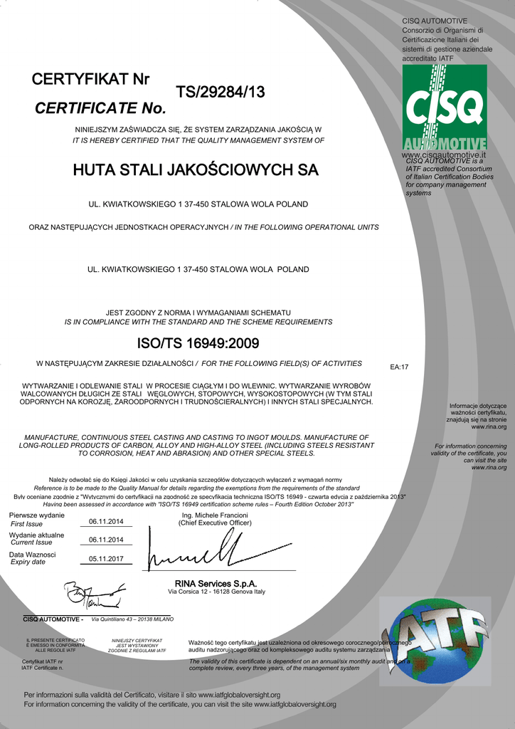certyfikat iso/ts 16949 - Huta Stali Jakościowych SA