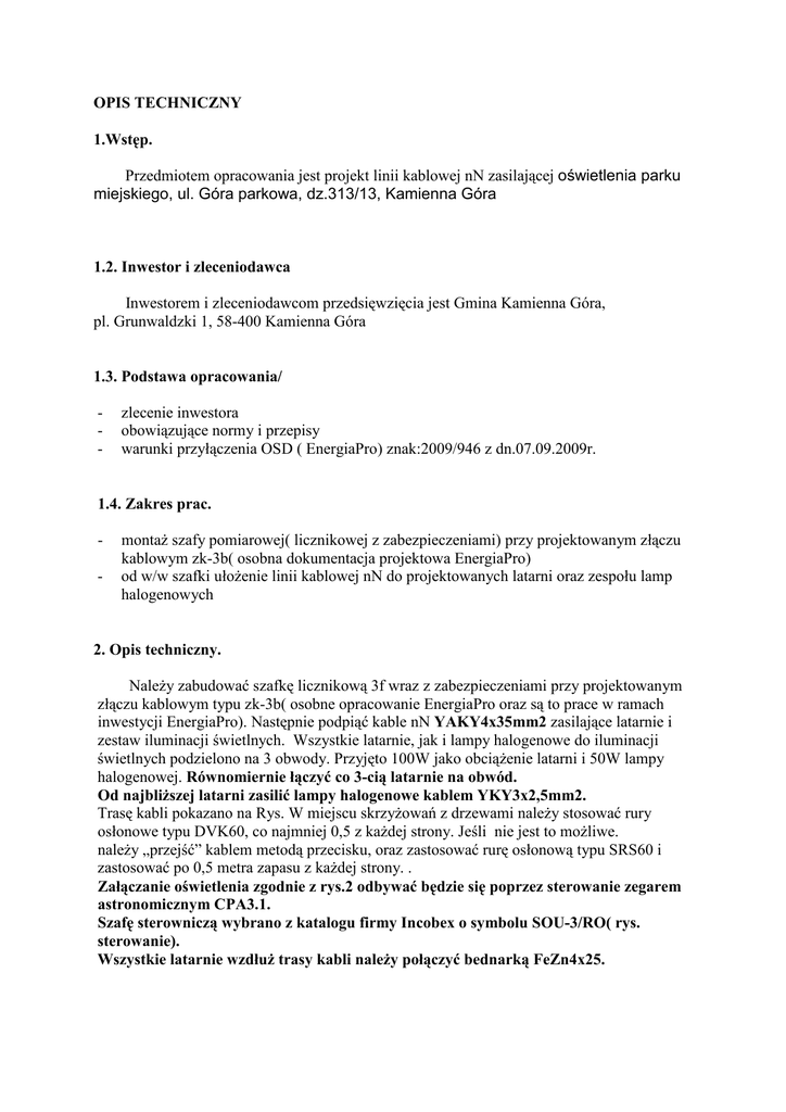 OPIS TECHNICZNY 1.Wstęp. Przedmiotem opracowania jest projekt linii kablowej nN zasilającej oświetlenia parku miejskiego, ul. Góra parkowa, dz.313/13, Kamienna Góra 1.2. Inwestor i zleceniodawca Inwestorem i zleceniodawcom przedsięwzięcia jest Gmina Kamienna Góra, pl. Grunwaldzki 1, 58-400 Kamienna Góra 1.3. Podstawa opracowania/ - zlecenie inwestora obowiązujące normy i przepisy warunki przyłączenia OSD ( EnergiaPro) znak:2009/946 z dn.07.09.2009r. 1.4. Zakres prac. - montaŜ szafy pomiarowej( licznikowej z zabezpieczeniami) przy projektowanym złączu kablowym zk-3b( osobna dokumentacja projektowa EnergiaPro) od w/w szafki ułoŜenie linii kablowej nN do projektowanych latarni oraz zespołu lamp halogenowych 2. Opis techniczny. NaleŜy zabudować szafkę licznikową 3f wraz z zabezpieczeniami przy projektowanym złączu kablowym typu zk-3b( osobne opracowanie EnergiaPro oraz są to prace w ramach inwestycji EnergiaPro). Następnie podpiąć kable nN YAKY4x35mm2 zasilające latarnie i zestaw iluminacji świetlnych. Wszystkie latarnie, jak i lampy halogenowe do iluminacji świetlnych podzielono na 3 obwody. Przyjęto 100W jako obciąŜenie latarni i 50W lampy halogenowej. Równomiernie łączyć co 3-cią latarnie na obwód. Od najbliŜszej latarni zasilić lampy halogenowe kablem YKY3x2,5mm2. Trasę kabli pokazano na Rys. W miejscu skrzyŜowań z drzewami naleŜy stosować rury osłonowe typu DVK60, co najmniej 0,5 z kaŜdej strony. Jeśli nie jest to moŜliwe. naleŜy „przejść” kablem metodą przecisku, oraz zastosować rurę osłonową typu SRS60 i zastosować po 0,5 metra zapasu z kaŜdej strony. . Załączanie oświetlenia zgodnie z rys.2 odbywać będzie się poprzez sterowanie zegarem astronomicznym CPA3.1. Szafę sterowniczą wybrano z katalogu firmy Incobex o symbolu SOU-3/RO( rys. sterowanie). Wszystkie latarnie wzdłuŜ trasy kabli naleŜy połączyć bednarką FeZn4x25. Projektowane kable naleŜy ułoŜyć zgodnie z normą SEP-E-004”Elektroenergetyczne i sygnalizacyjne linie kablowe. Projektowanie i budowa”. Kabel układać w ziemi na głębokości 0,7m na warstwie piasku o grubości 10cm. UłoŜony kabel zasypać warstwą piasku o grubości 10cm. Trasę kabla oznakować folią kalandrową koloru niebieskiego układana w połowie głębokości zakopania kabla. Przy układaniu kabla w ziemi naleŜy zachować następujące odległości pionowe na skrzyŜowaniu od innych kabli i urządzeń podziemnych: - 15cm od kabli o napięciu znamionowym do 1kV, 15cm od kabli o napięciu znamionowym od 1kV do 30kV, 25cm + średnia rurociągu od rurociągów wodociągowych, ściekowych, cieplnych, gazowych z gazami niepalnymi. Przy układaniu kabla w ziemi naleŜy zachować następujące odległości poziome na skrzyŜowaniu od innych kabli i urządzeń podziemnych: - 5cm od kabli o napięciu znamionowym do 1kV, 25cm od kabli o napięciu znamionowym od 1kV do 30kV, 25cm + średnia rurociągu od rurociągów wodociągowych, ściekowych, cieplnych, gazowych z gazami niepalnymi. 50 cm od ścian budynków i innych budowli Kable naleŜy zabezpieczyć bezpiecznikami 10A, w obudowie RB00 (na zasilaniu o charakterystyce szybkiej, a odejściach obwodów - zwłocznej) Po ułoŜeniu kabla i montaŜu zabezpieczeń naleŜy zmierzyć rezystancję izolacji oraz sprawdzić działanie warunku skuteczności ochrony przeciwporaŜeniowej. Podpięcie kabli w szafie pomiarowo-złączowej musi być pod nadzorem i w uzgodnieniu z EnergiaPro. Na etapie montaŜu uzgodnić z EnergiaPro lokalizację zabezpieczenia głównego RB-00 (lokalizacja przed czy za licznikiem). 2.1. BIOZ Informacja o Bezpieczeństwie i Ochronie zdrowia: niniejsze opracowanie nie planuje przeprowadzenia Ŝadnej z robót wymienionych w art. 21a ust.2 Ustawy z dnia 7 lipca 1994r. Prawo budowlane, co zwalnia przyszłego kierownika budowy z opracowywania takiego planu.